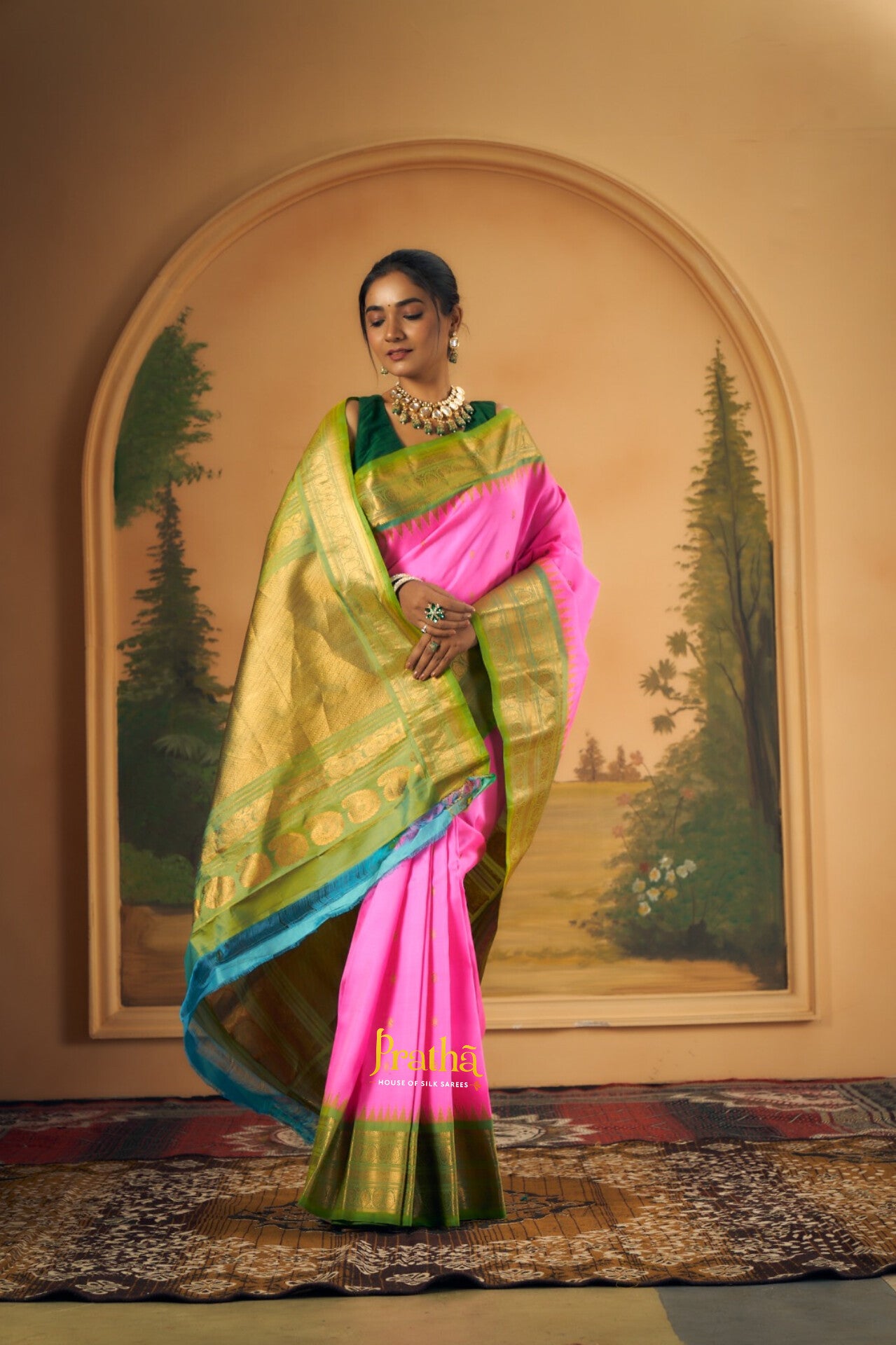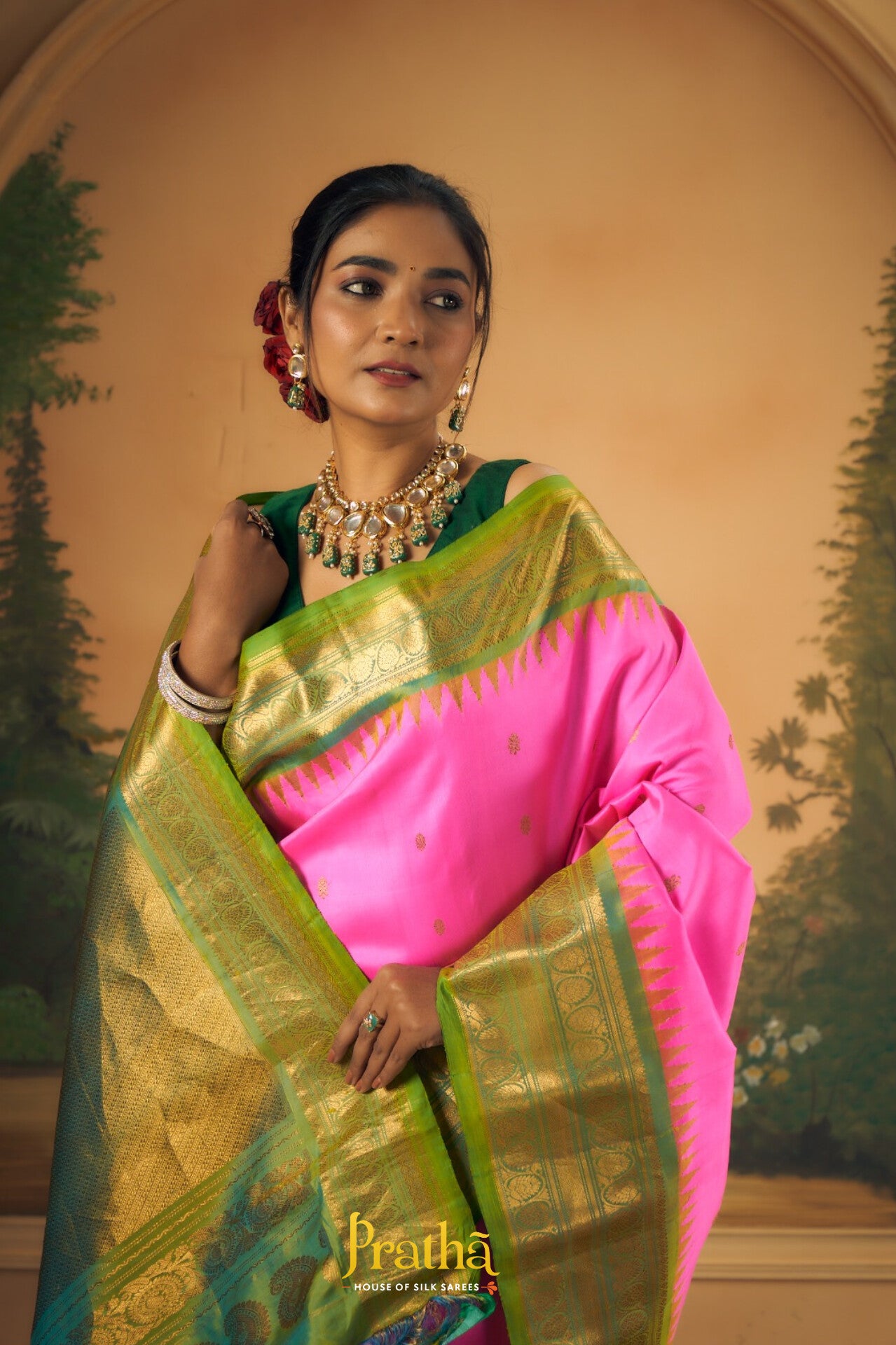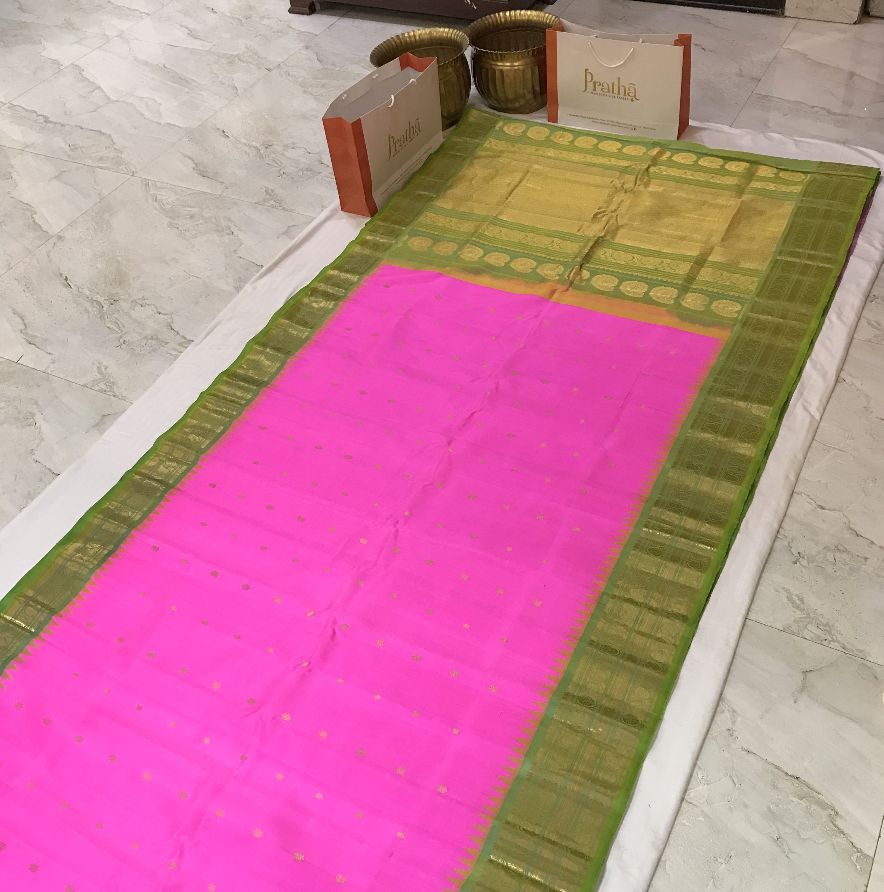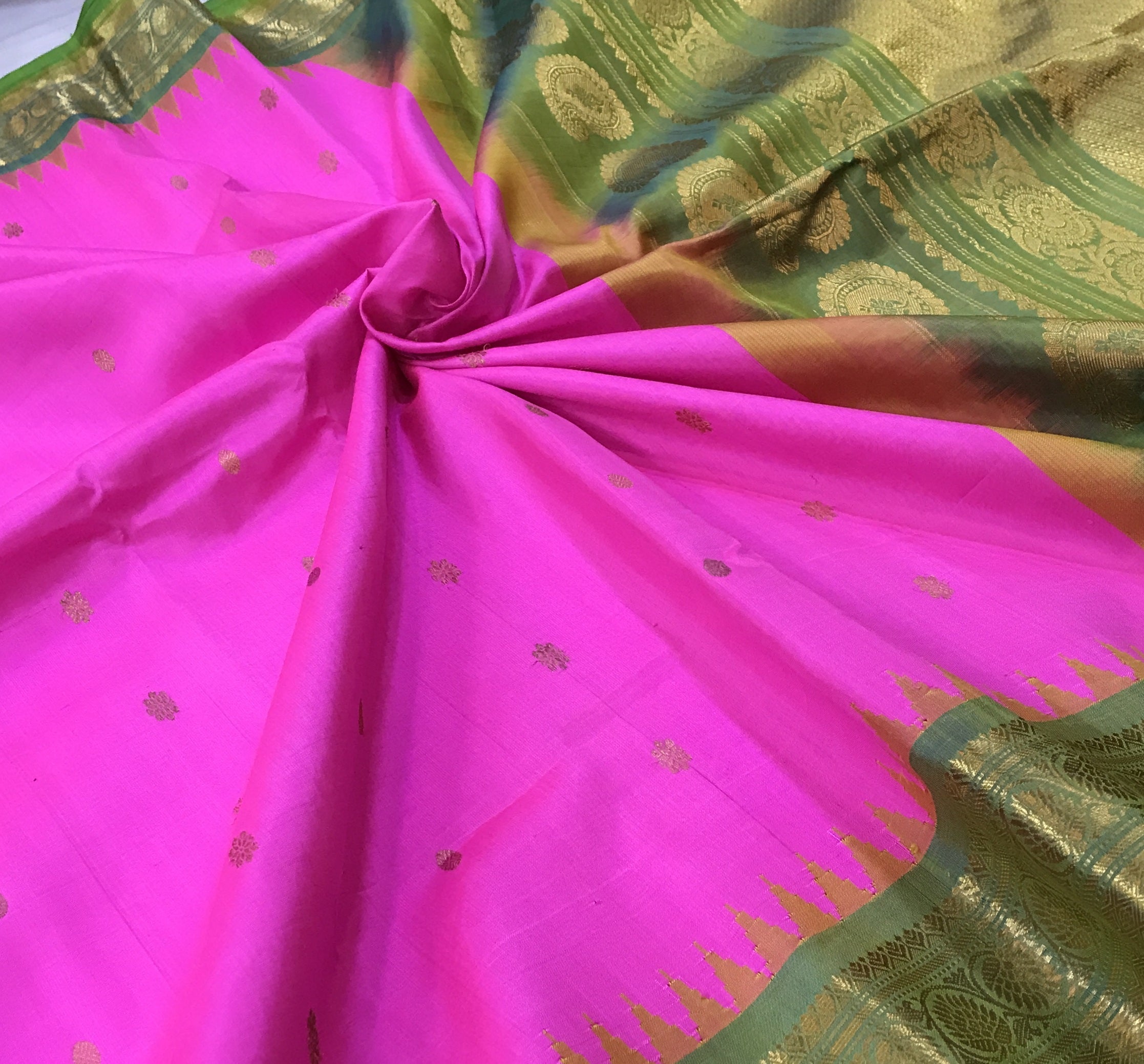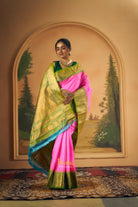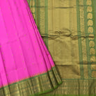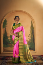 This elegant Bright rani pink Gadwal saree features a striking contrast green border, adding a vibrant touch to its classic appeal. The body is adorned with delicate zari butti, offering a rich and graceful look. A beautifully woven contrast pallu enhances its traditional charm, making it perfect for festive occasions and celebrations
