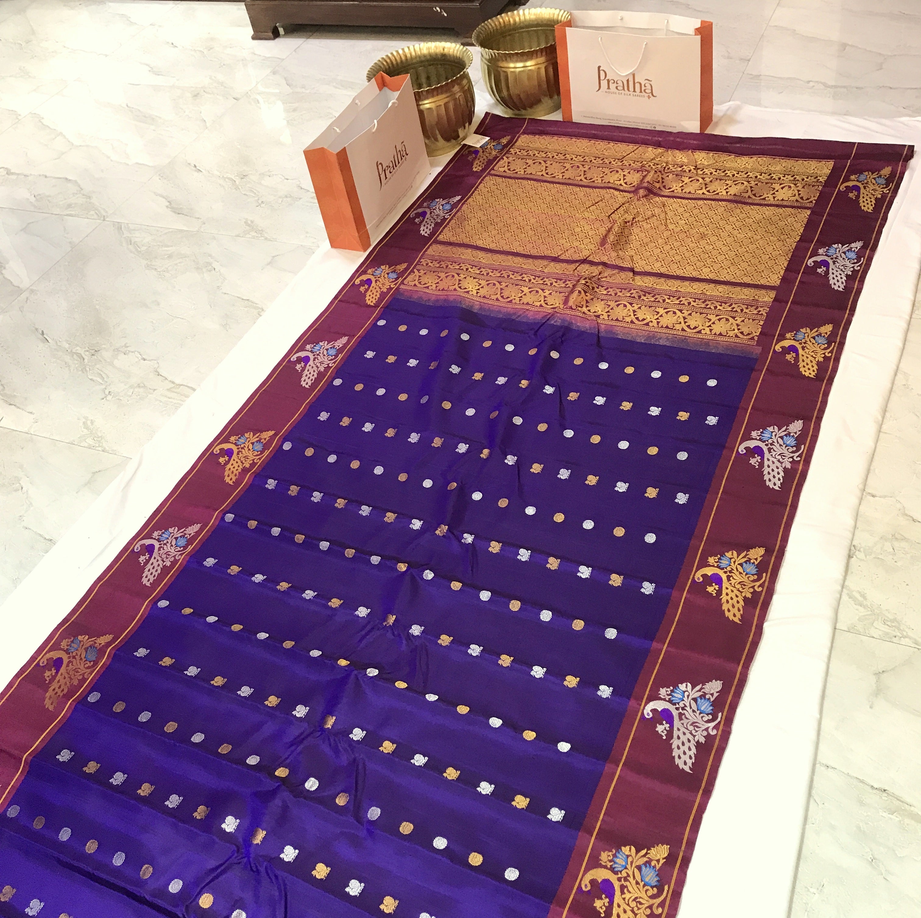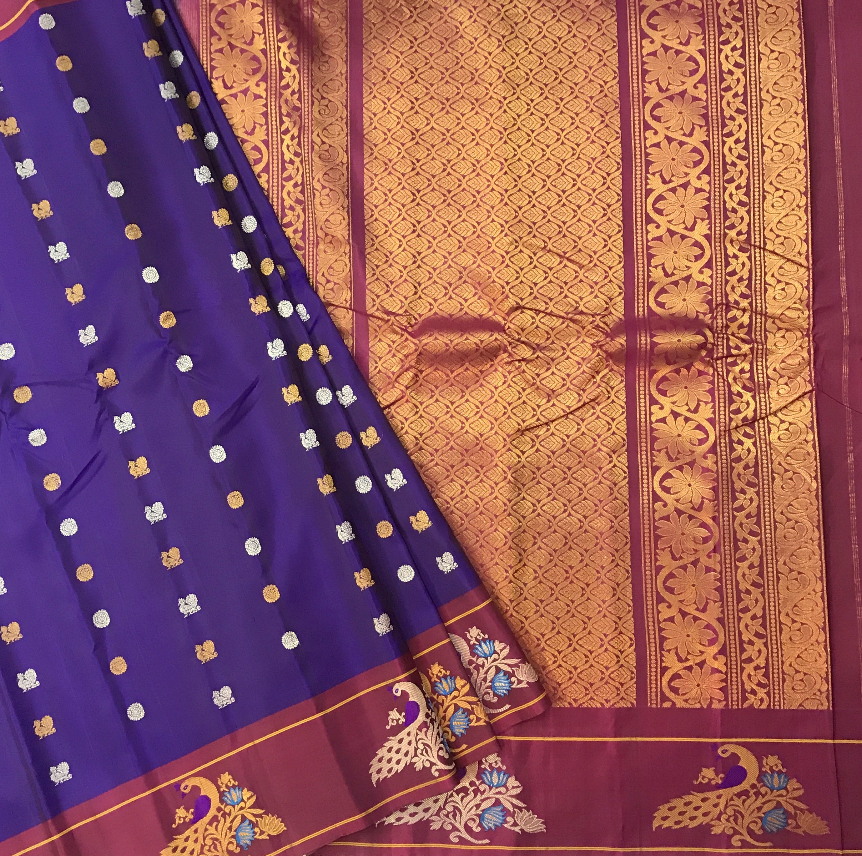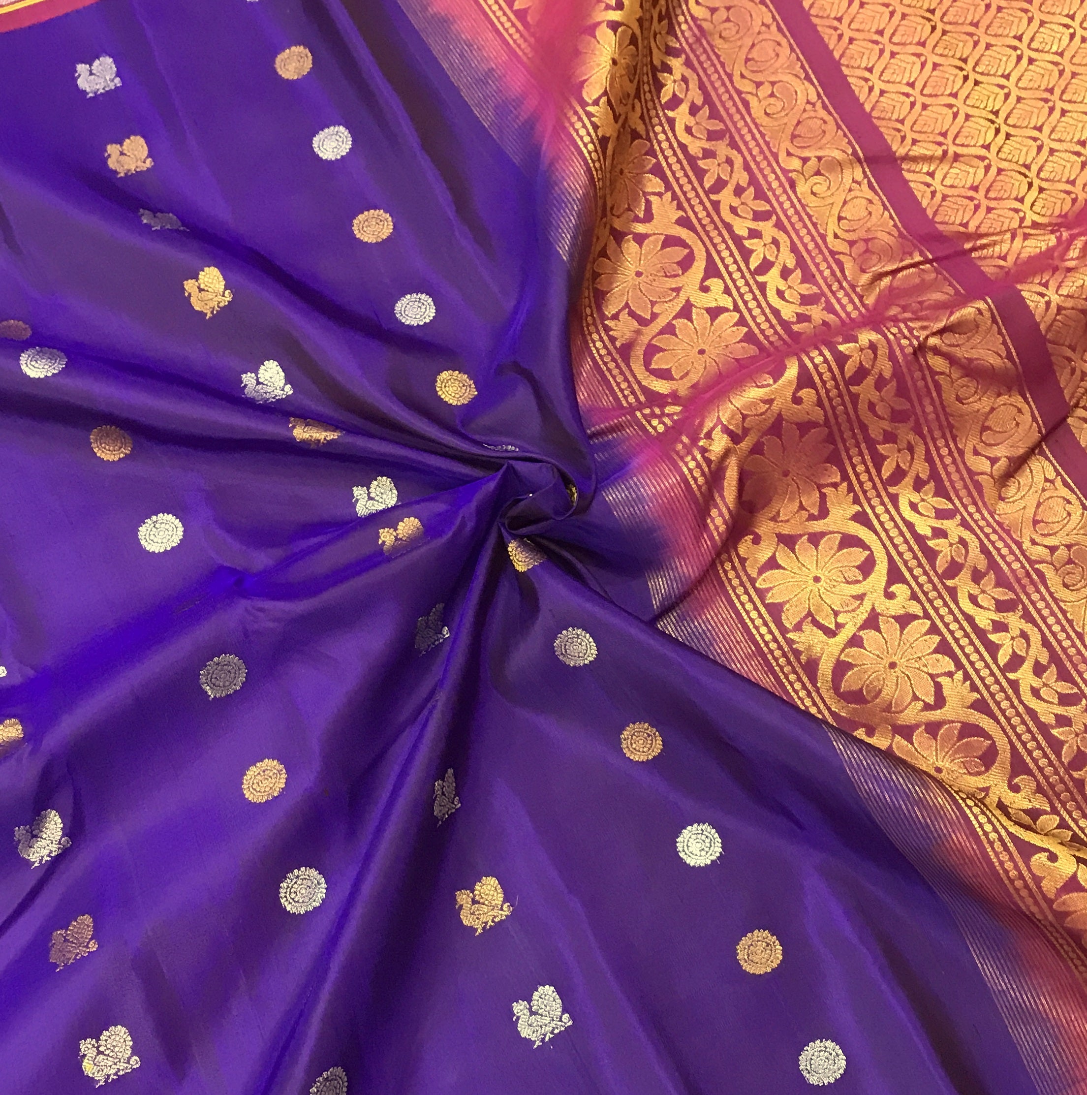 This purplish blue designer border Gadhwal' reflects the weaver's dedication and hard work. The delicate golden, silver peacock butti looks stylish and gives this saree a vibrant and festive vibe The intricates borders, that is, a multicolor designer peacock border with beautiful meenakari, look distinctive and complementing each other. The beautiful shade of grey goes so well with the magenta golden zari pallu!