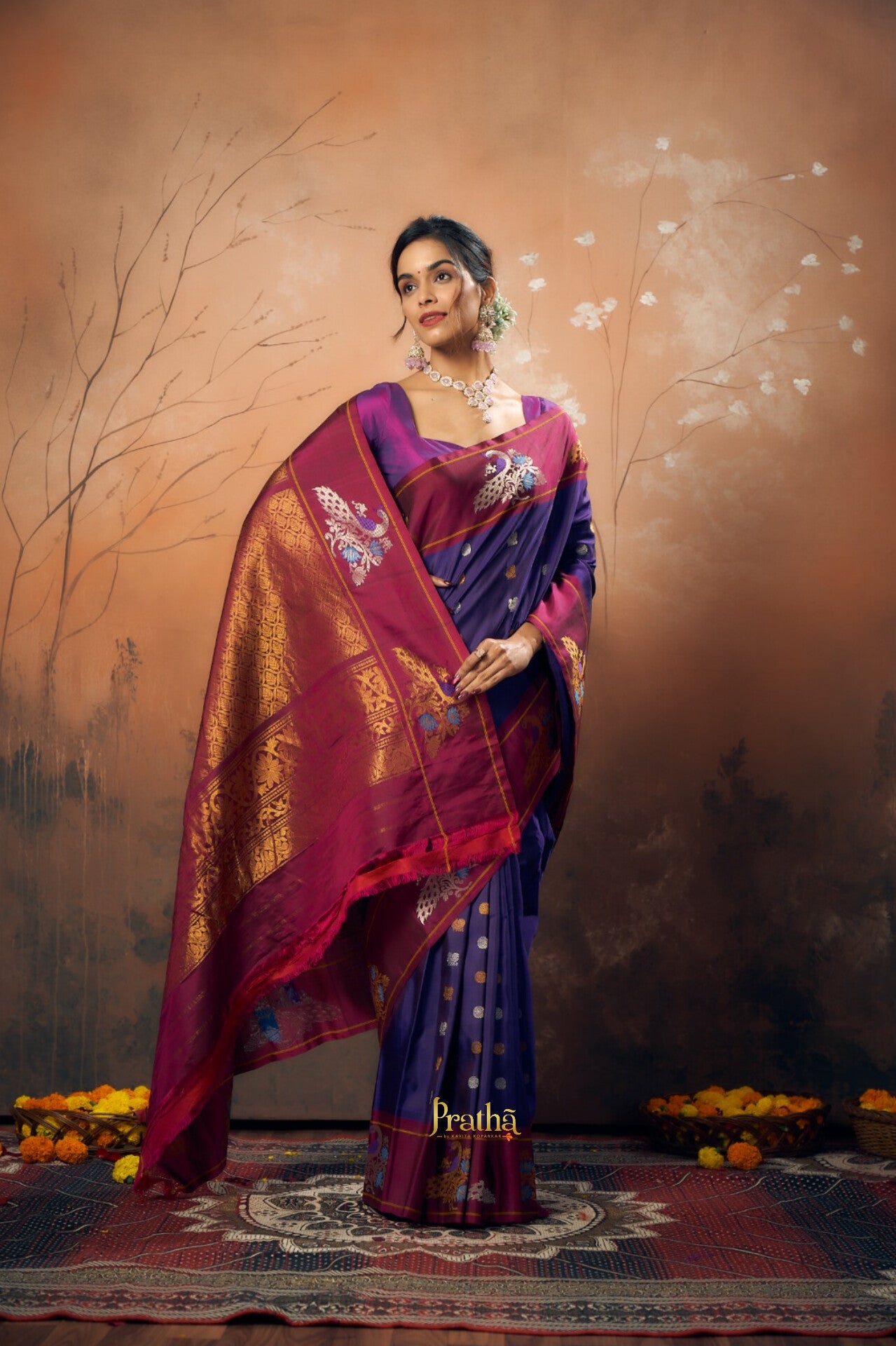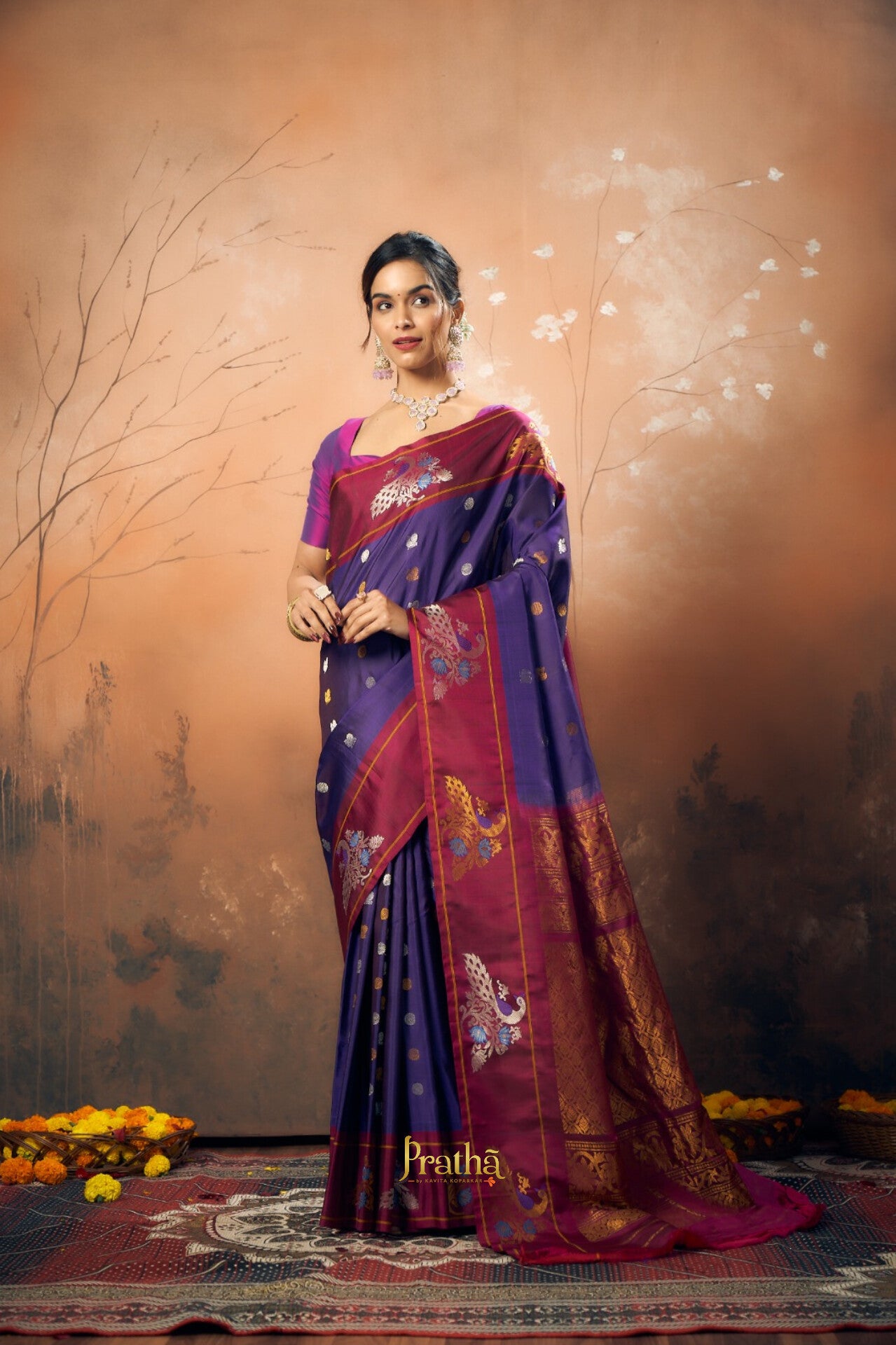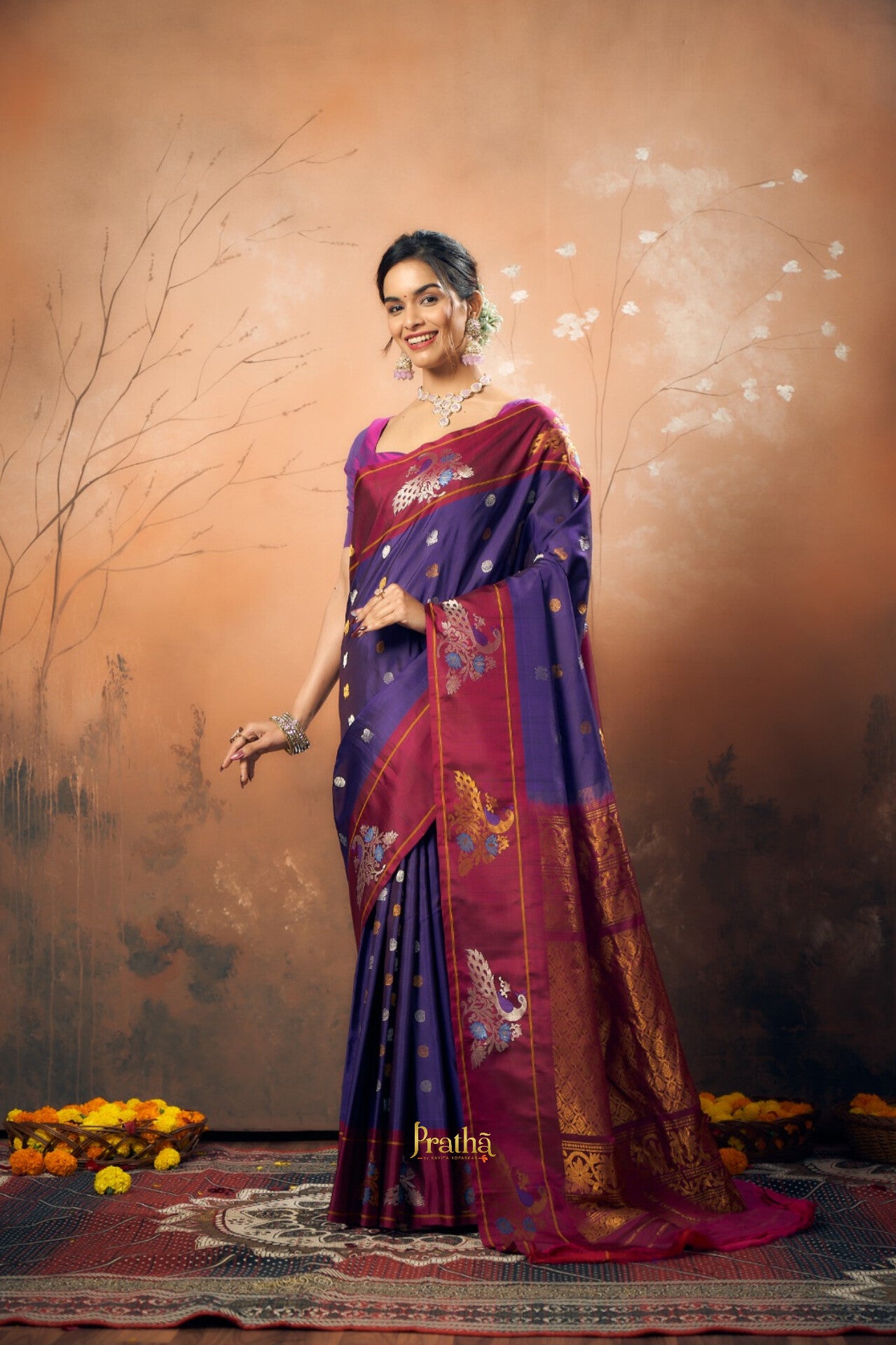 This purplish blue designer border Gadhwal' reflects the weaver's dedication and hard work. The delicate golden, silver peacock butti looks stylish and gives this saree a vibrant and festive vibe The intricates borders, that is, a multicolor designer peacock border with beautiful meenakari, look distinctive and complementing each other. The beautiful shade of grey goes so well with the magenta golden zari pallu!