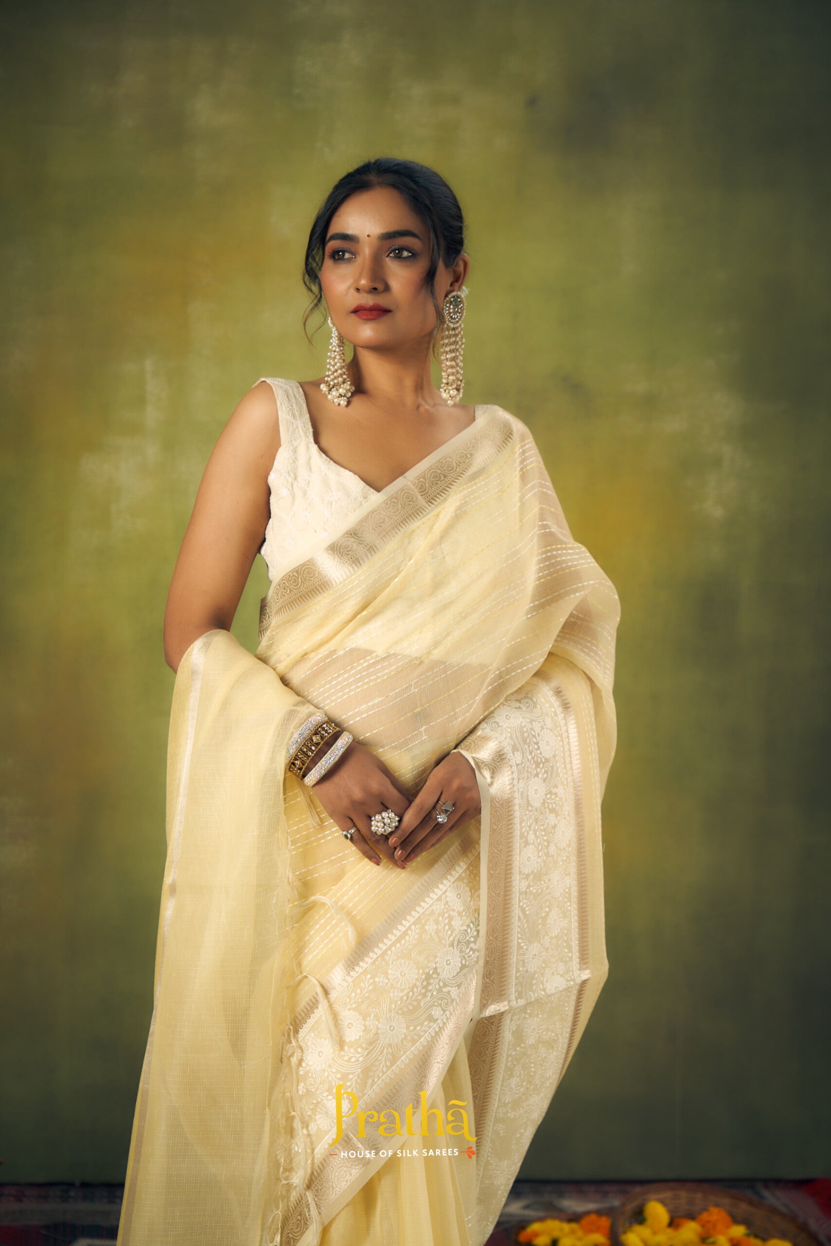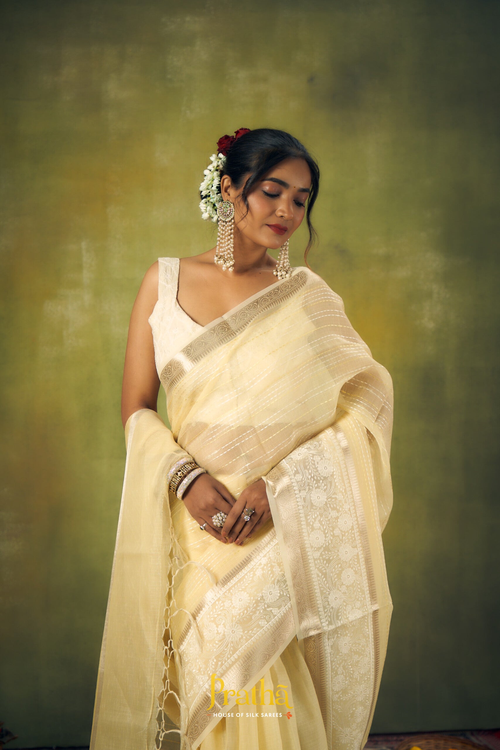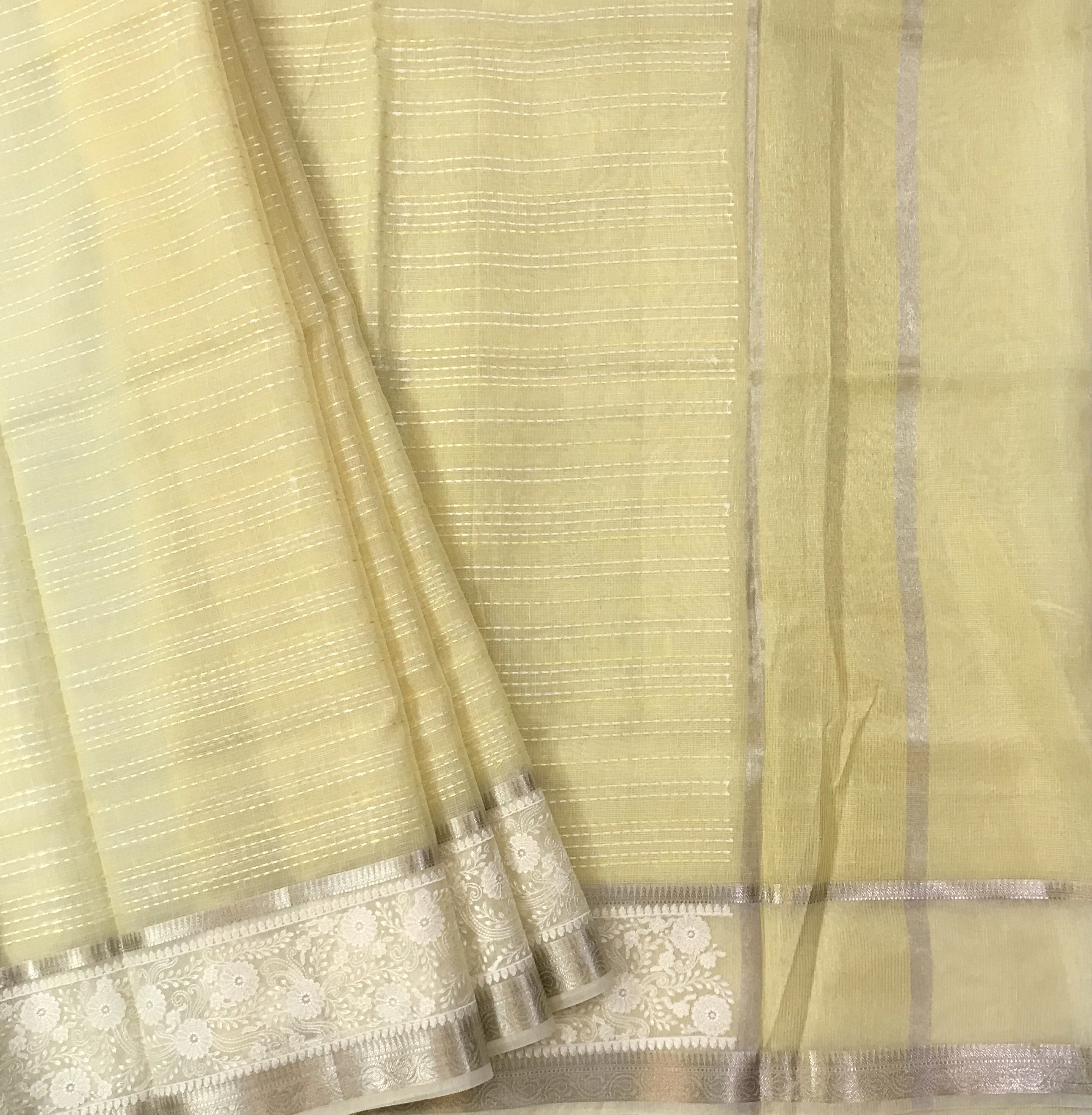 This subtle and elegant saree features a soft pastel yellow body highlighted with fine horizontal line patterns that add gentle texture and charm. The sheer fabric lends it a light, airy feel, perfect for effortless draping. Finished with a delicate silver zari border adorned with floral detailing, this saree reflects understated sophistication, making it ideal for daytime festivities and graceful occasions.