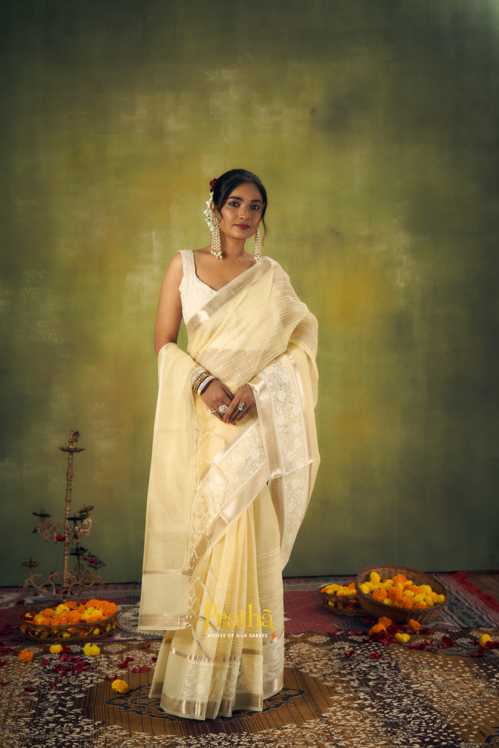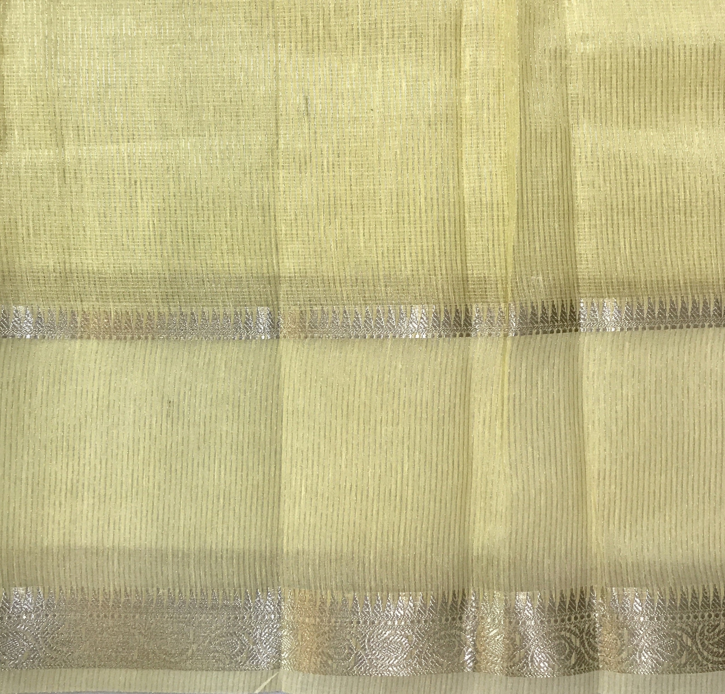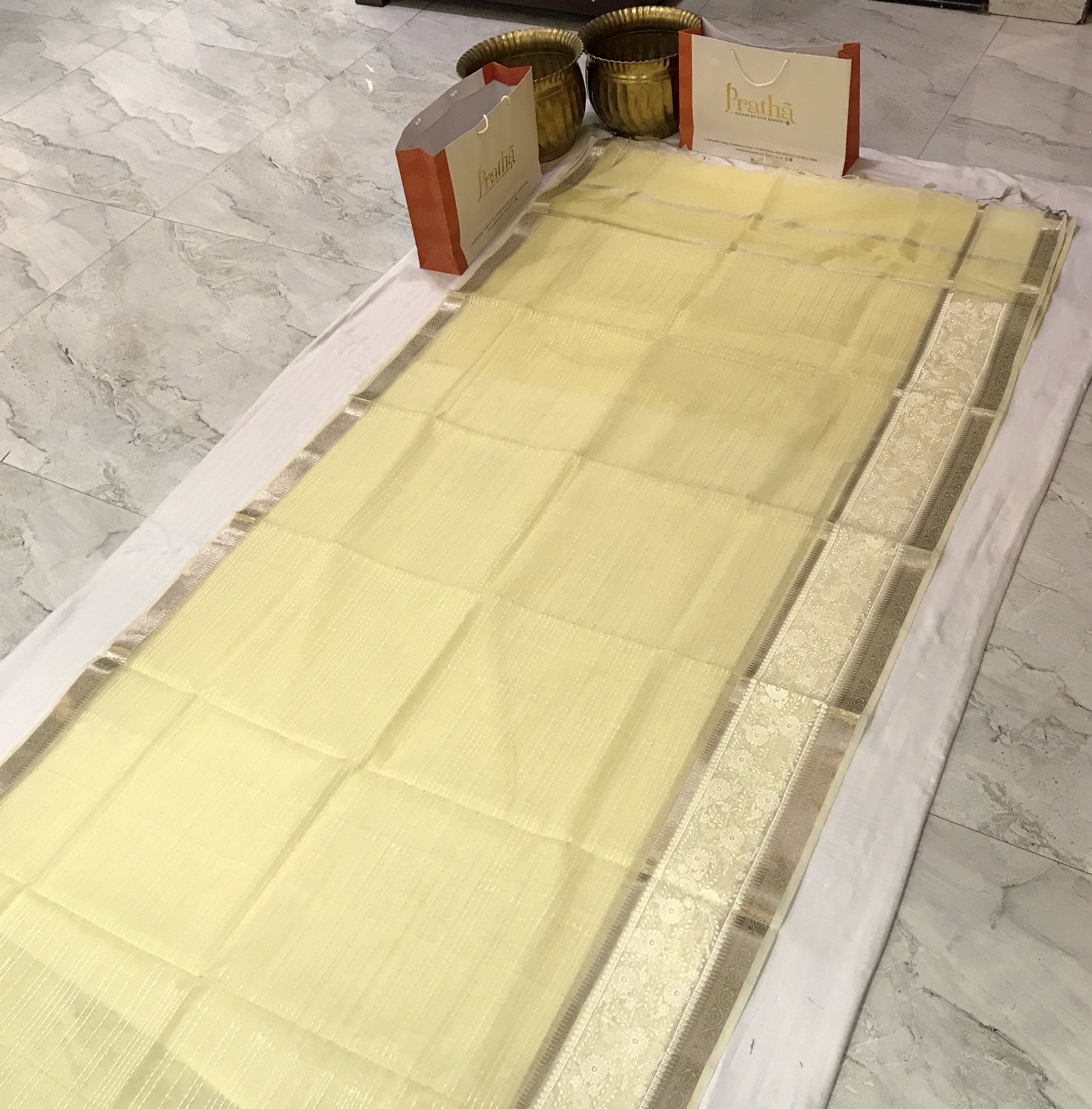 This subtle and elegant saree features a soft pastel yellow body highlighted with fine horizontal line patterns that add gentle texture and charm. The sheer fabric lends it a light, airy feel, perfect for effortless draping. Finished with a delicate silver zari border adorned with floral detailing, this saree reflects understated sophistication, making it ideal for daytime festivities and graceful occasions.