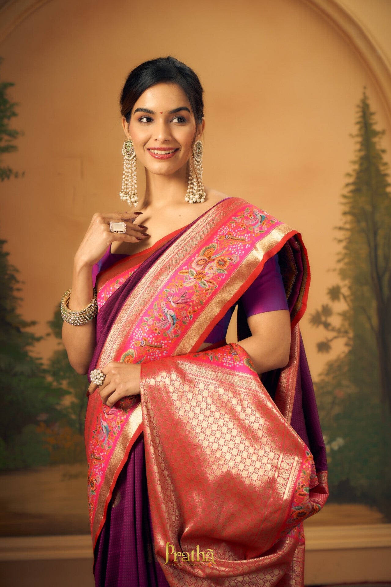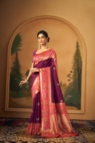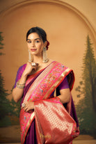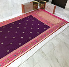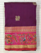 The Banarasi saree boasts small embossed checks adorned with exquisite peacock and round motifs colour in Magenta-Purple. Its border features intricate floral and bird embossed designs, adding an elegant allure to this traditional attire. Rich in cultural heritage and craftsmanship, it exudes timeless charm and sophistication, epitomizing the artistry of Indian textiles.