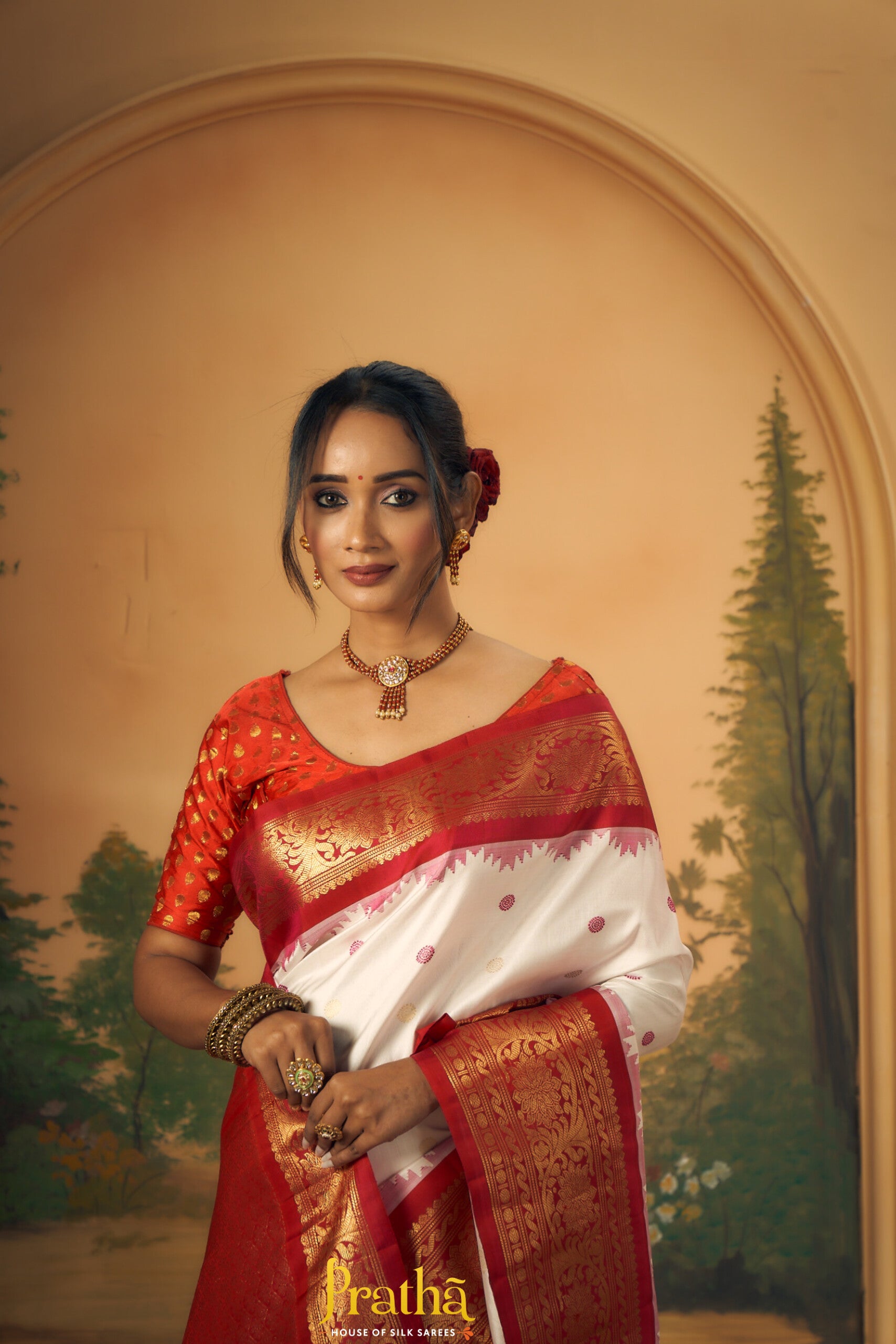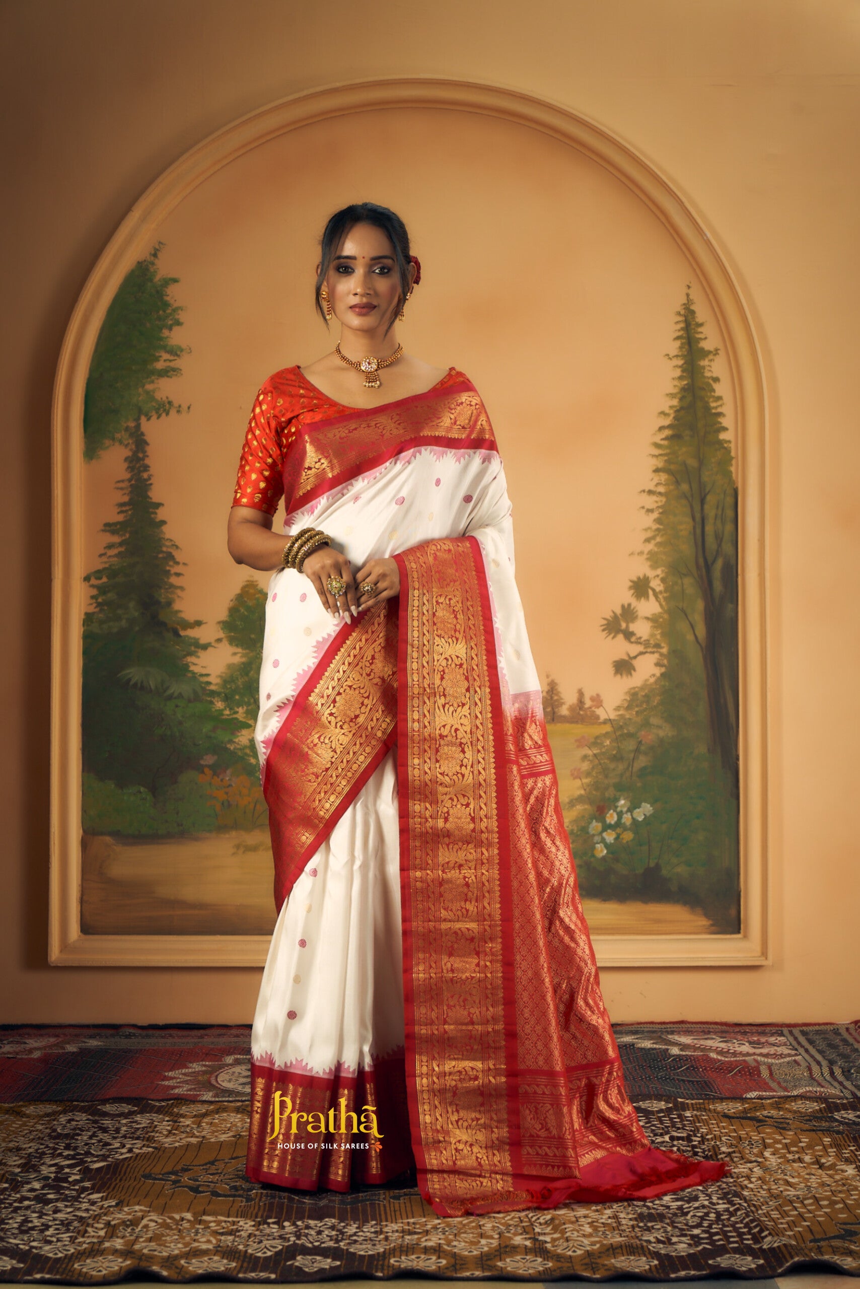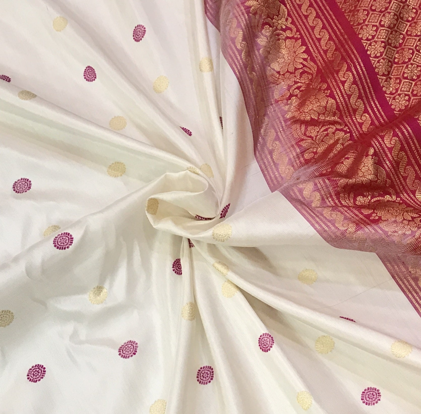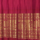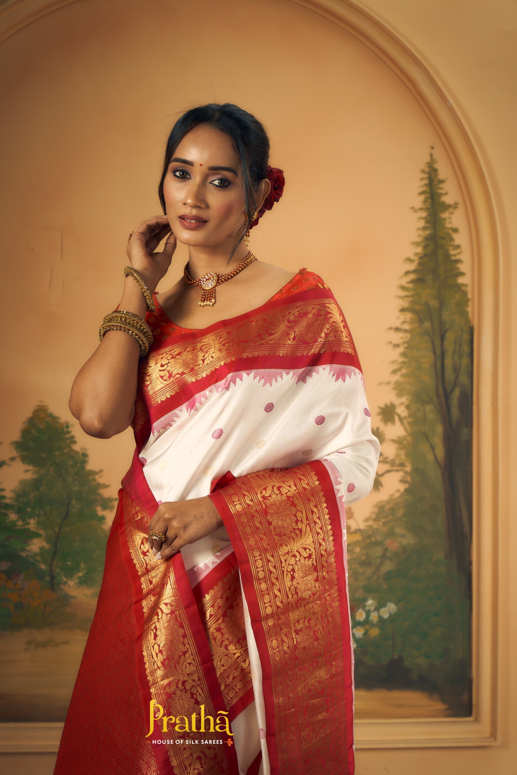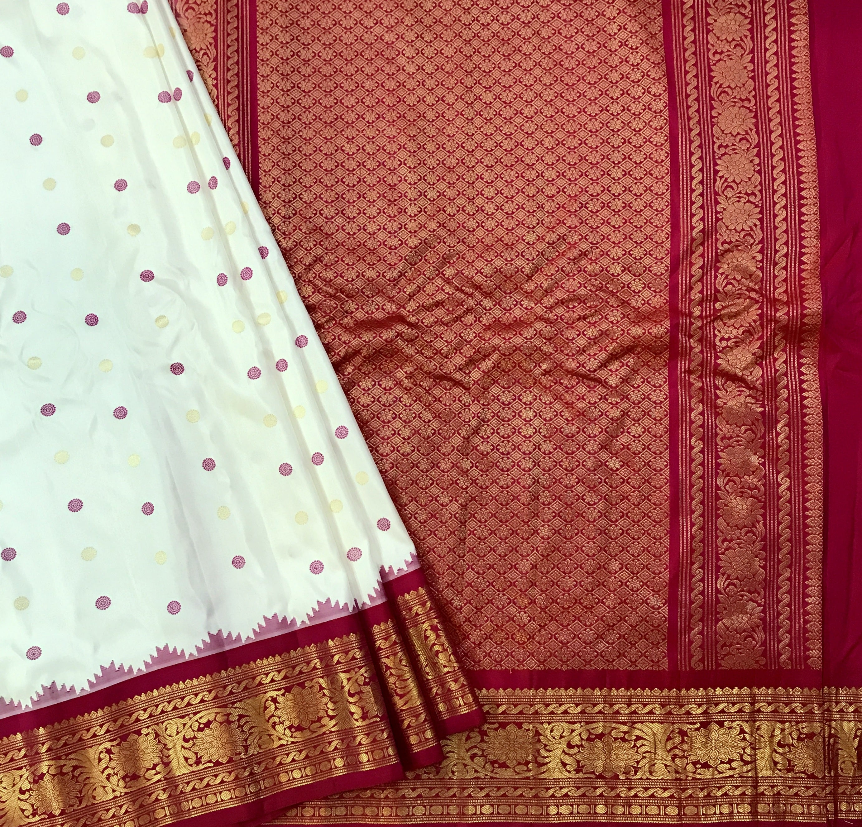 The soothing shade of white and reddish-pink combination wins hearts across traditions and cultures! This beautiful Gadhwal, the 'floral' design alternate intricate reshim and zari butti the golden zari border with an elaborate temple design make this weave a charmer! The intricately woven pallu adds to the beauty of this saree!