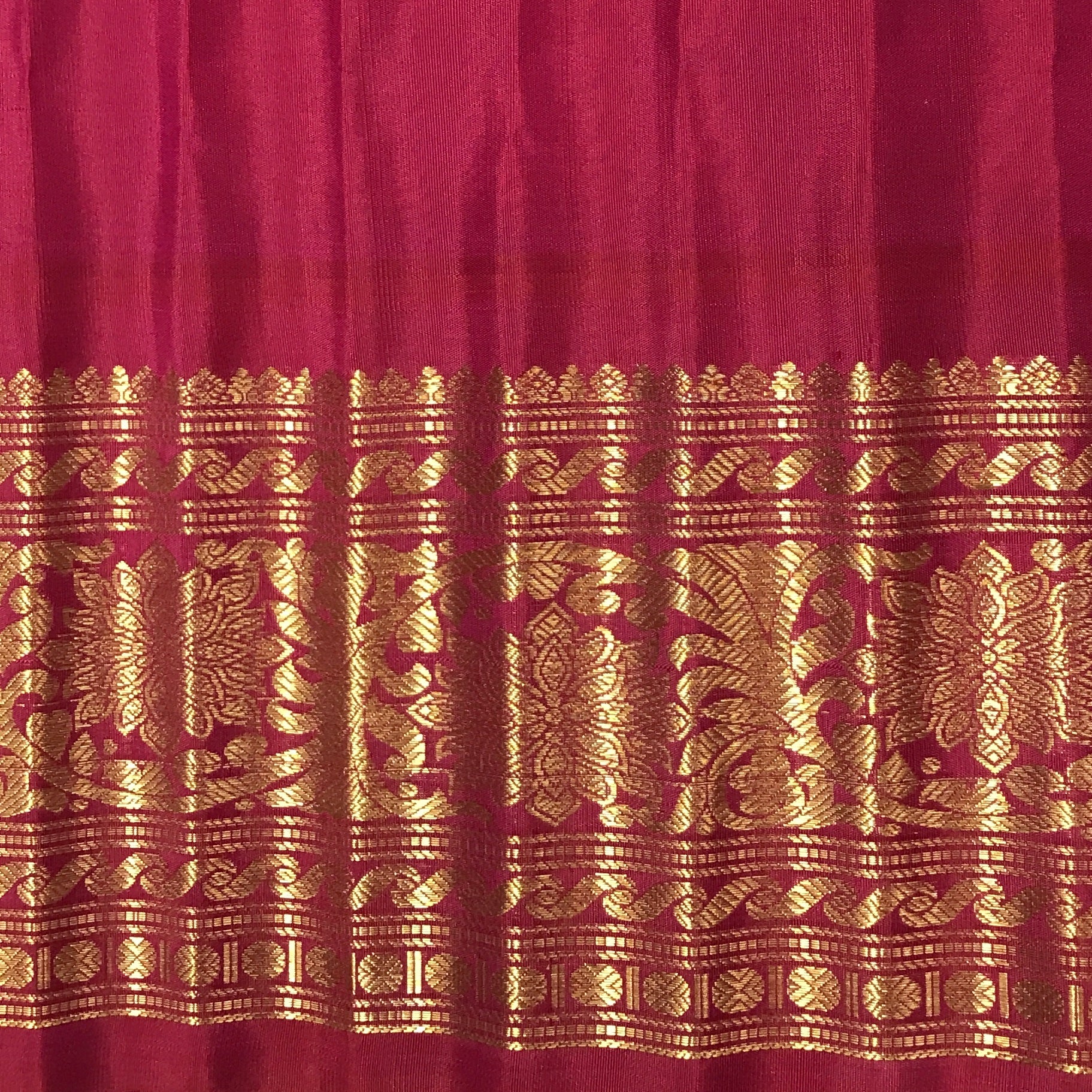 Blouse Colour: Contrast ( Reddish-pink with Golden zari border )