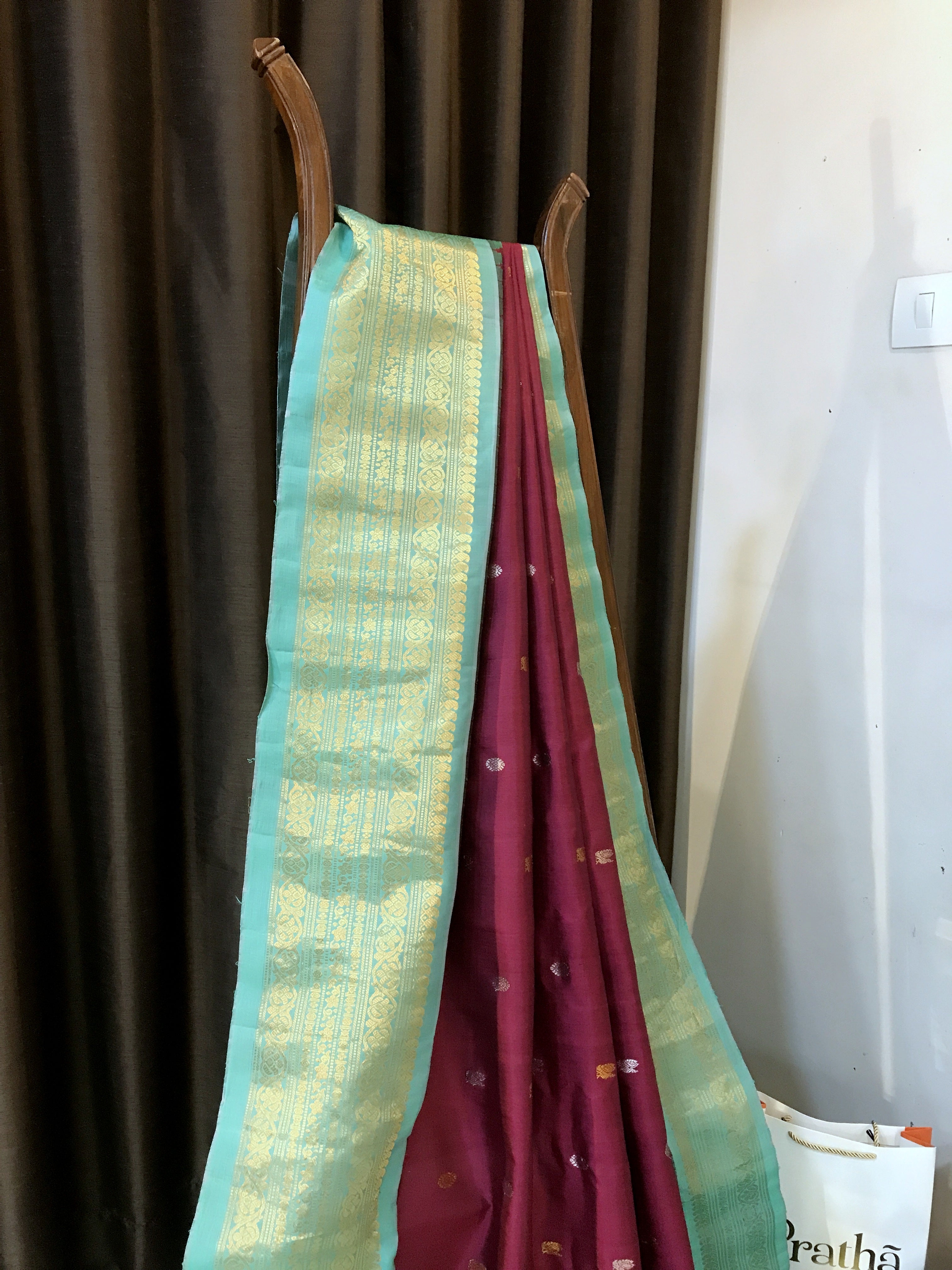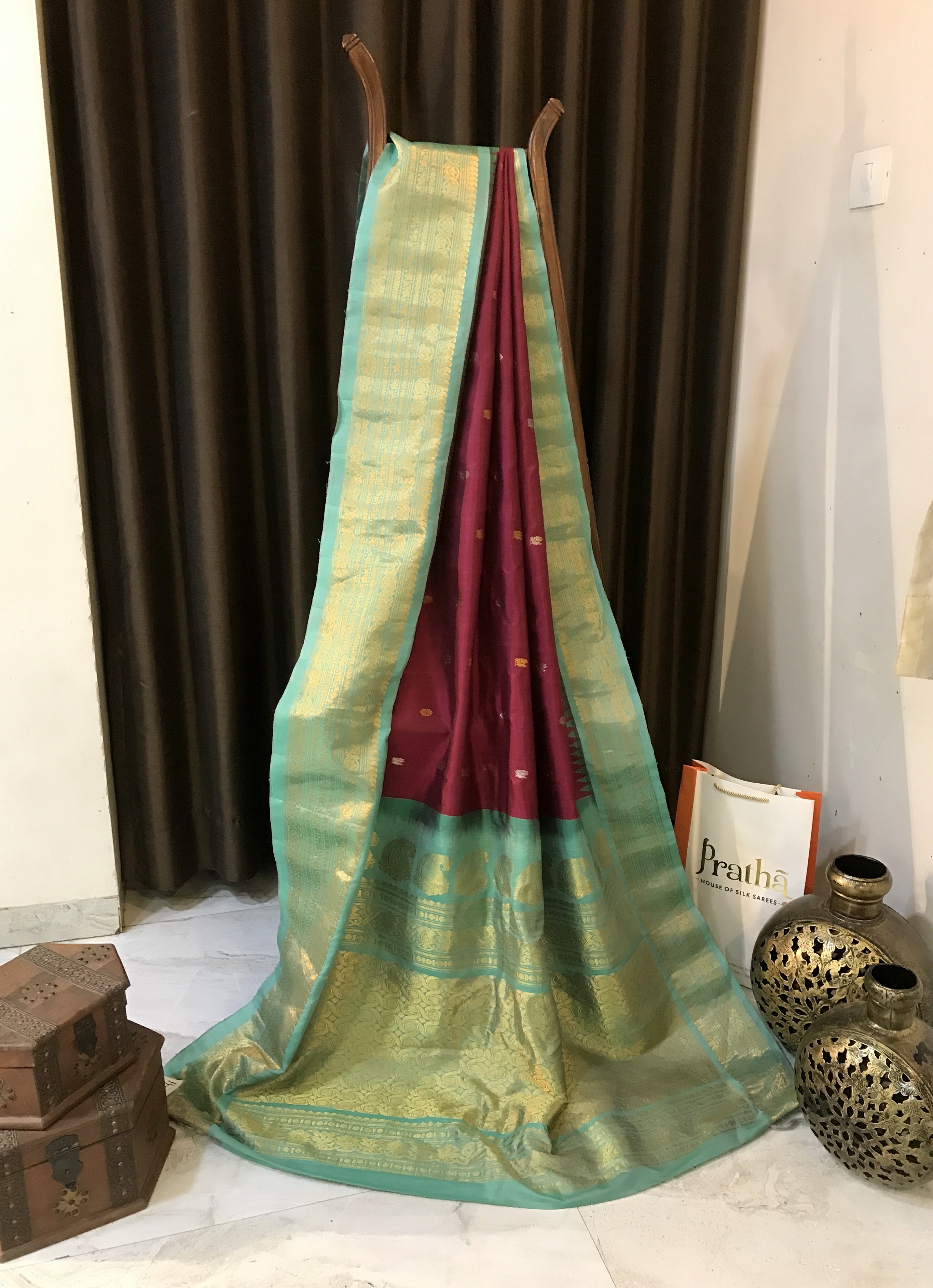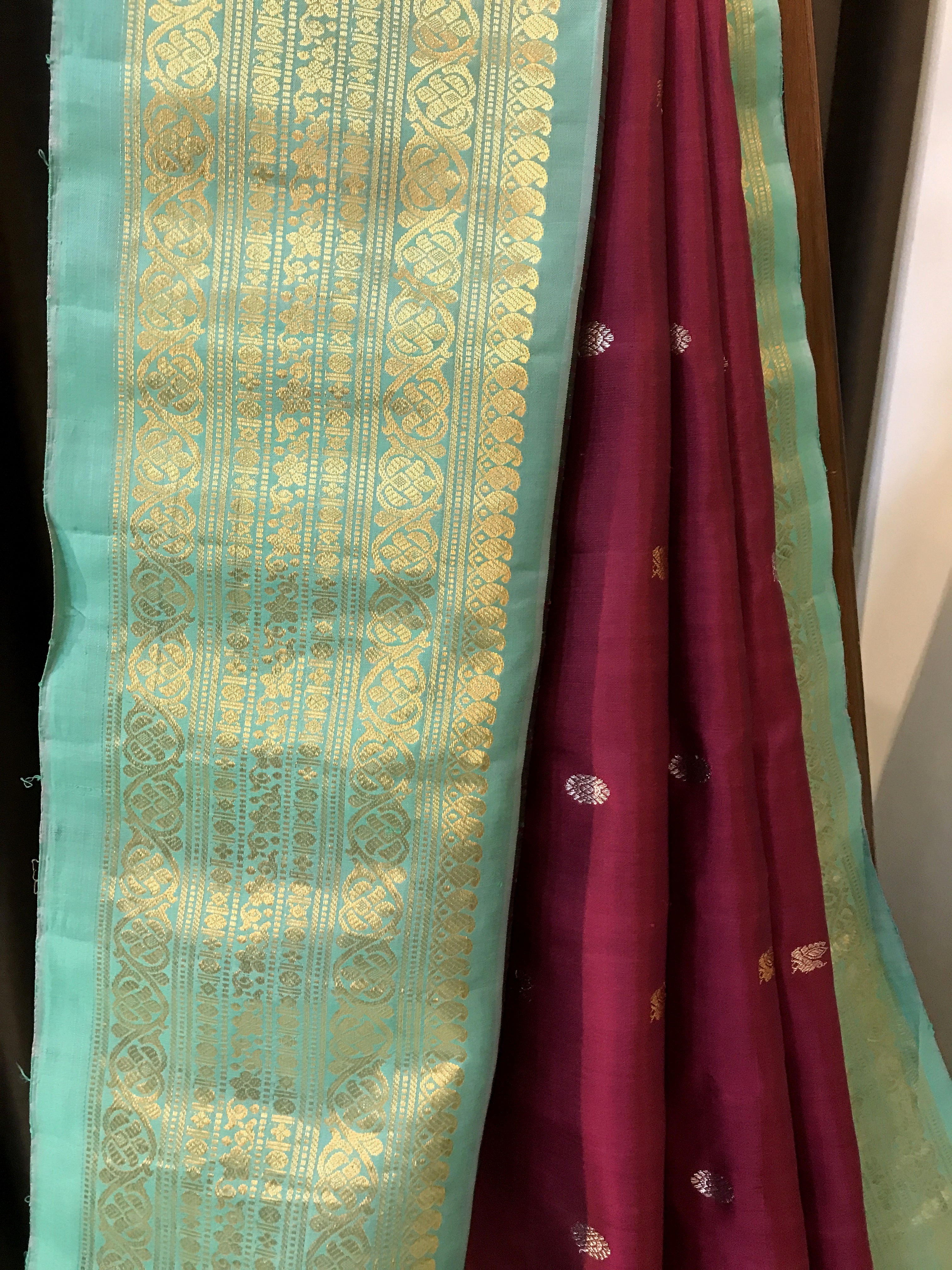 Blouse Colour: Contrast ( Bluish-green with golden zari border )