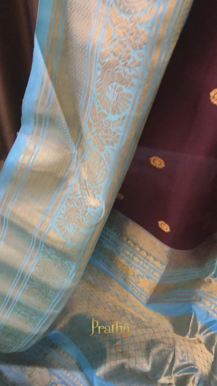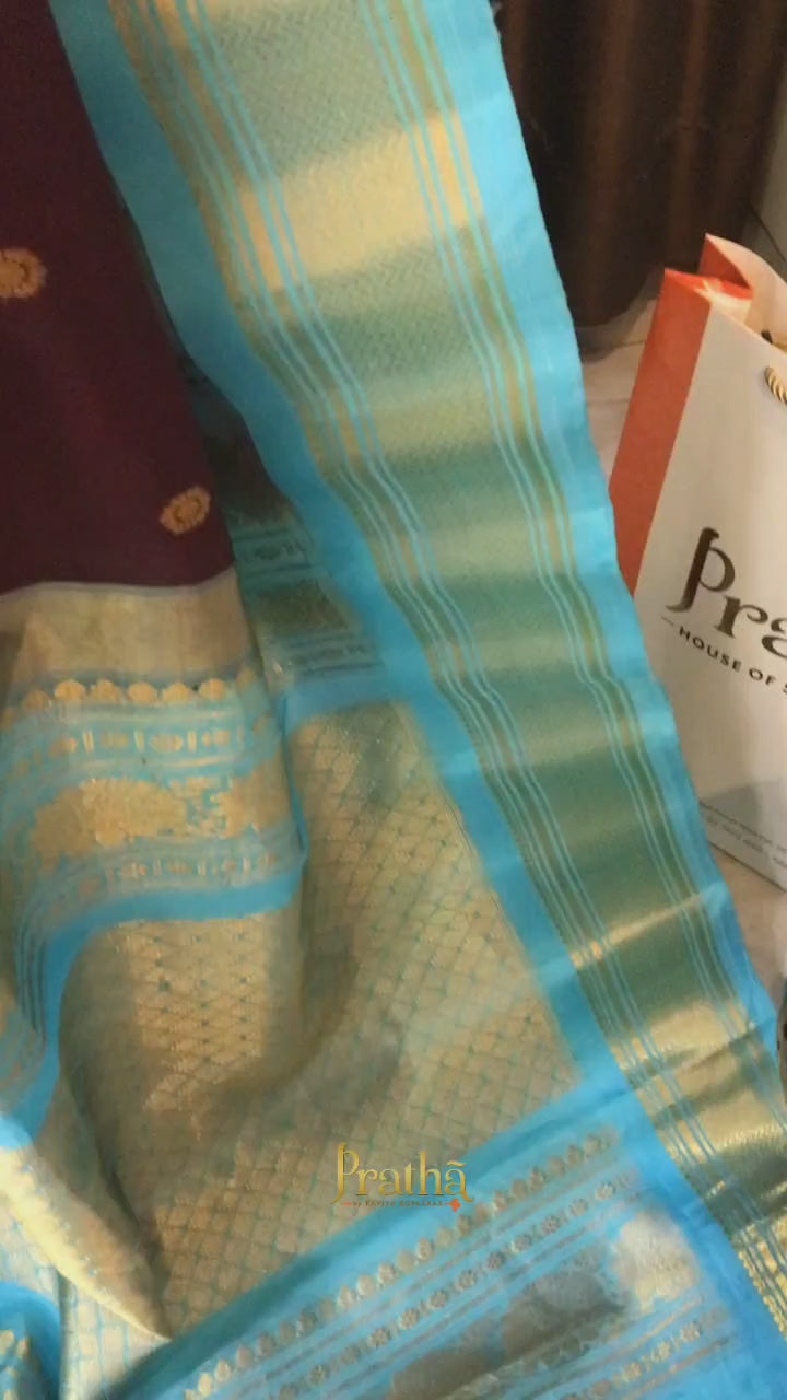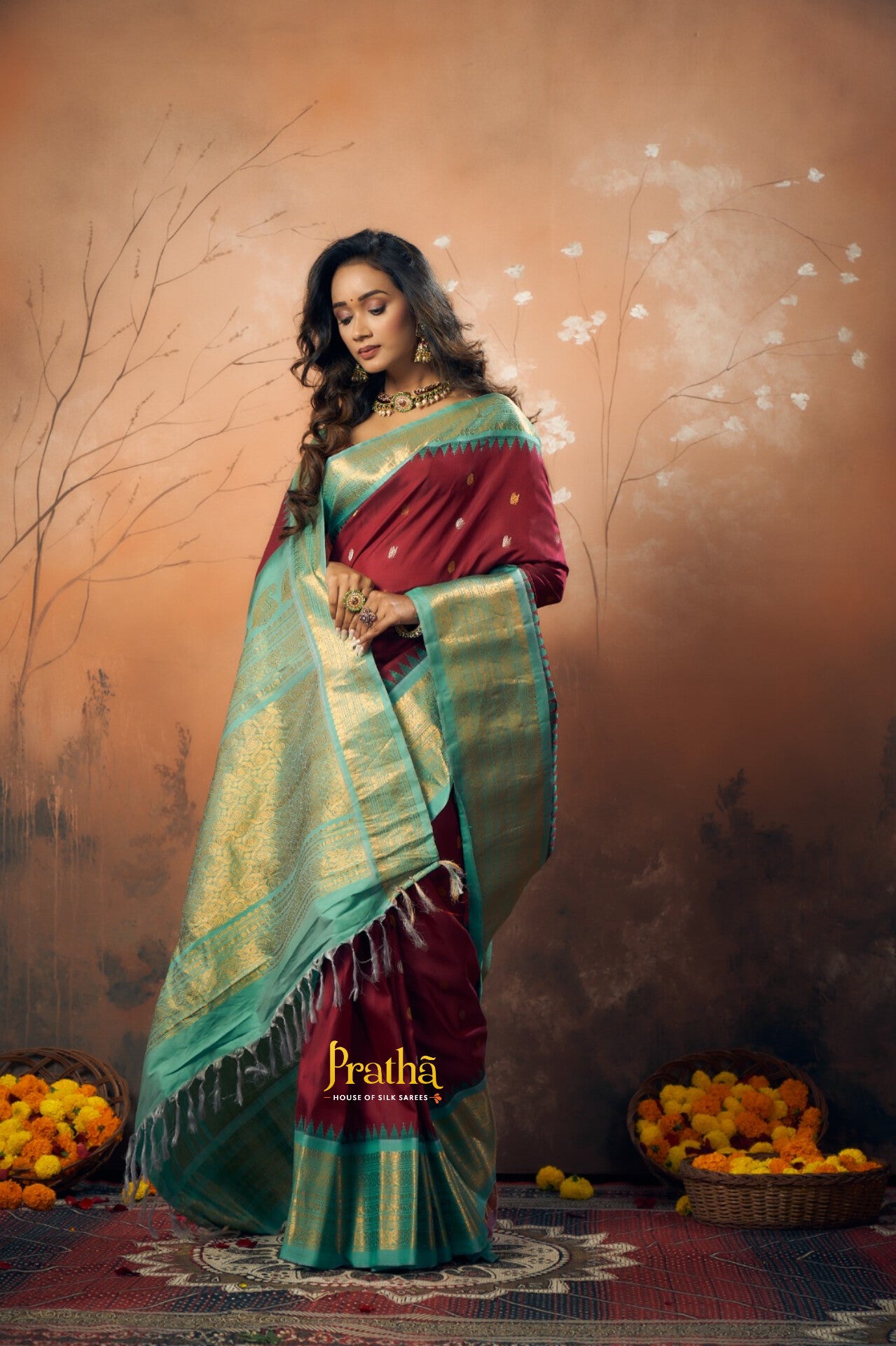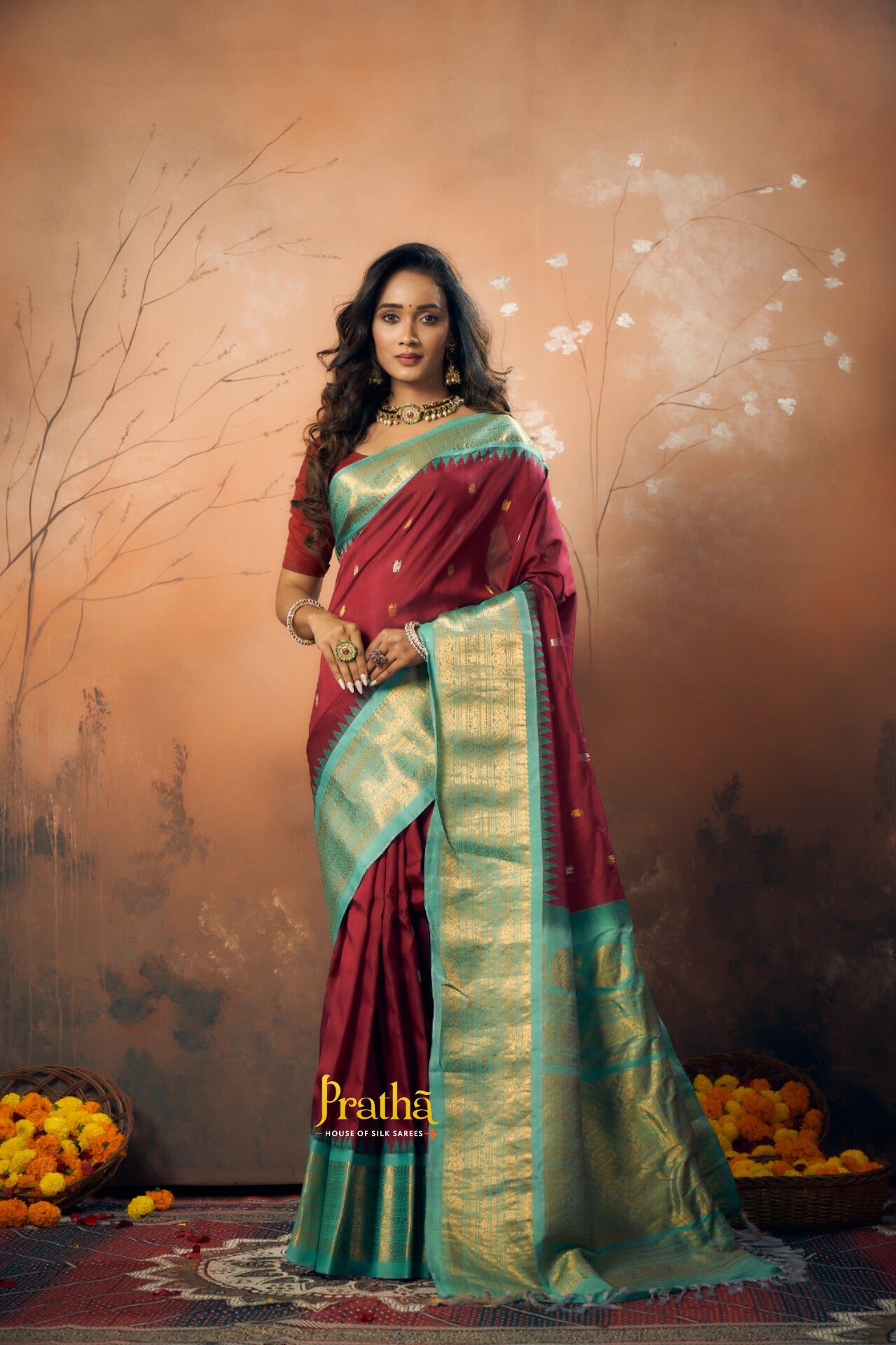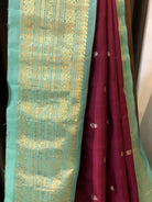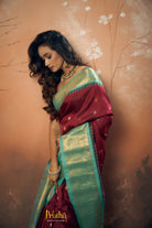 This exquisite maroon-wine Gadhwal saree stands out with its striking green border and a beautifully crafted designer zari pallu. The unique butti pattern evenly distributed above the traditional Gadhwal border exudes elegance and sophistication. This stunning Gadhwal design is sure to captivate and charm.