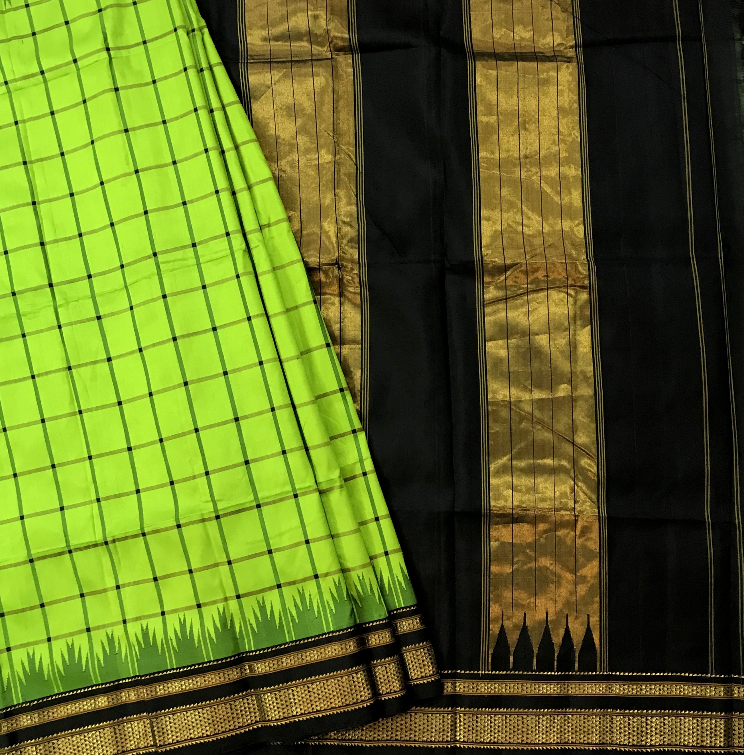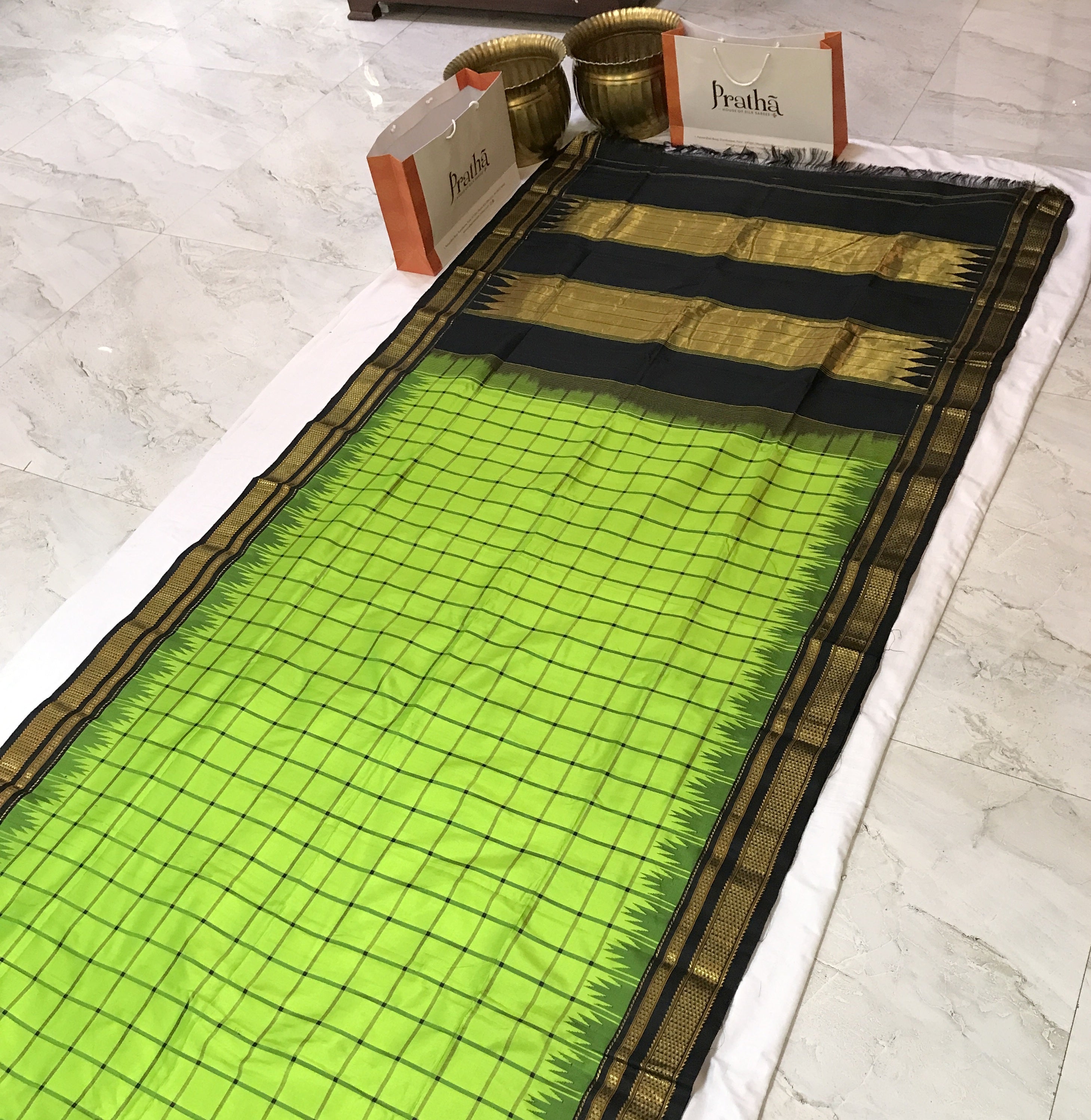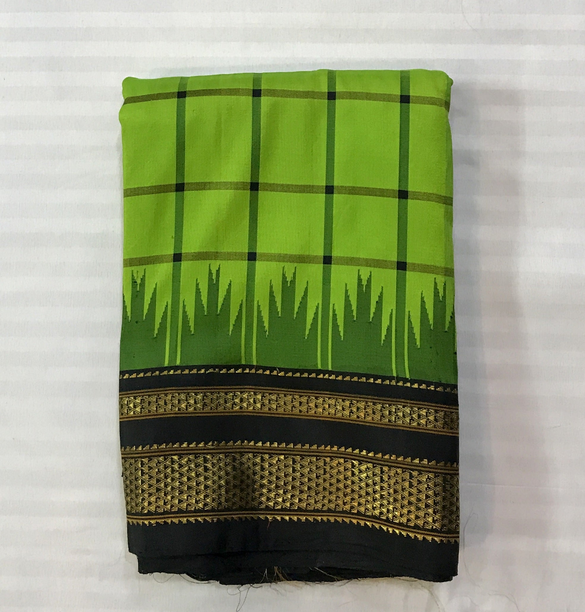 A very beautiful and attractive combination of Green with a black coloured temple design golden zari border, look magnificent especially with the zari checks woven throughout this pure silk handwoven Irkal. This classic weave looks stunning when drape. The zari checks and the traditional temple design of the border give festive touch to this weave.