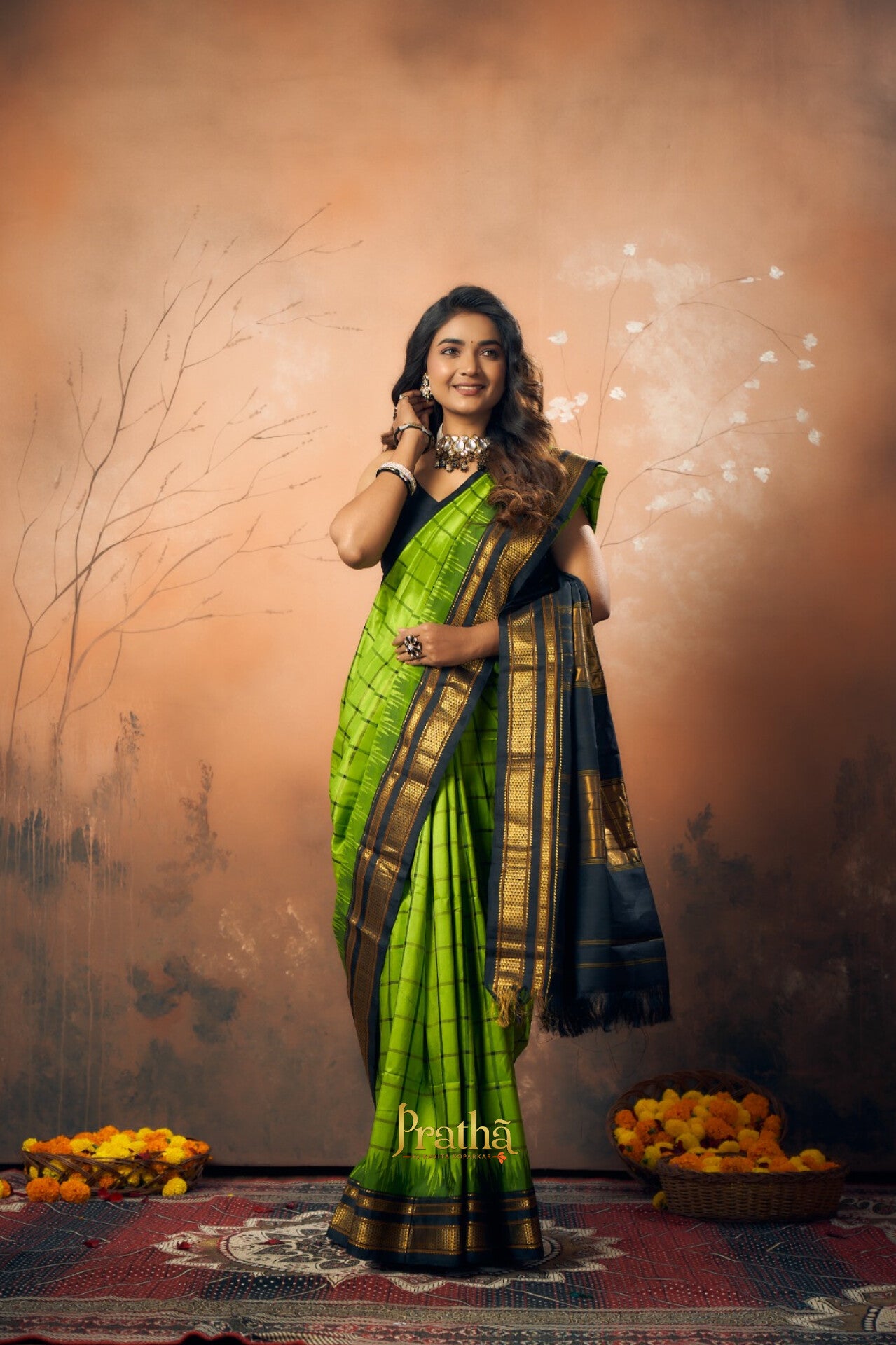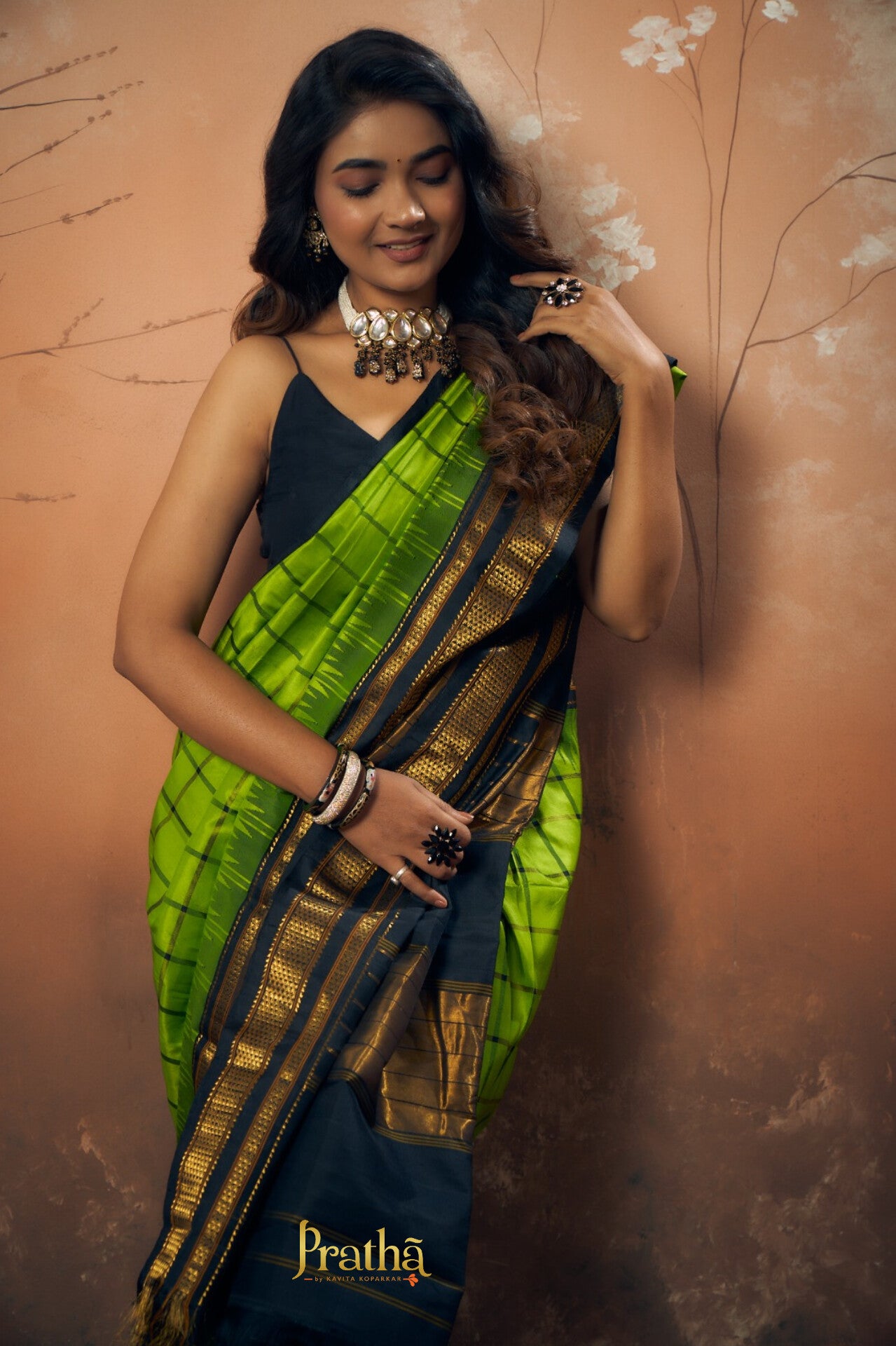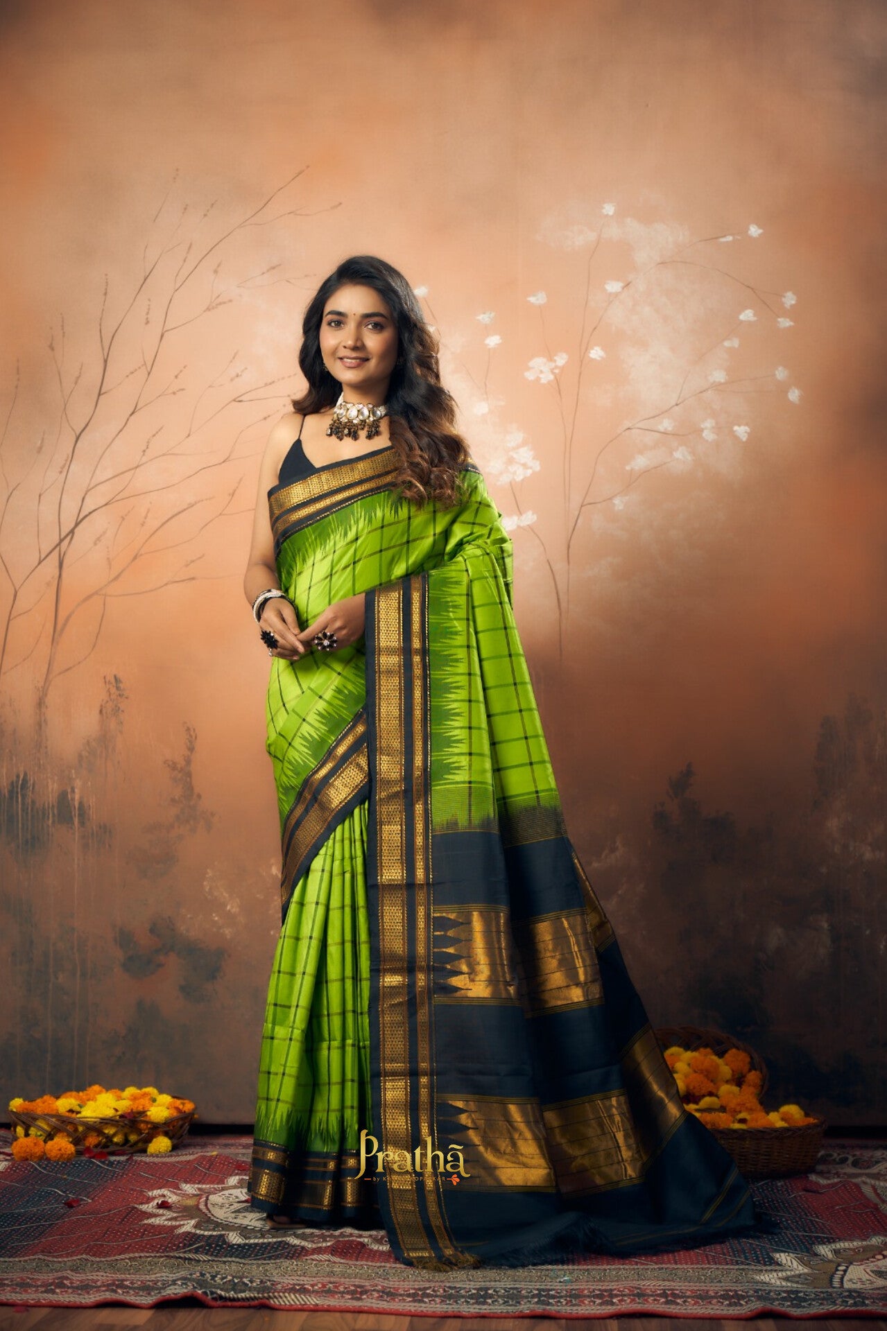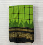 A very beautiful and attractive combination of Green with a black coloured temple design golden zari border, look magnificent especially with the zari checks woven throughout this pure silk handwoven Irkal. This classic weave looks stunning when drape. The zari checks and the traditional temple design of the border give festive touch to this weave.