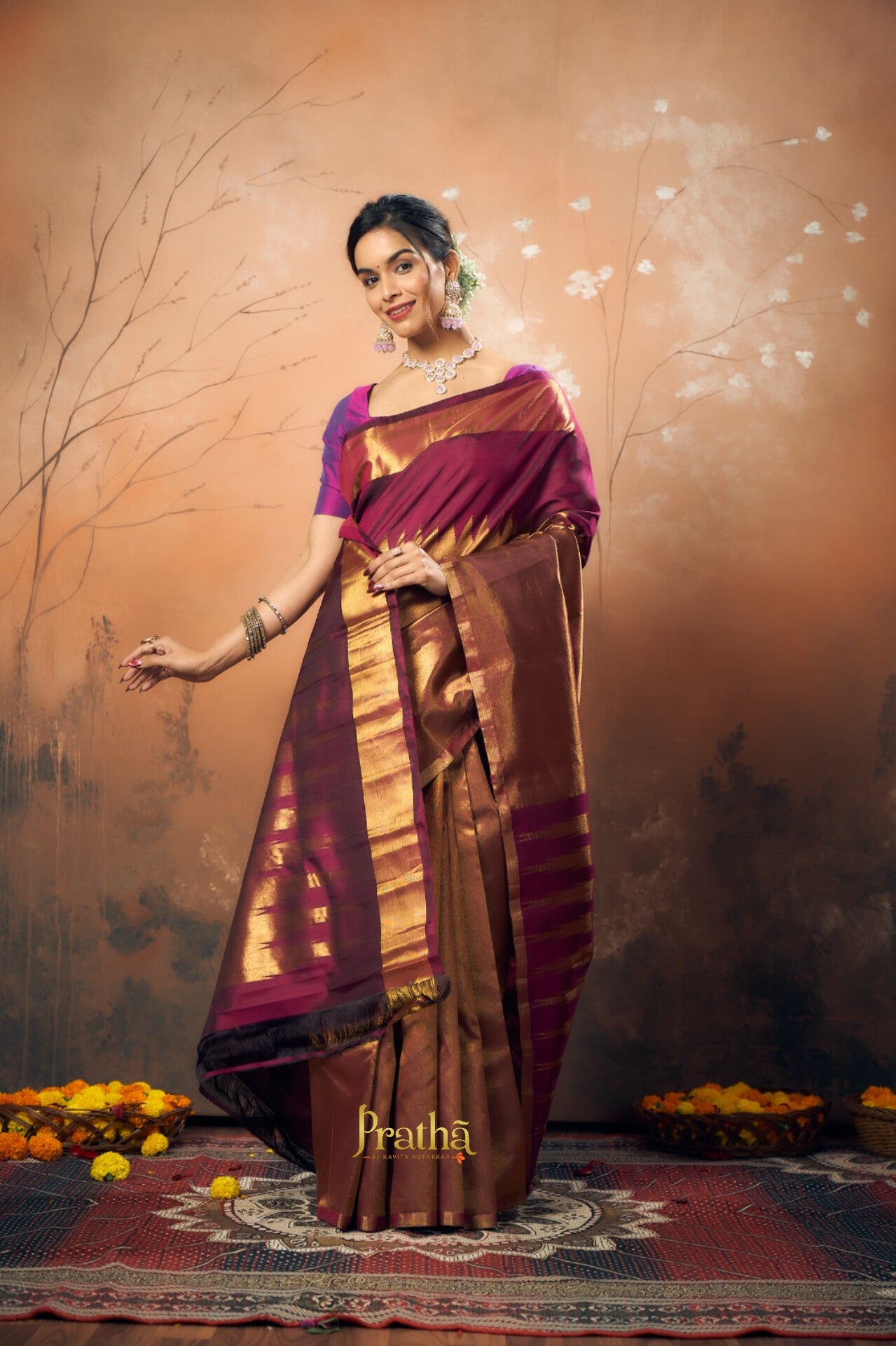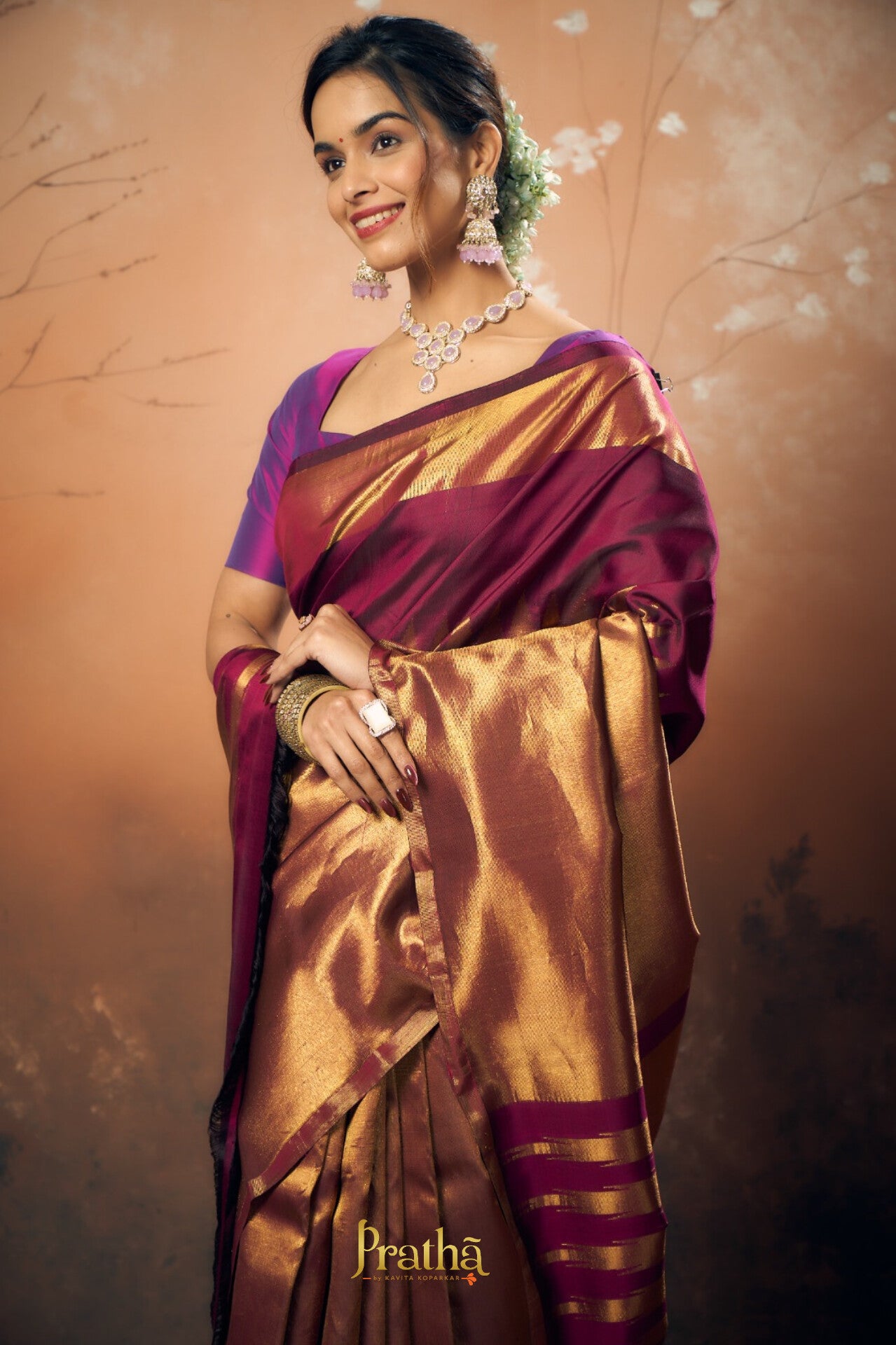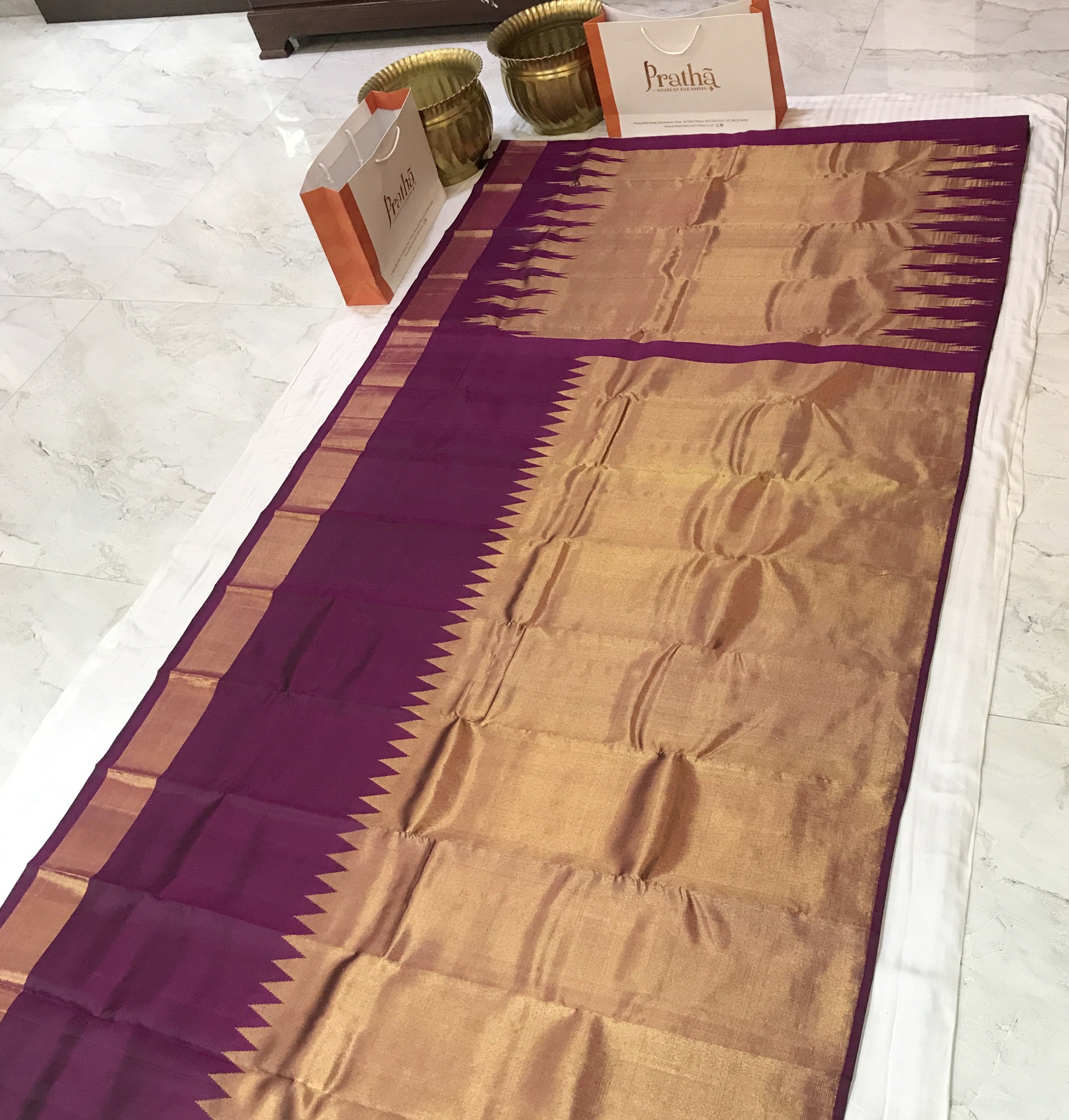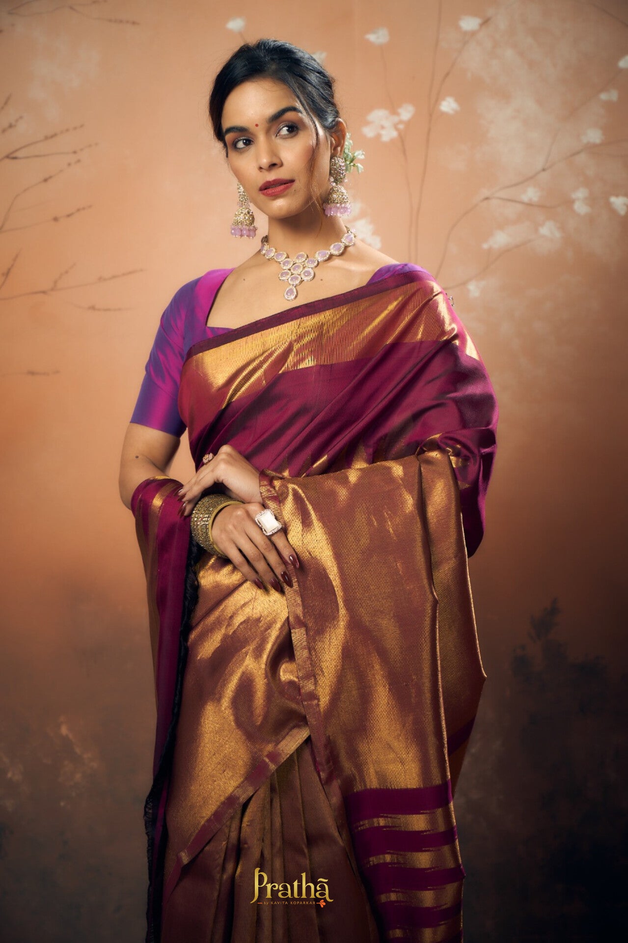 A captivating plum‑purple Kanjeevaram silk saree exquisitely woven with a rich golden zari body, reflecting a perfect fusion of heritage craftsmanship and timeless elegance. The deep plum hue brings a regal charm, while the shimmering golden weave enhances its luxurious appeal. Crafted from pure silk, this saree offers a graceful, fluid drape that adds sophistication to every silhouette. Ideal for weddings, festive events, and grand celebrations, this masterpiece beautifully captures the essence of traditional South Indian artistry.