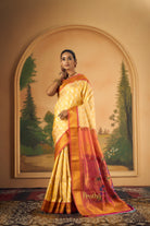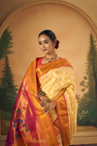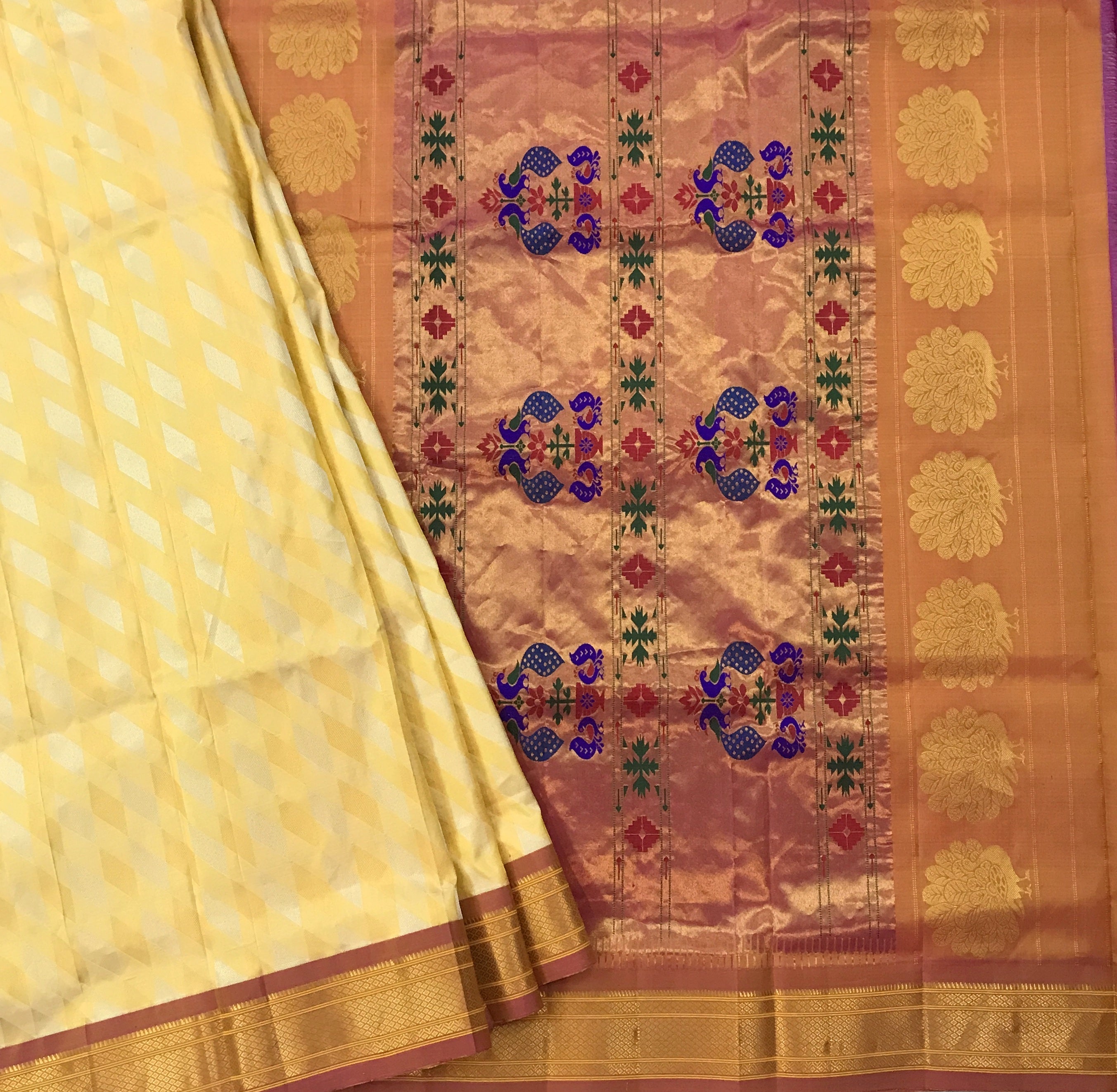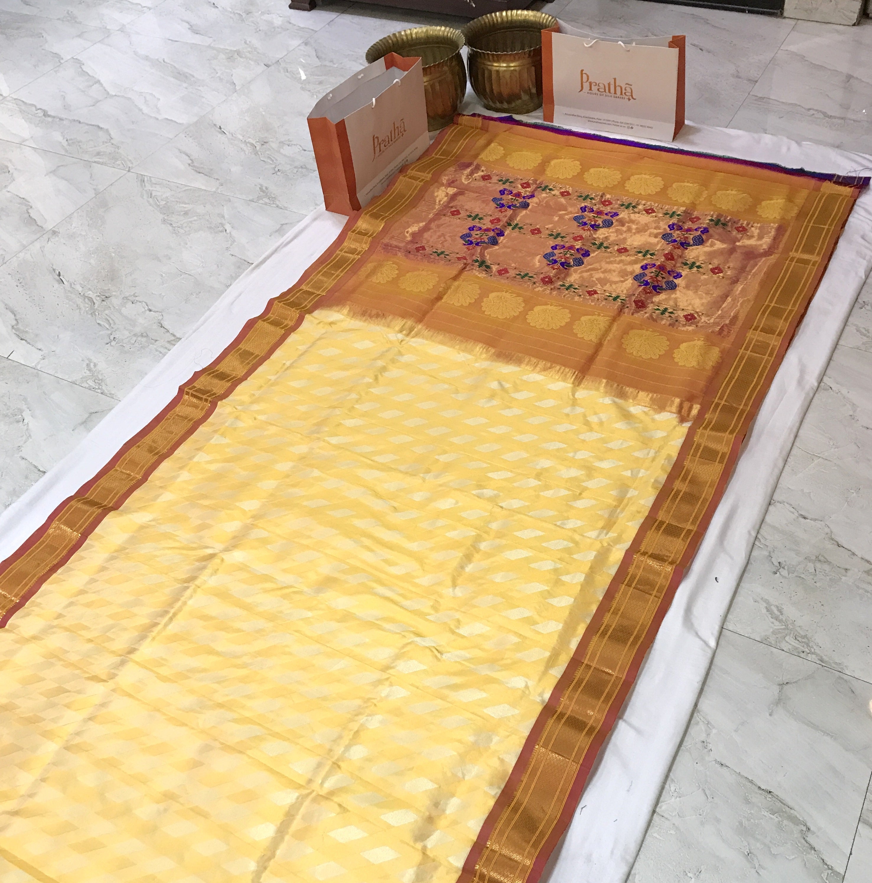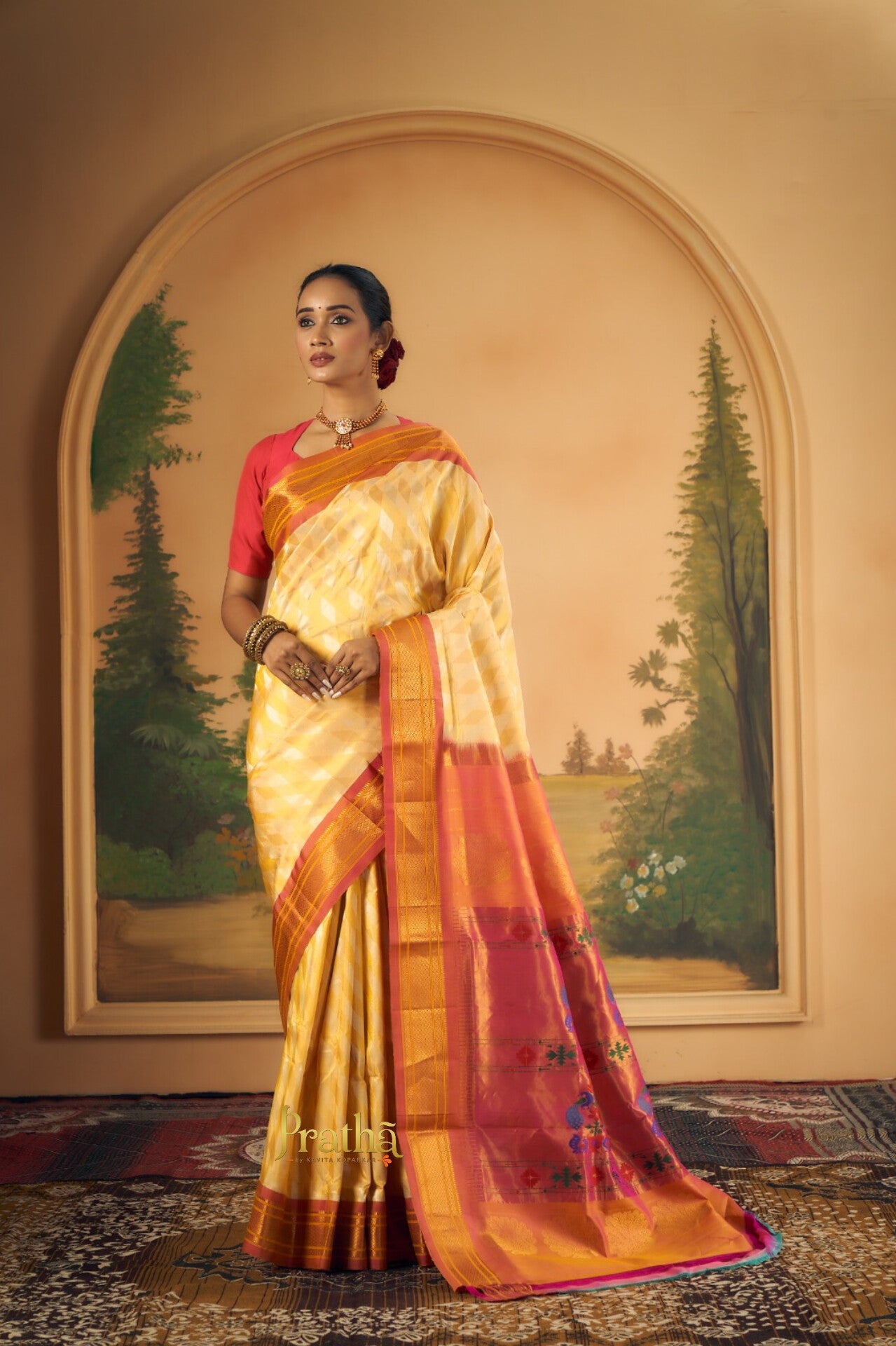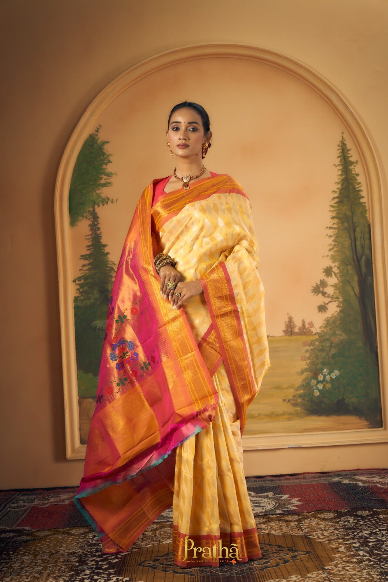 Checks are eternal in the fashion trend cycle, Pratha has few favourite checks sarees and this peacock checkered brocade Paithani is one of the favorites too! With a lemon-yellow and golden kite shaded checks all over the body, this saree is a fusion of trendy and traditional. It has a beautiful traditional peacock paithani pallu and a striking contrast fresh peach border which make this saree suitable for any traditional day or night function.