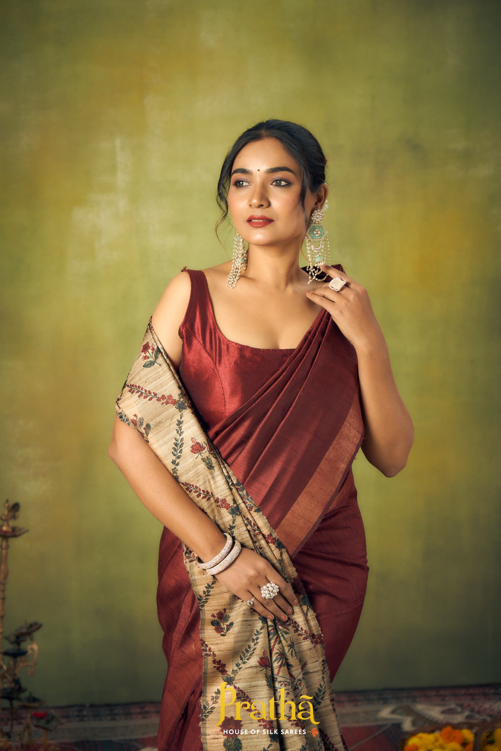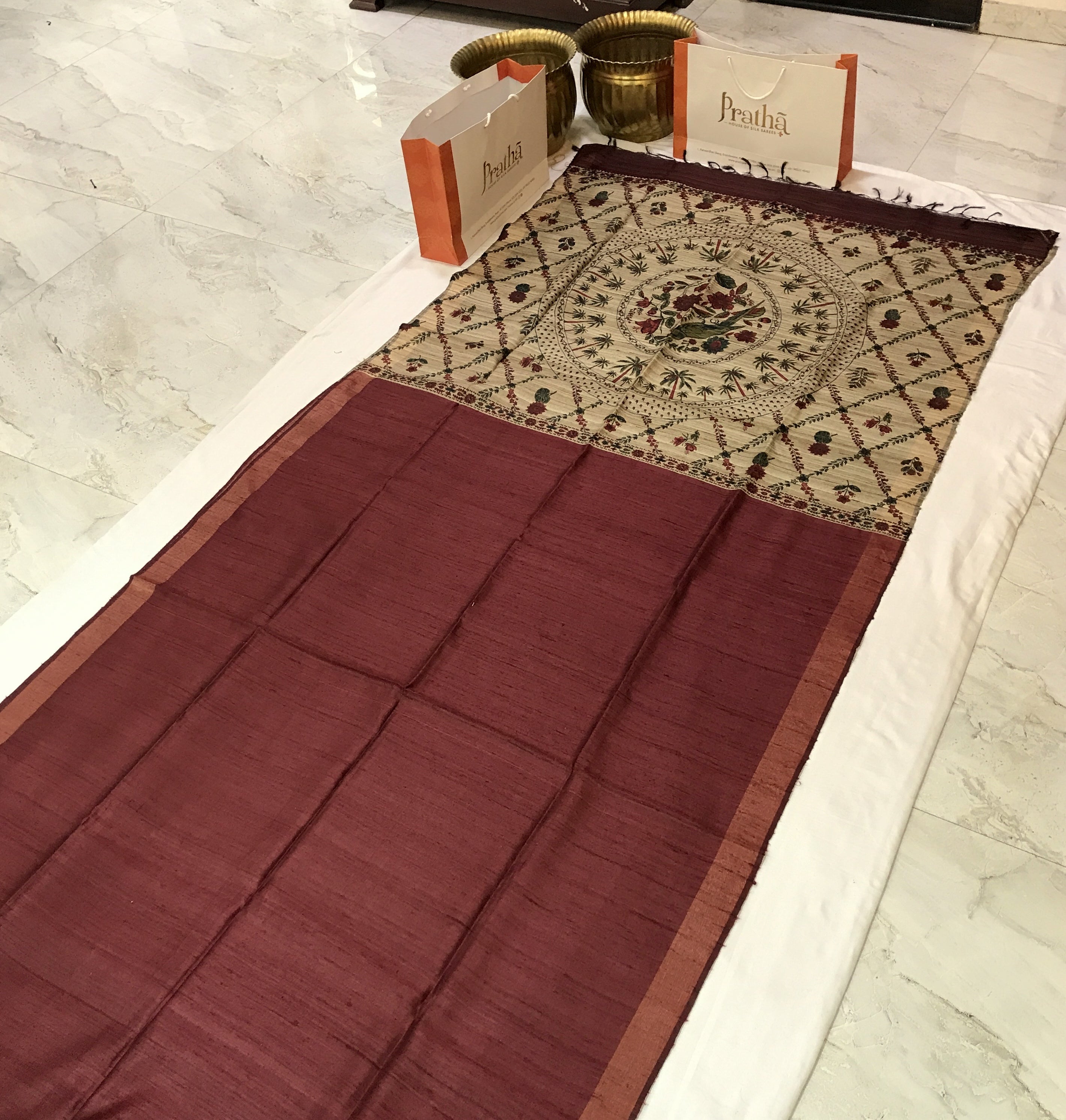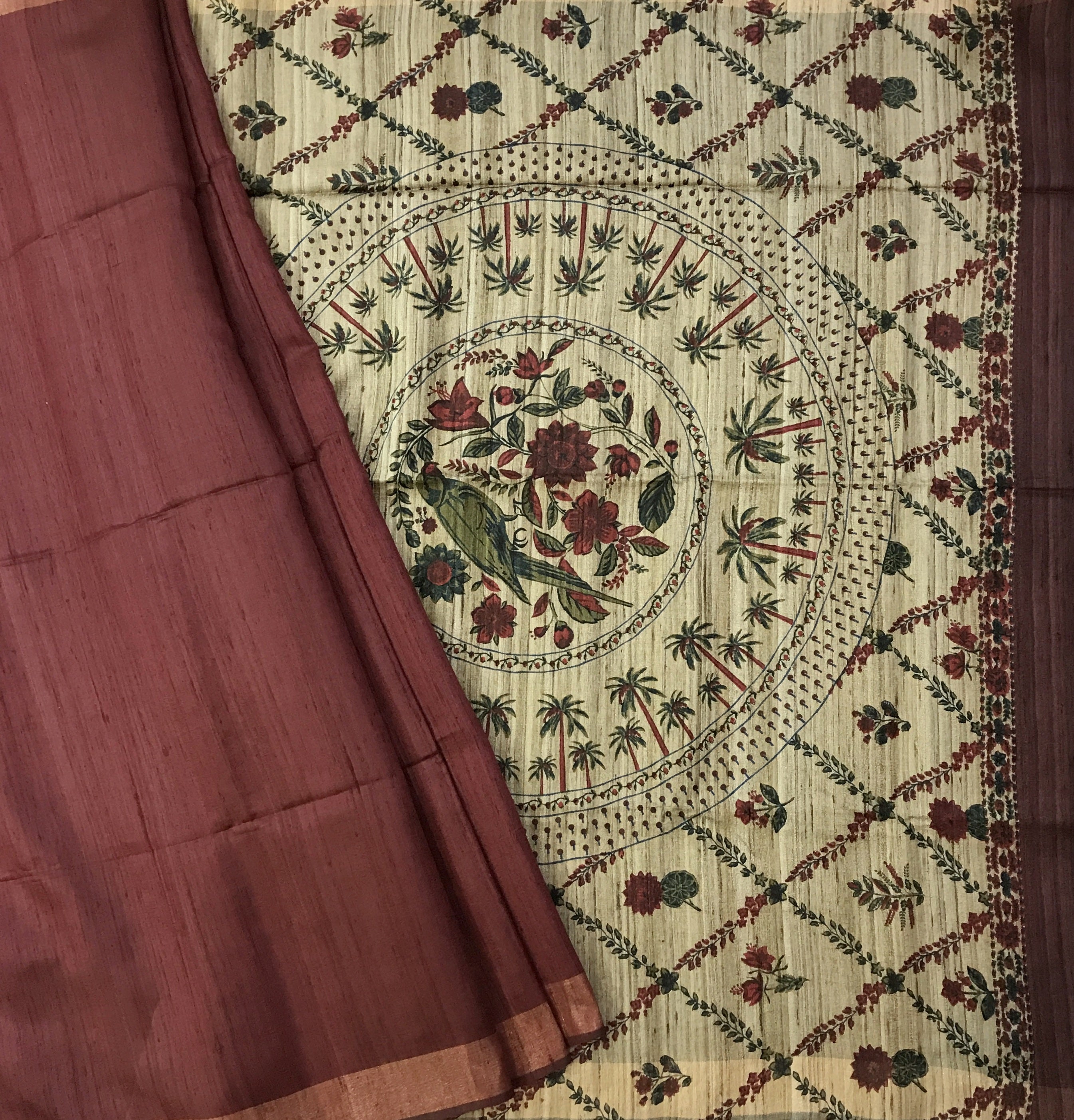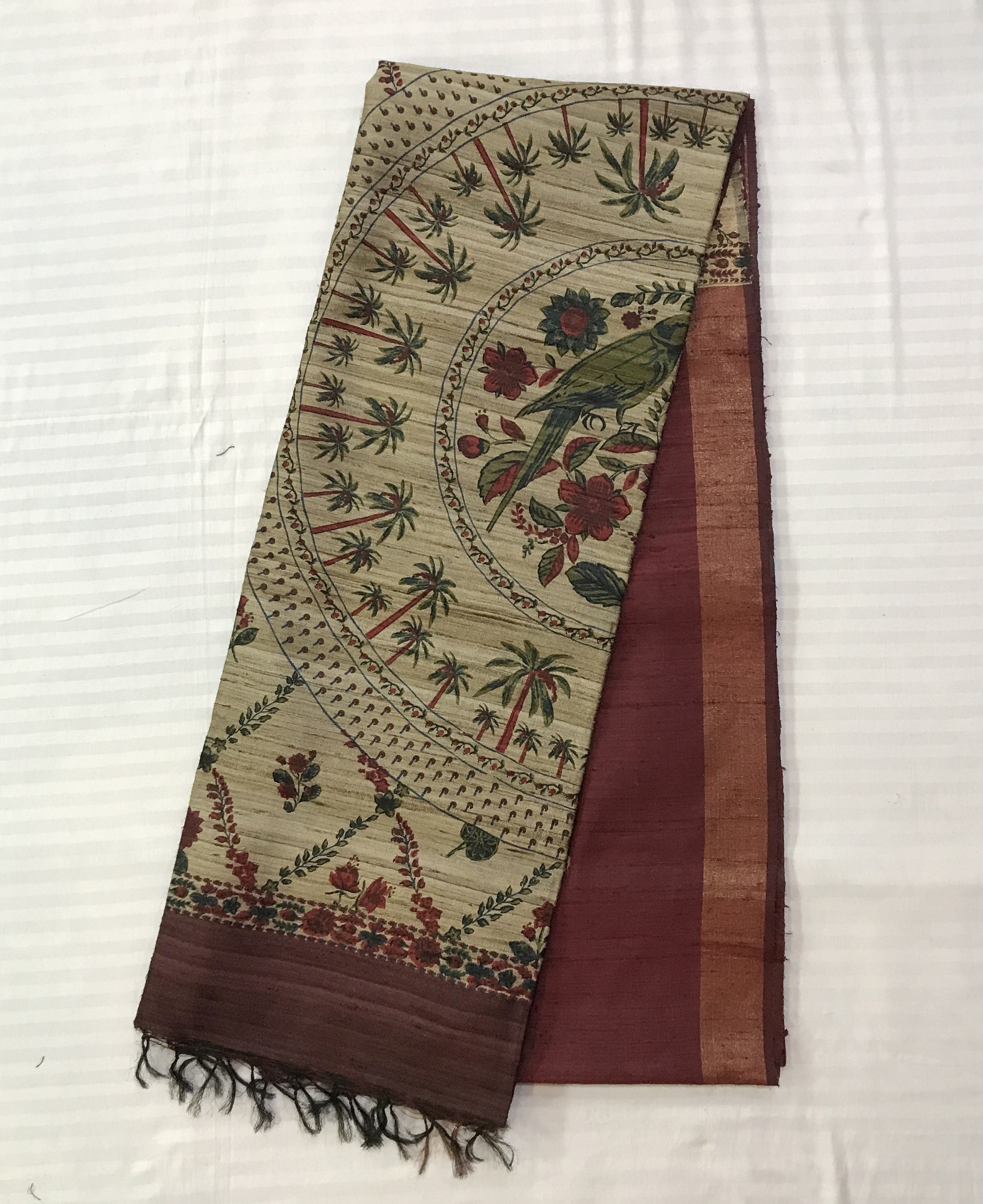This very beautiful print ( design ) , which looks very unique and great when we wear this saree. This plain maroon saree in dupionis Tussar Silk style saree with print design in all over pallu looks fantastic. This saree is light in weight and looks fantastic at corporate events, casual brunches as well as get-togethers.