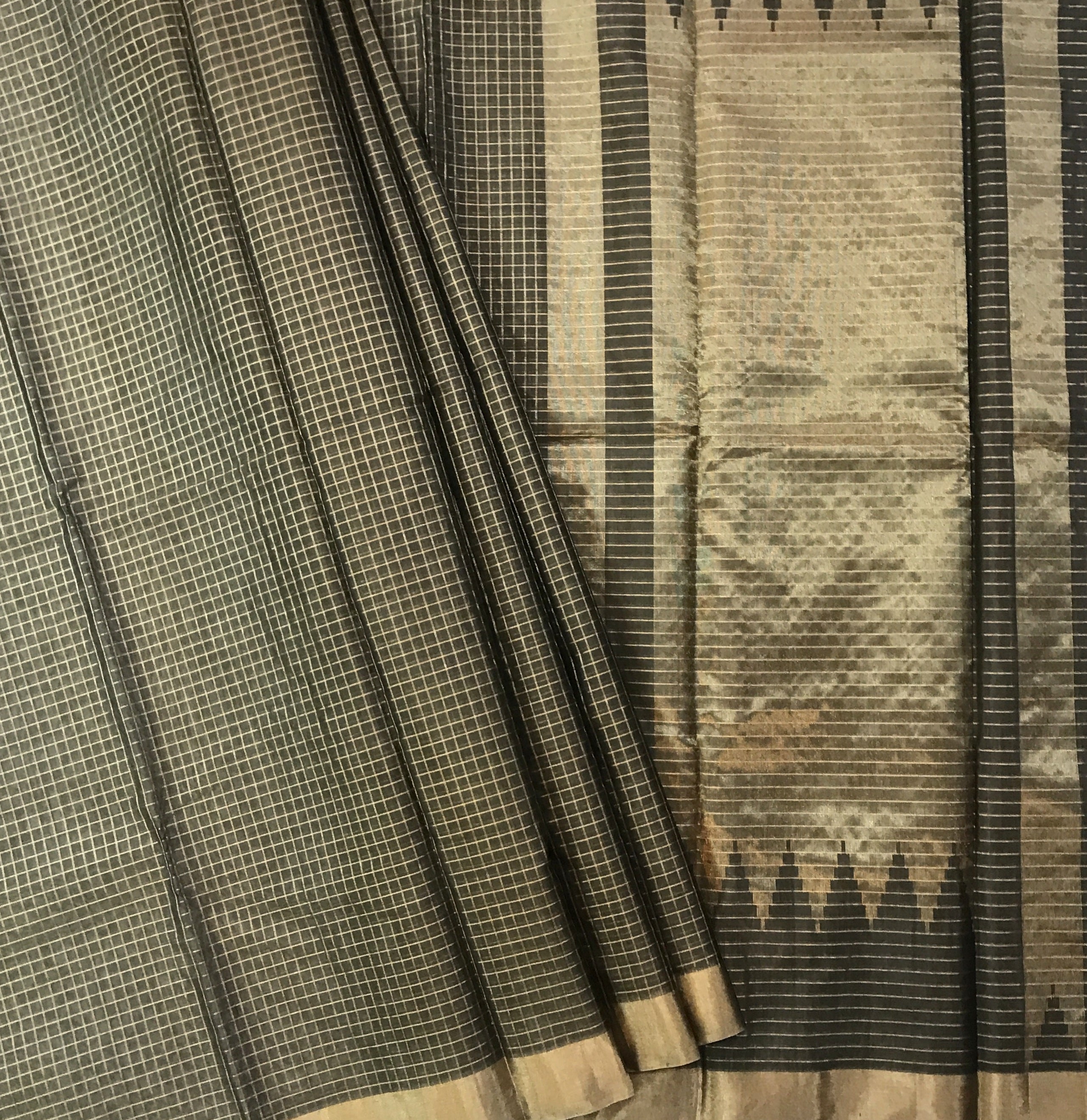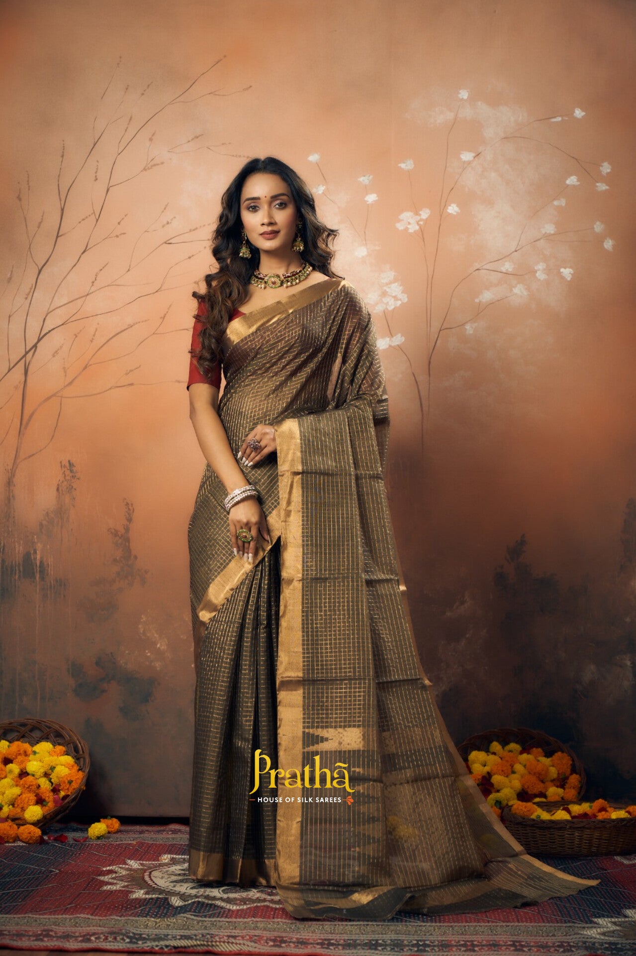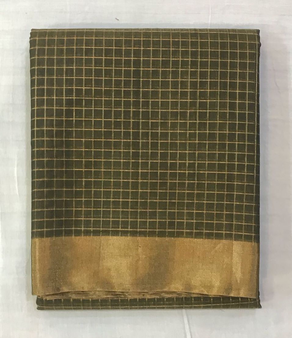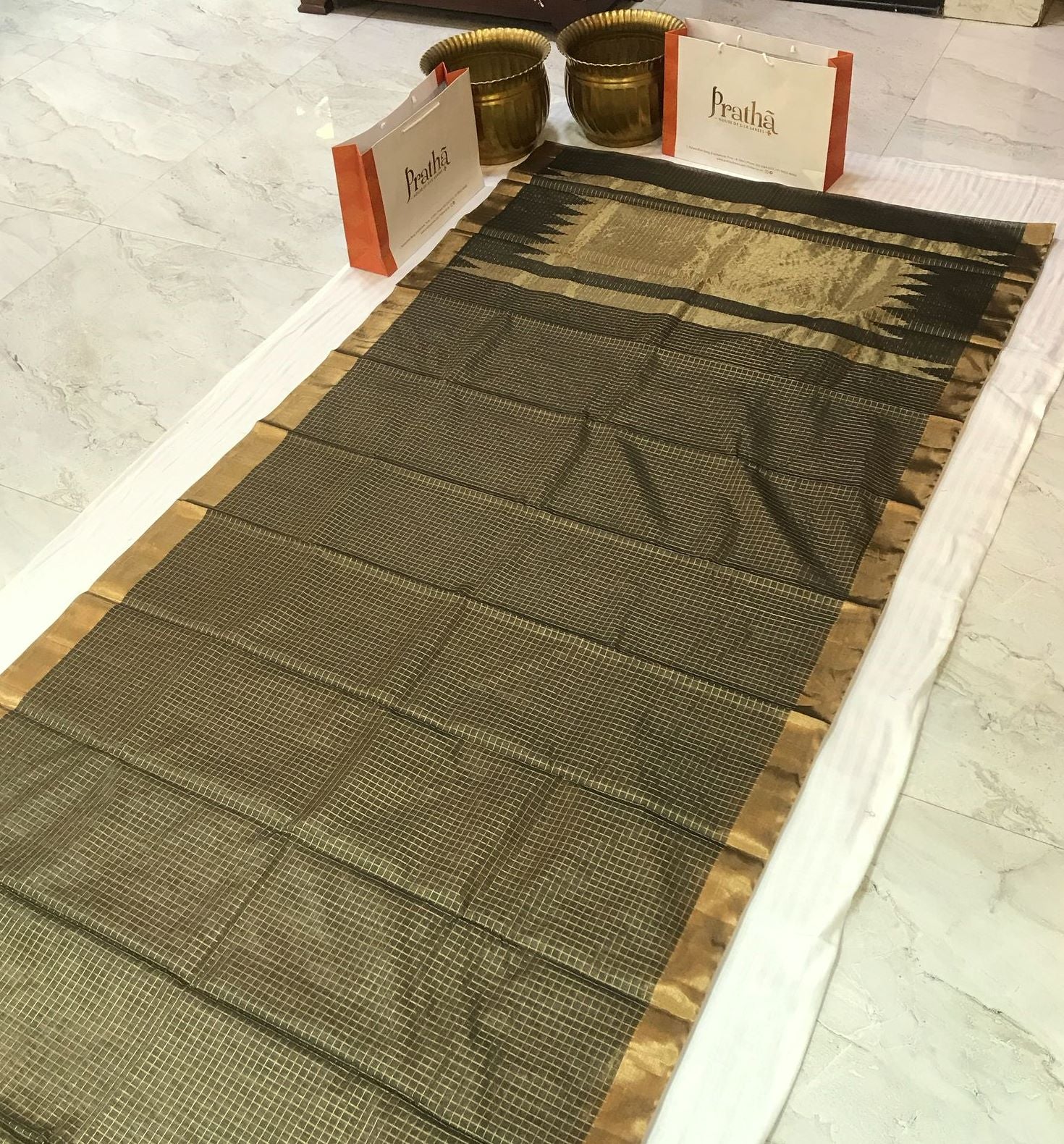 A very different type and beautiful combination of blackish-grey coloured Silk Cotton Traditional saree , perfect saree for summers! Don't miss the checks design without motifs with plain broad zari border is looks very outstanding and golden zari pallu. Light in weight and easy to drape.