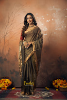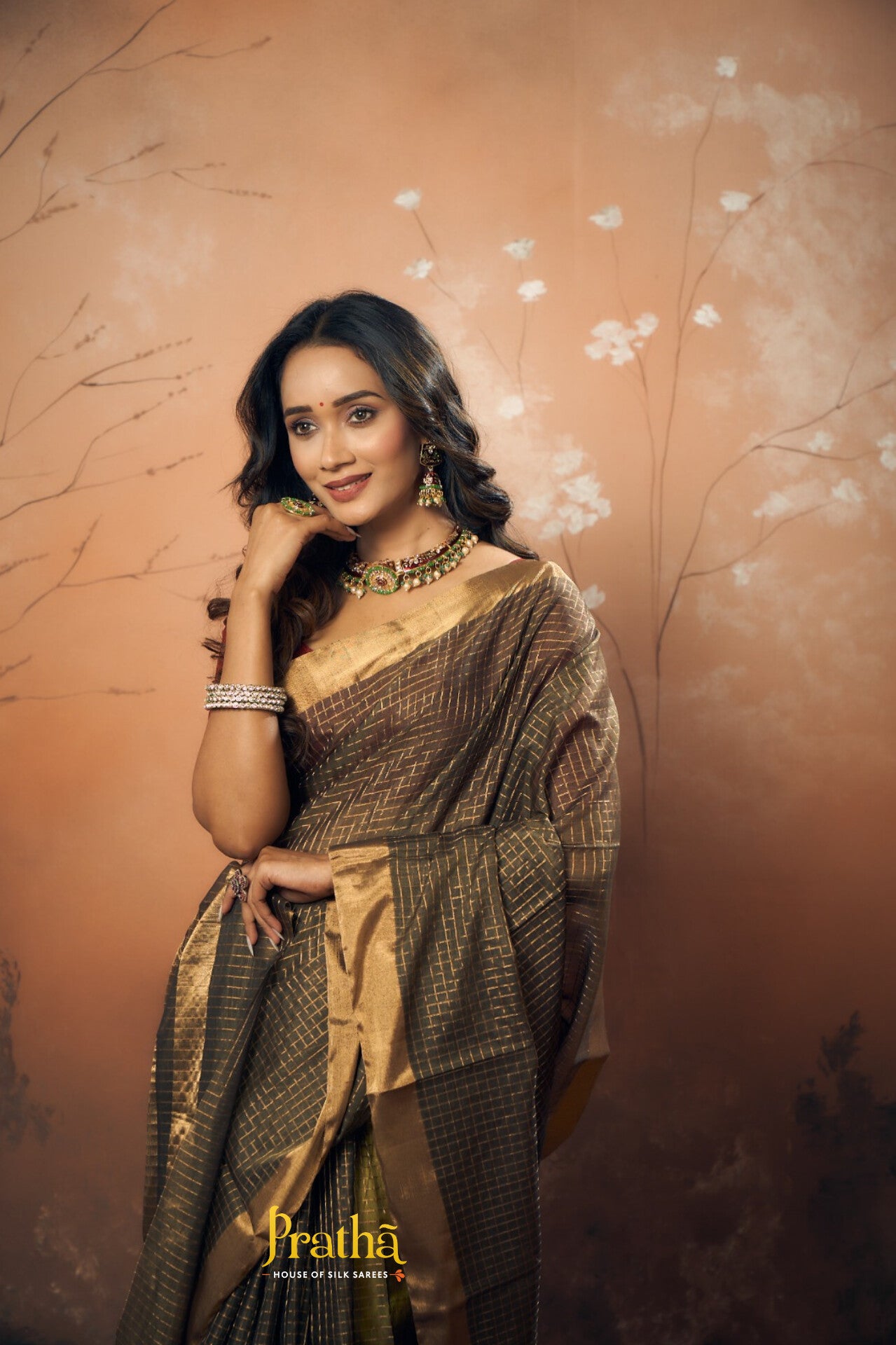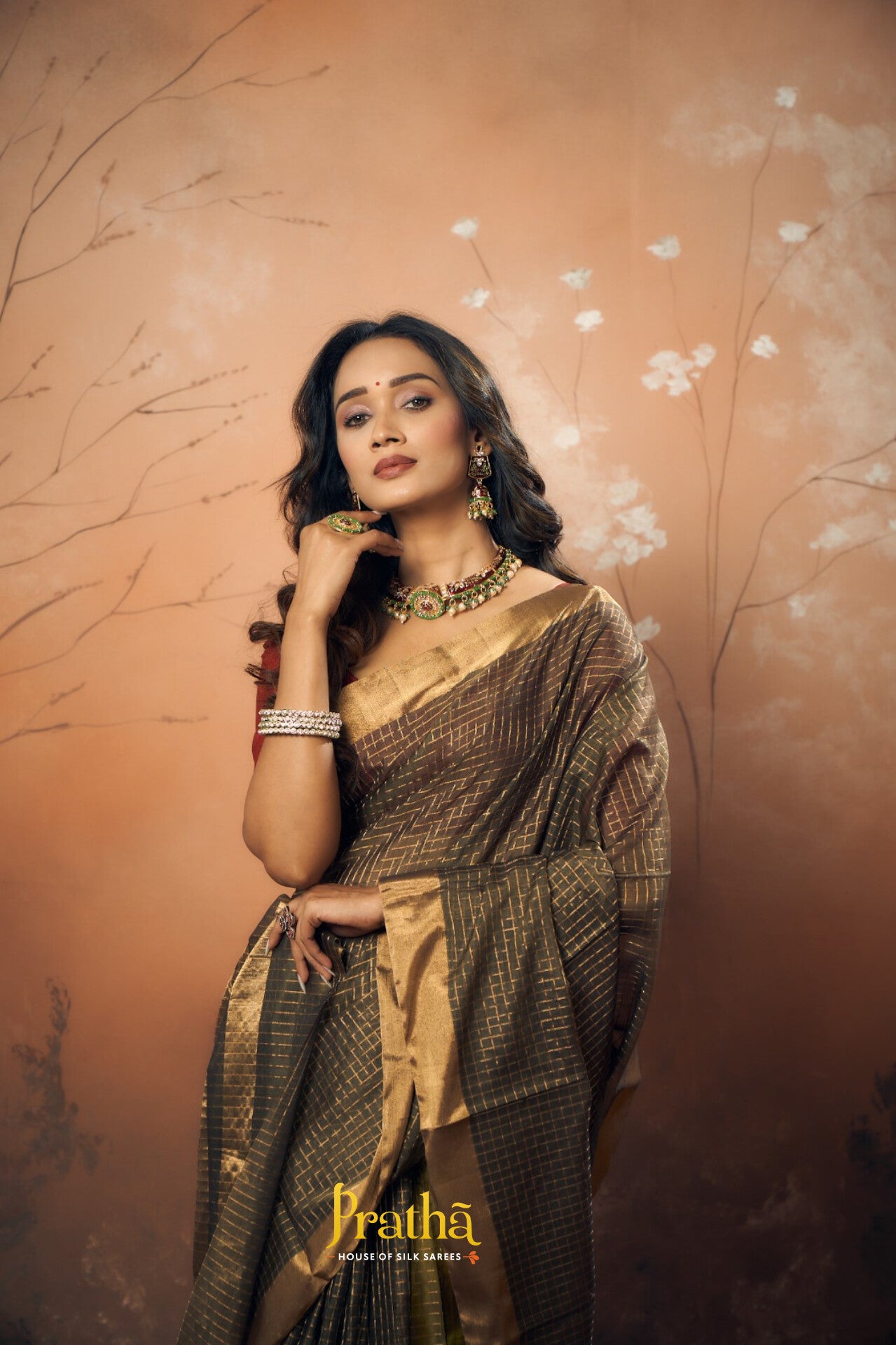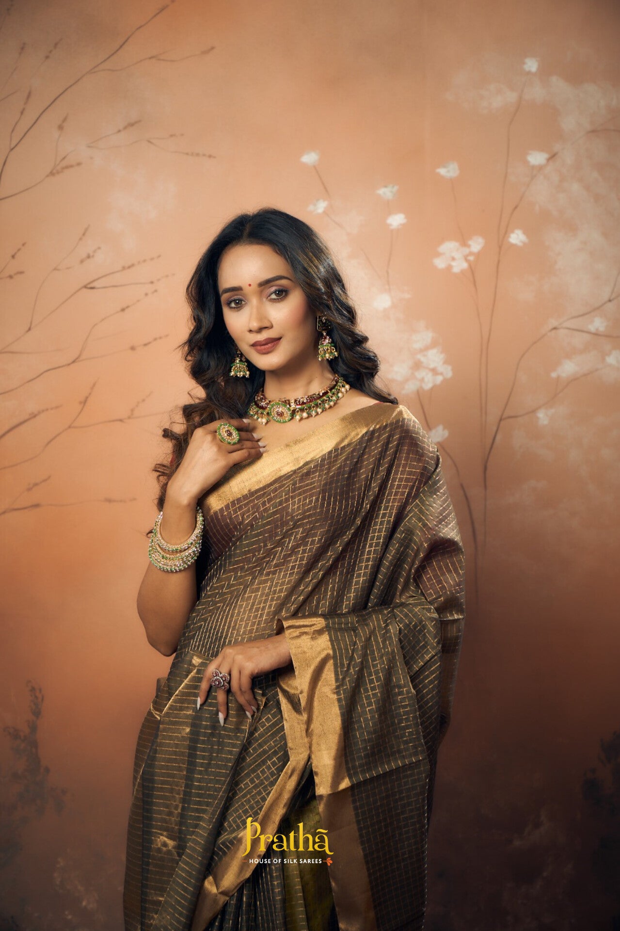 A very different type and beautiful combination of blackish-grey coloured Silk Cotton Traditional saree , perfect saree for summers! Don't miss the checks design without motifs with plain broad zari border is looks very outstanding and golden zari pallu. Light in weight and easy to drape.