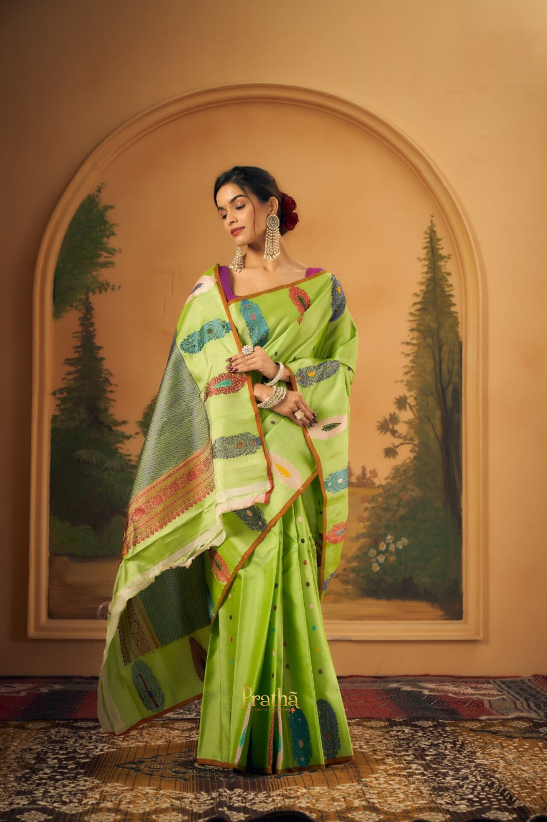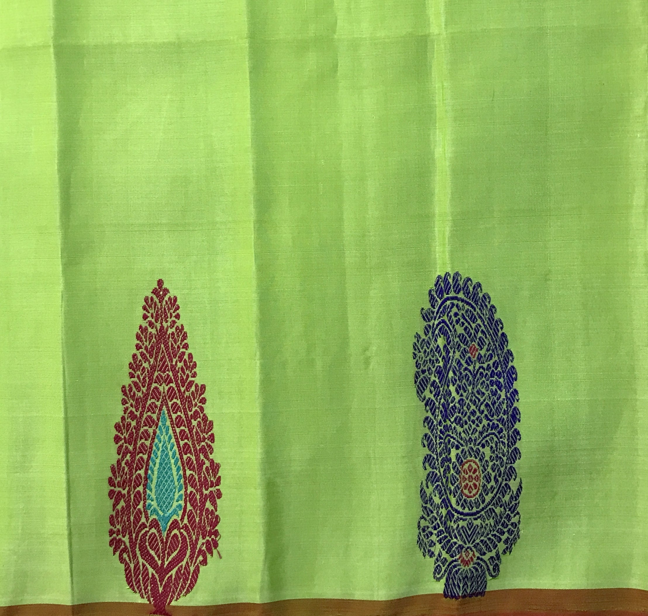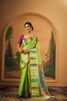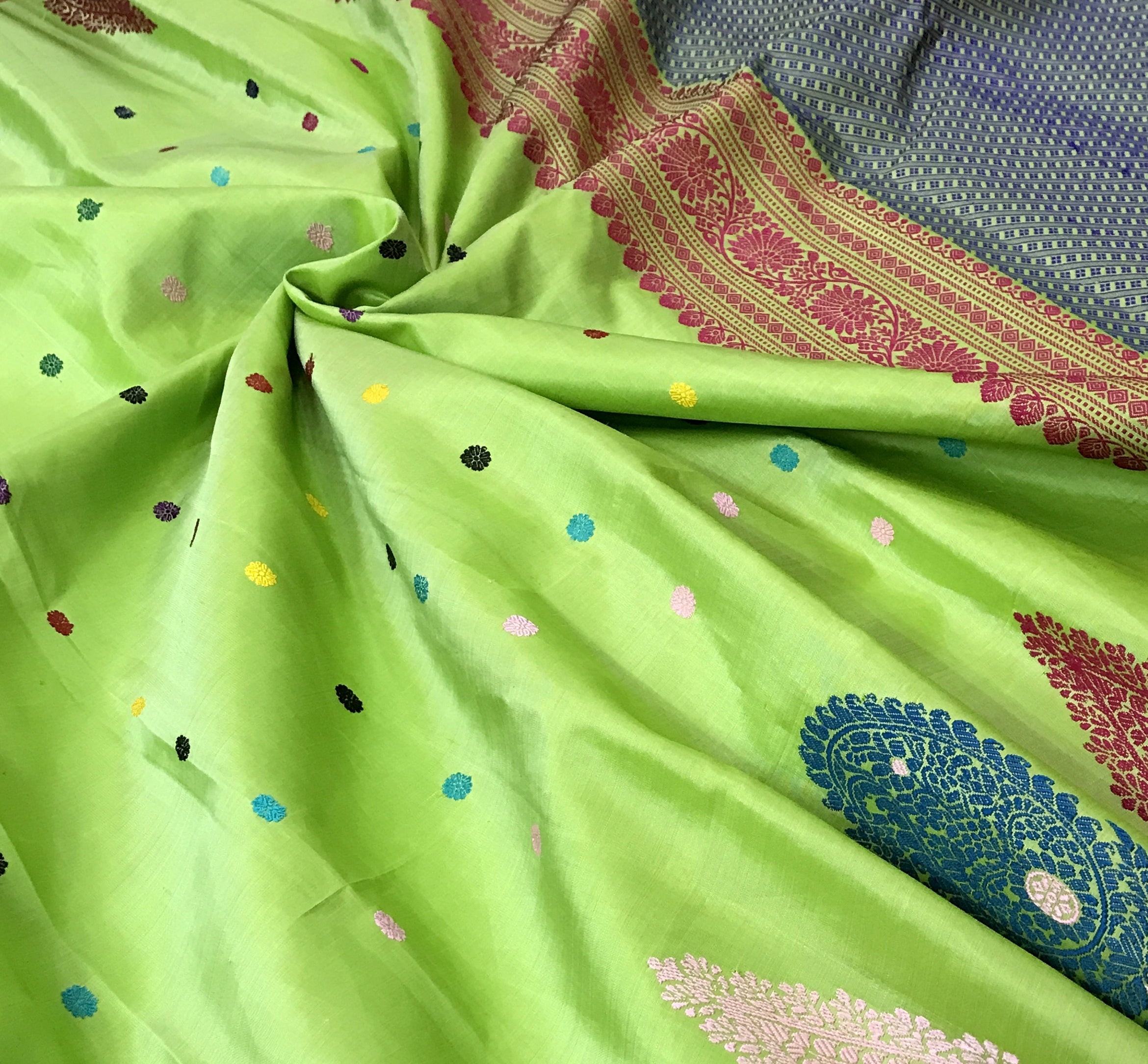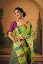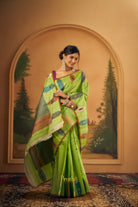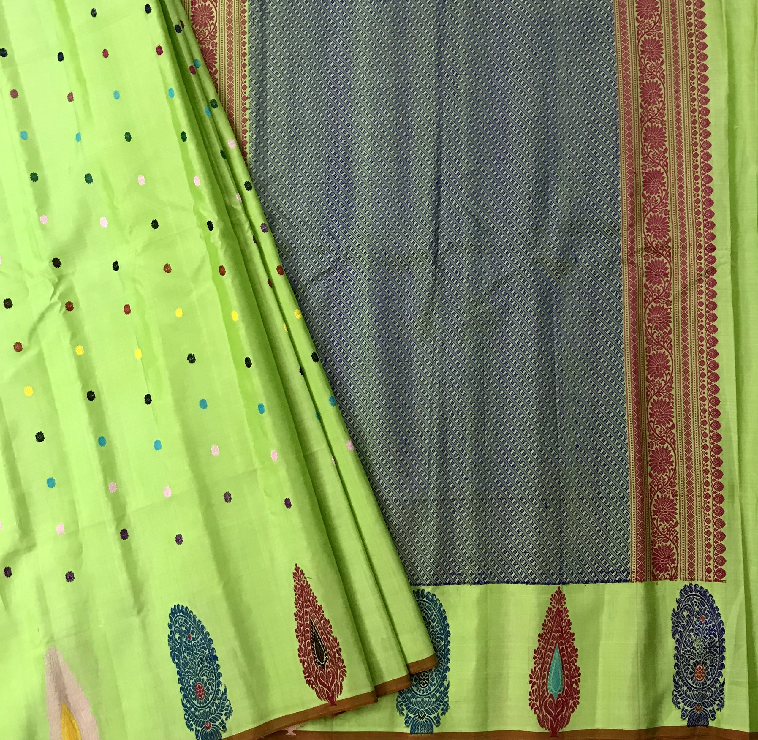 This refreshing saree comes in a vibrant lime green base, beautifully dotted with playful multicolour butti motifs that add a cheerful charm to the overall look. The saree is highlighted with a contrasting slate blue pallu featuring fine geometric weave, framed by a rich maroon and gold zari border that lends a traditional touch. The lower border is adorned with elegant paisley motifs in deep red and teal, adding a graceful and artistic finish. A perfect blend of bright hues and classic detailing, this saree is ideal for festive gatherings, cultural occasions, and elegant daytime celebrations.