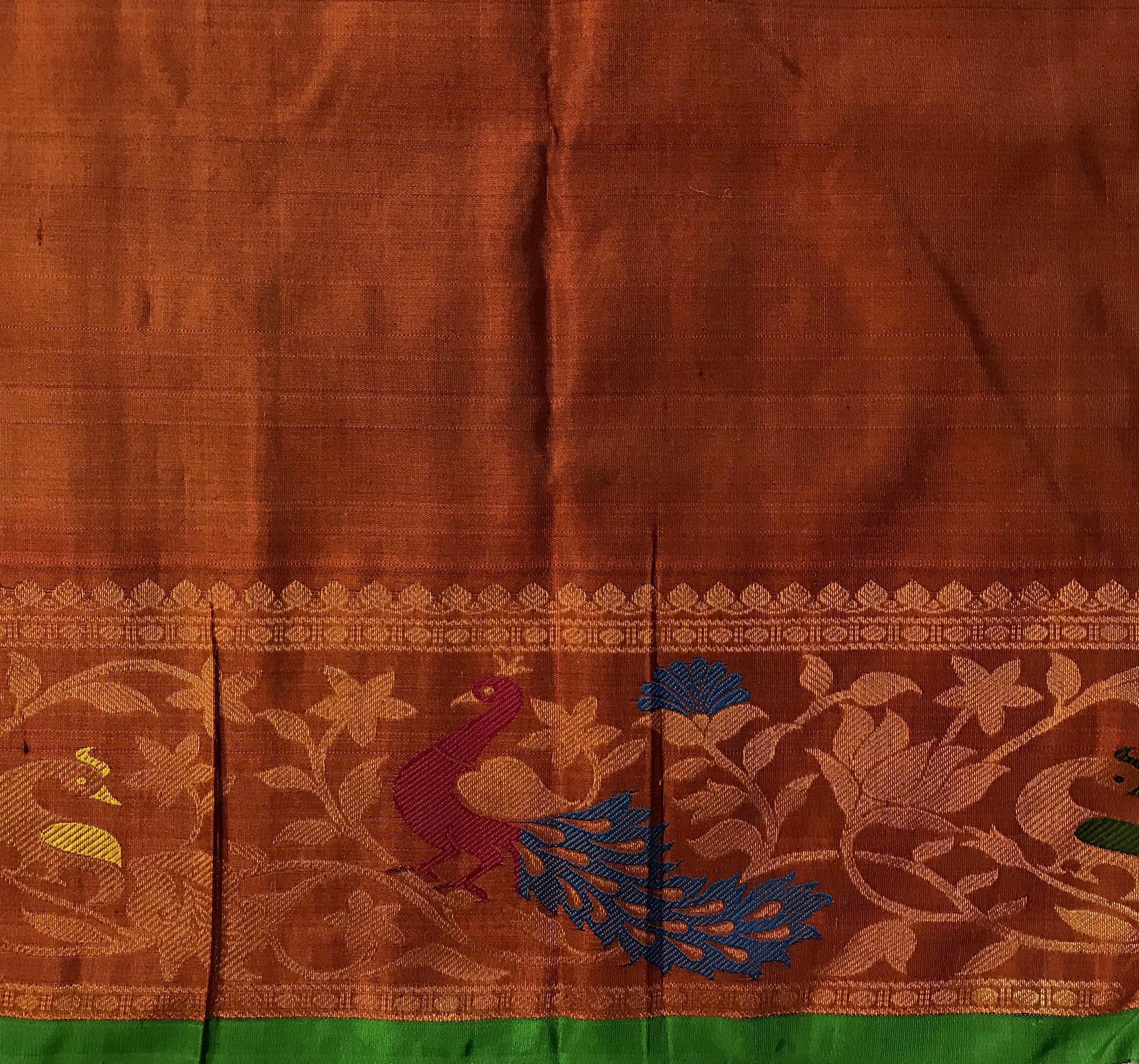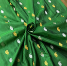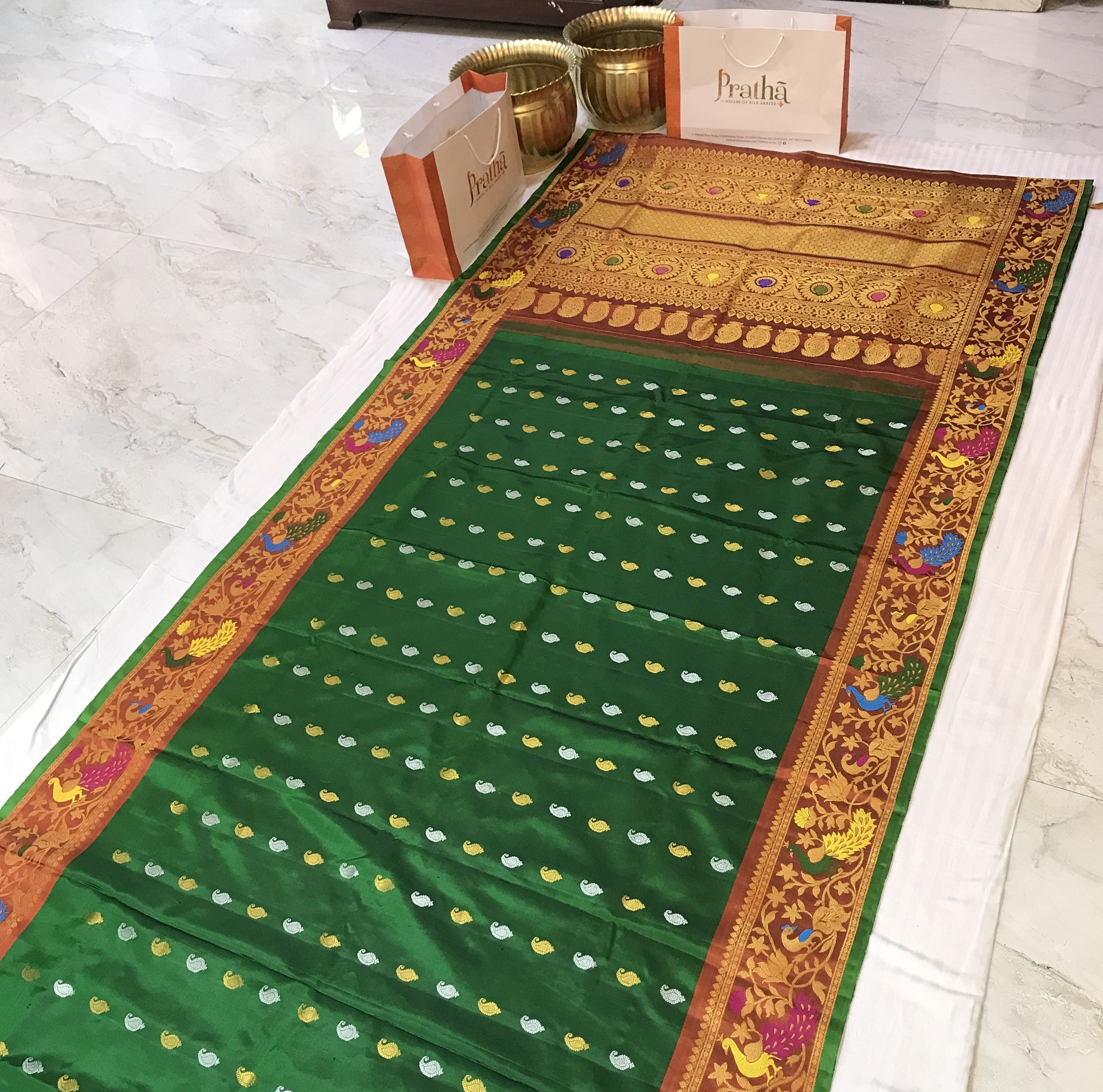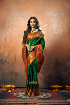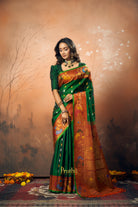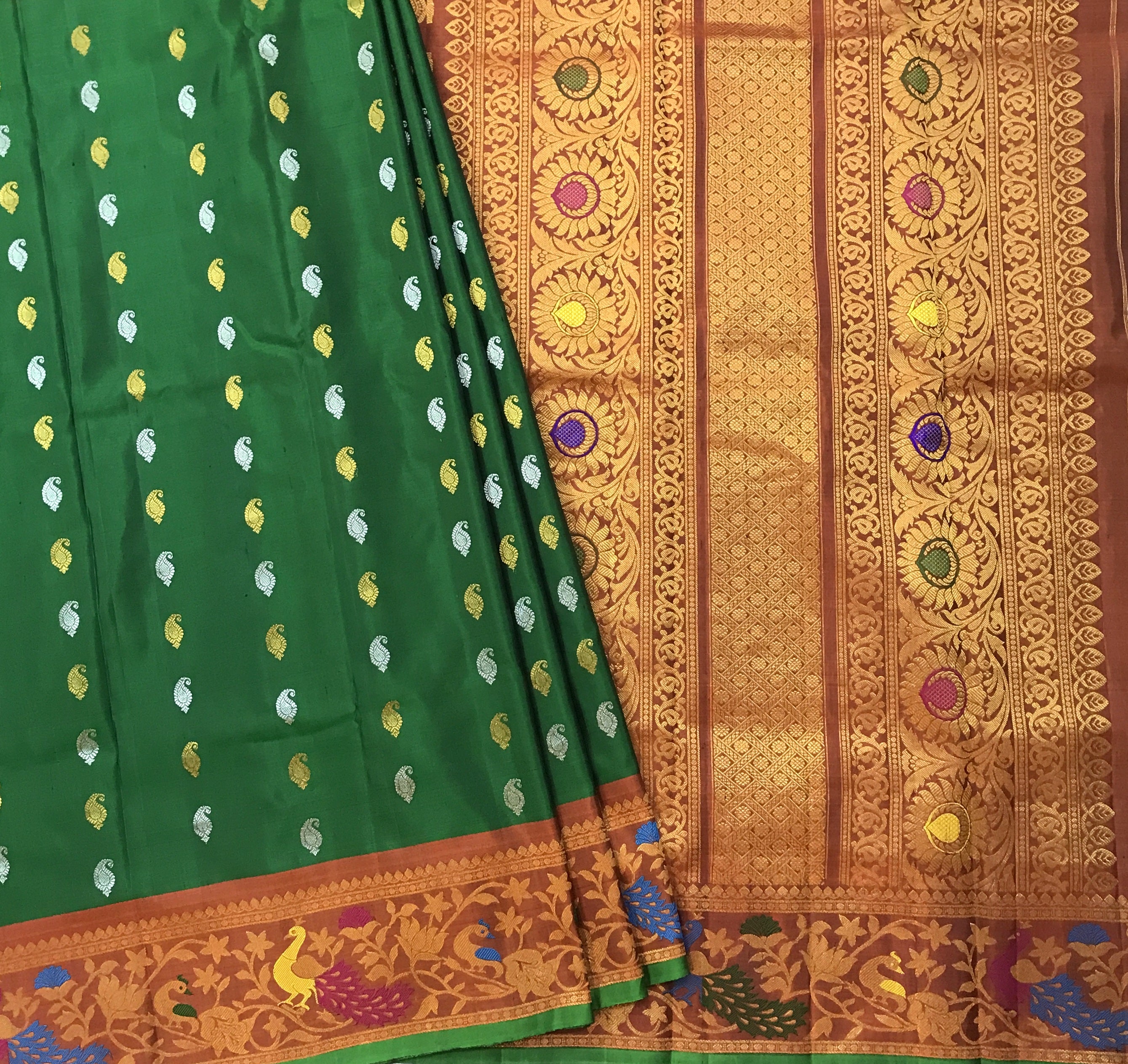 A very beautiful emerald green coloured 'designer border Gadhwal' reflects the weaver's dedication and hard work. The alternate koyari butti silver and gold looks stylish and gives this saree a vibrant and festive vibe The twin intricates borders, that is, a multicolor designer peacock border with beautiful meenakari, look distinctive and complementing each other. The beautiful shade of green goes so well with the blue!