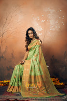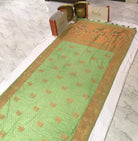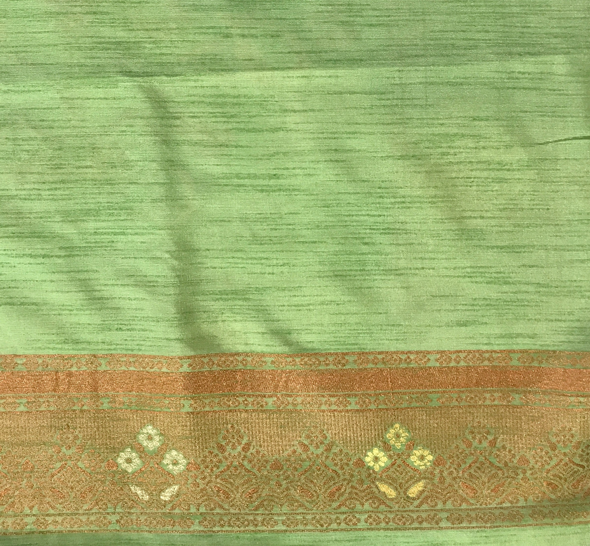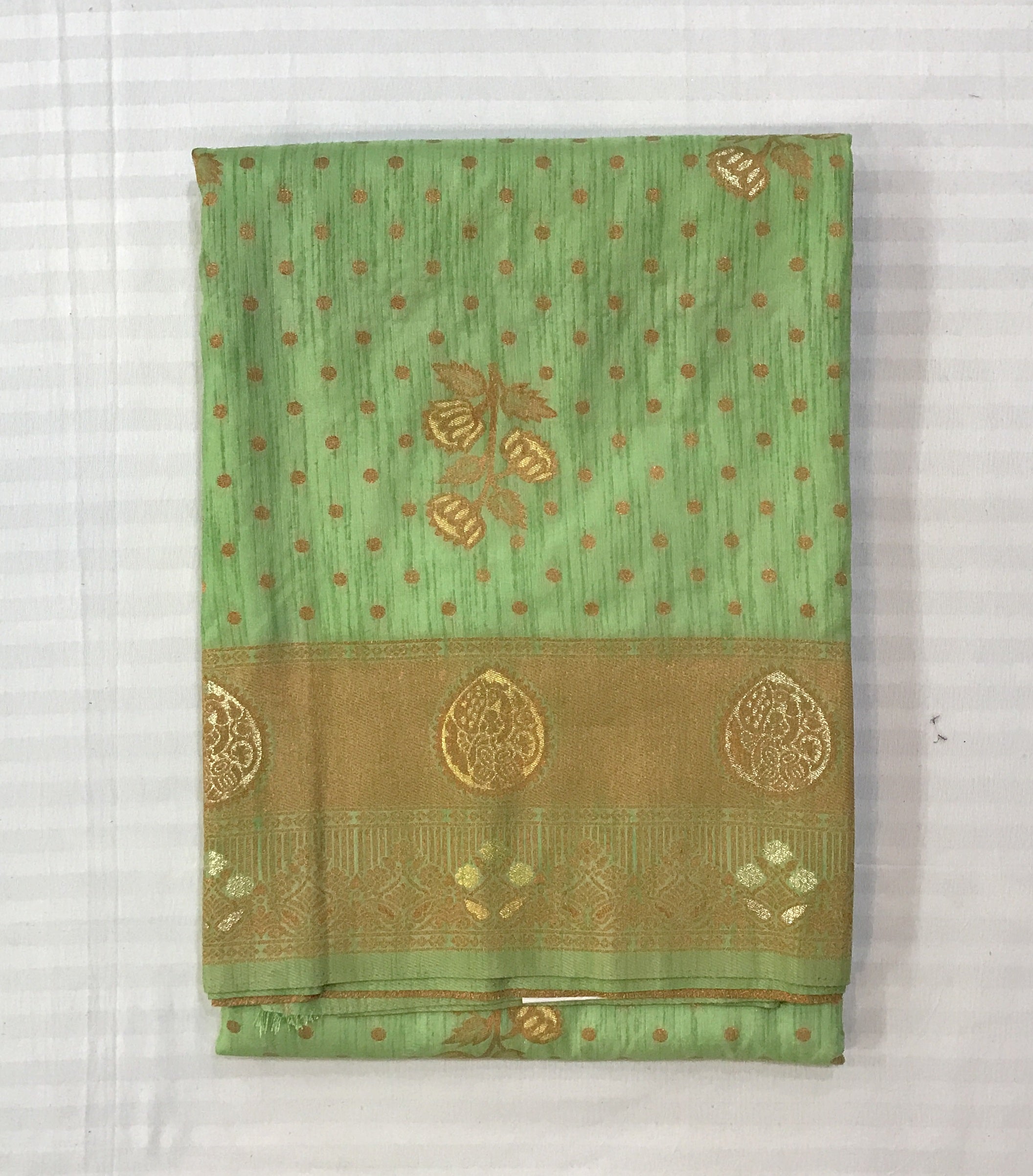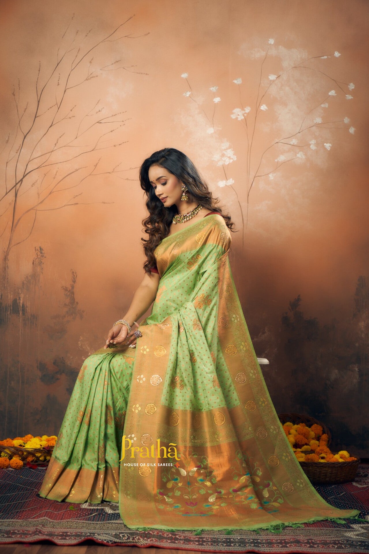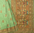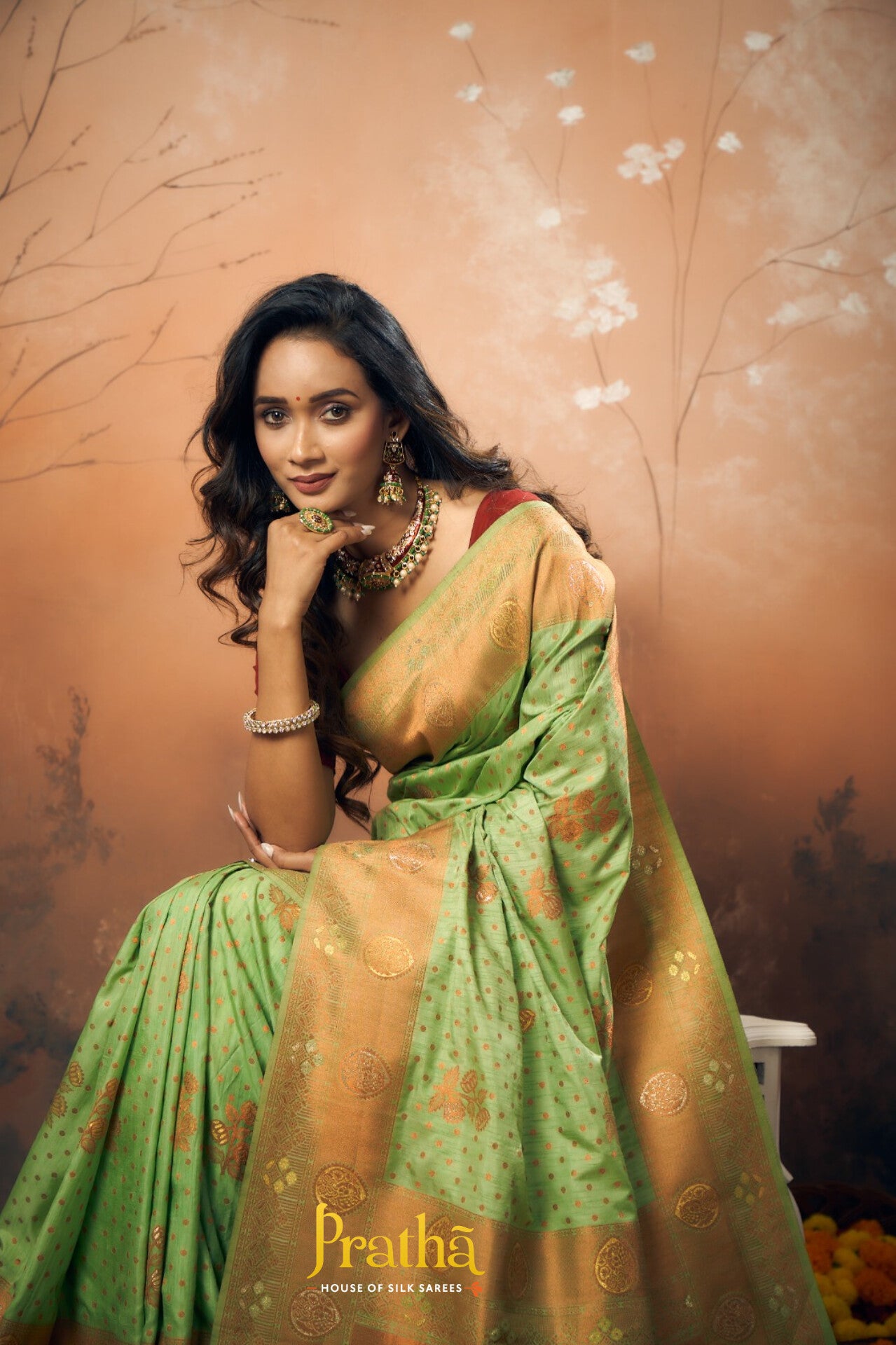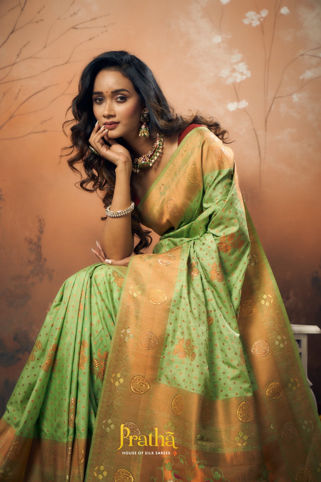 This graceful saree features a refreshing mint green body adorned with subtle dotted patterns and delicate floral buttis, lending it a soft and elegant charm. The contrasting warm brown pallu is beautifully enhanced with intricate multicolour floral and paisley motifs, showcasing fine craftsmanship. Finished with a refined zari border, this saree blends tradition with a gentle pop of colour, making it perfect for festive gatherings and special occasions.