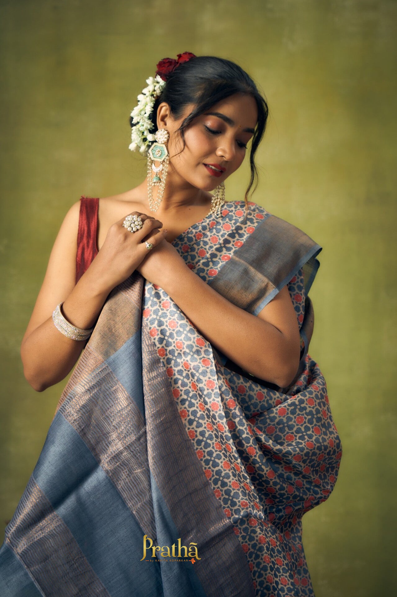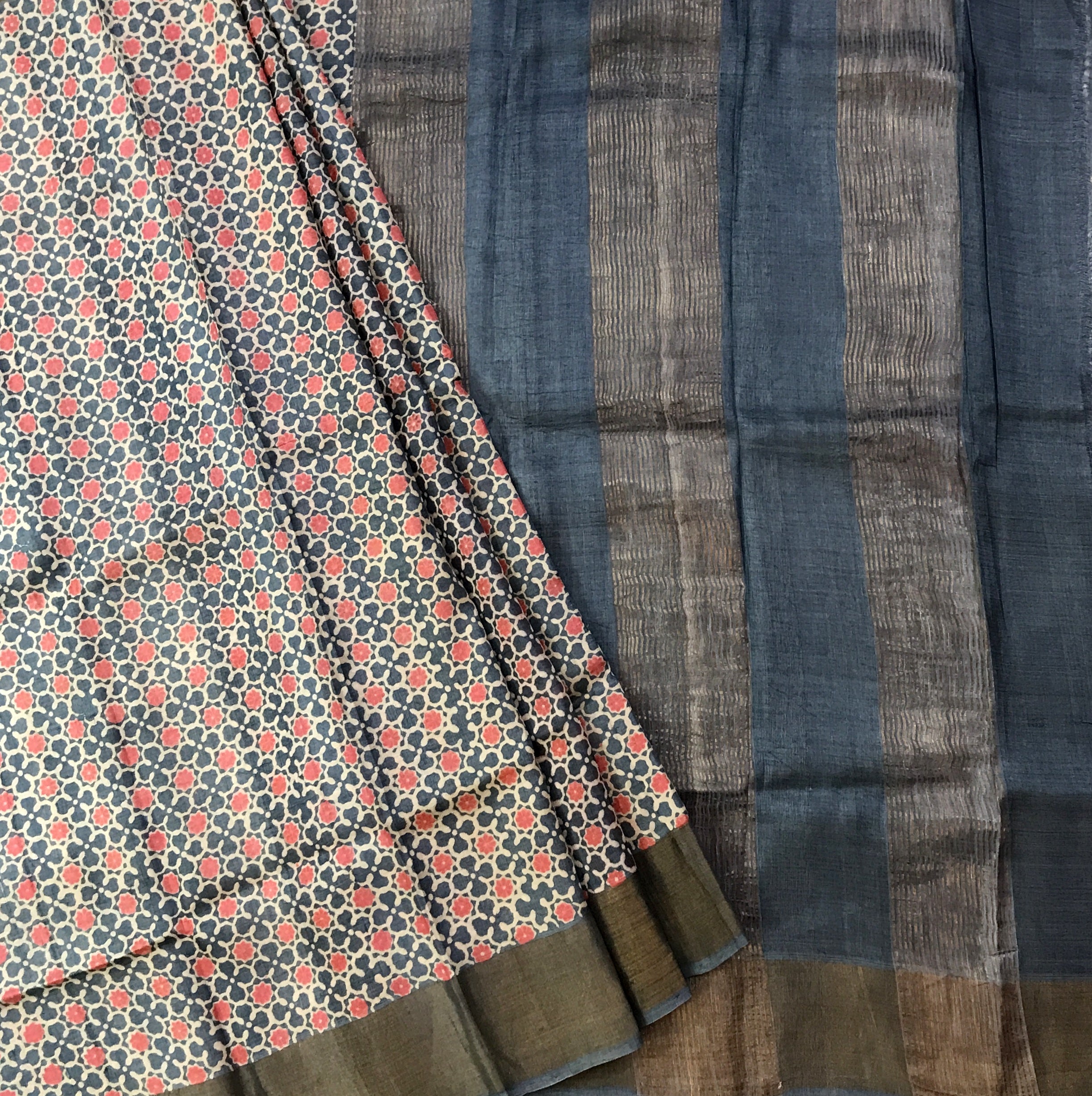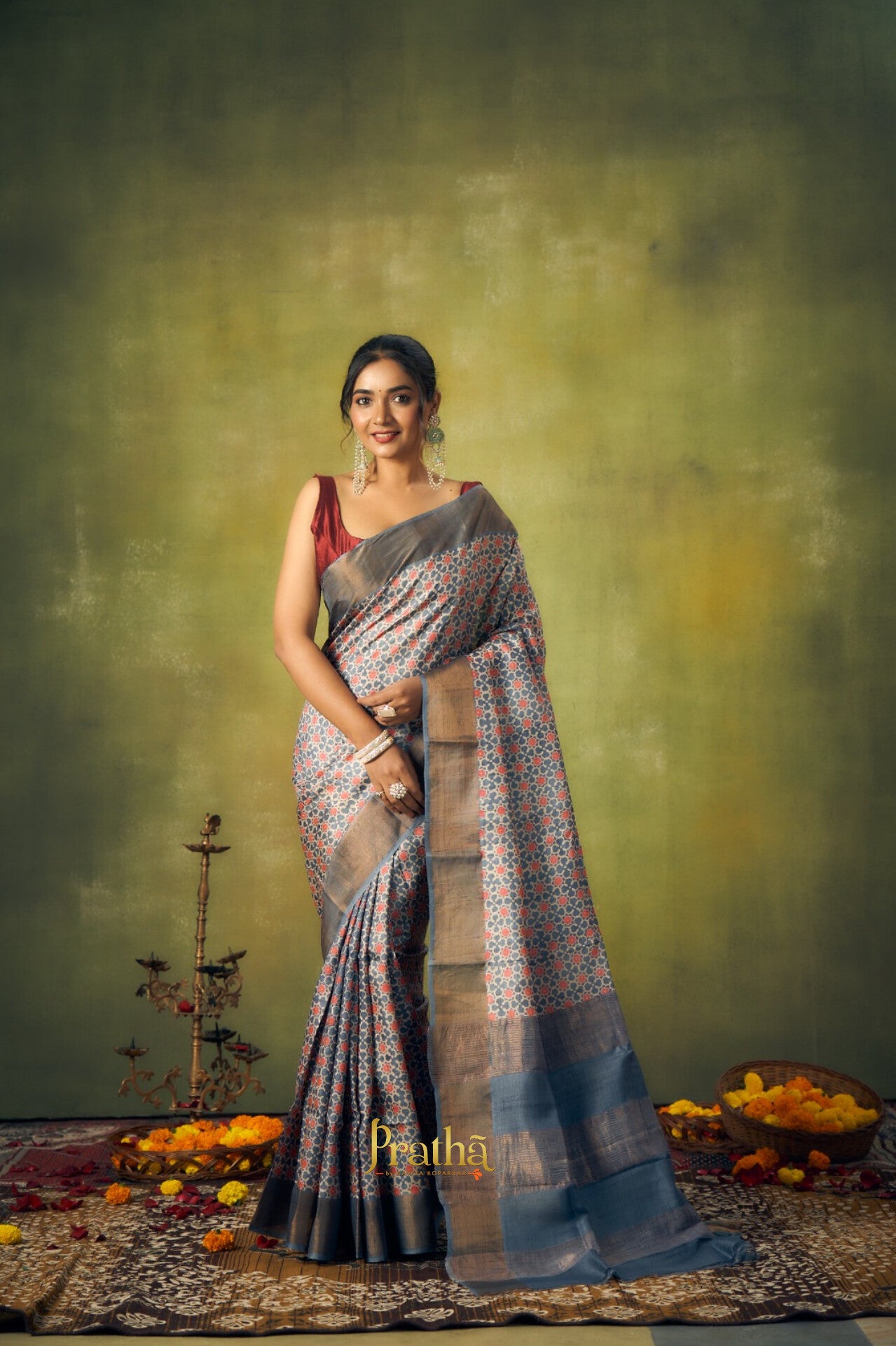This elegant saree features a beautifully printed body adorned with delicate geometric floral motifs in soft coral tones over a muted blue-grey base, creating a refined and graceful appeal. The contrast pallu stands out with subtle vertical stripes in deep blue and earthy hues, adding depth and character to the drape. Finished with a understated border that ties the design together, this saree is a perfect blend of traditional charm and contemporary sophistication, ideal for both casual elegance and special occasions.