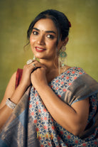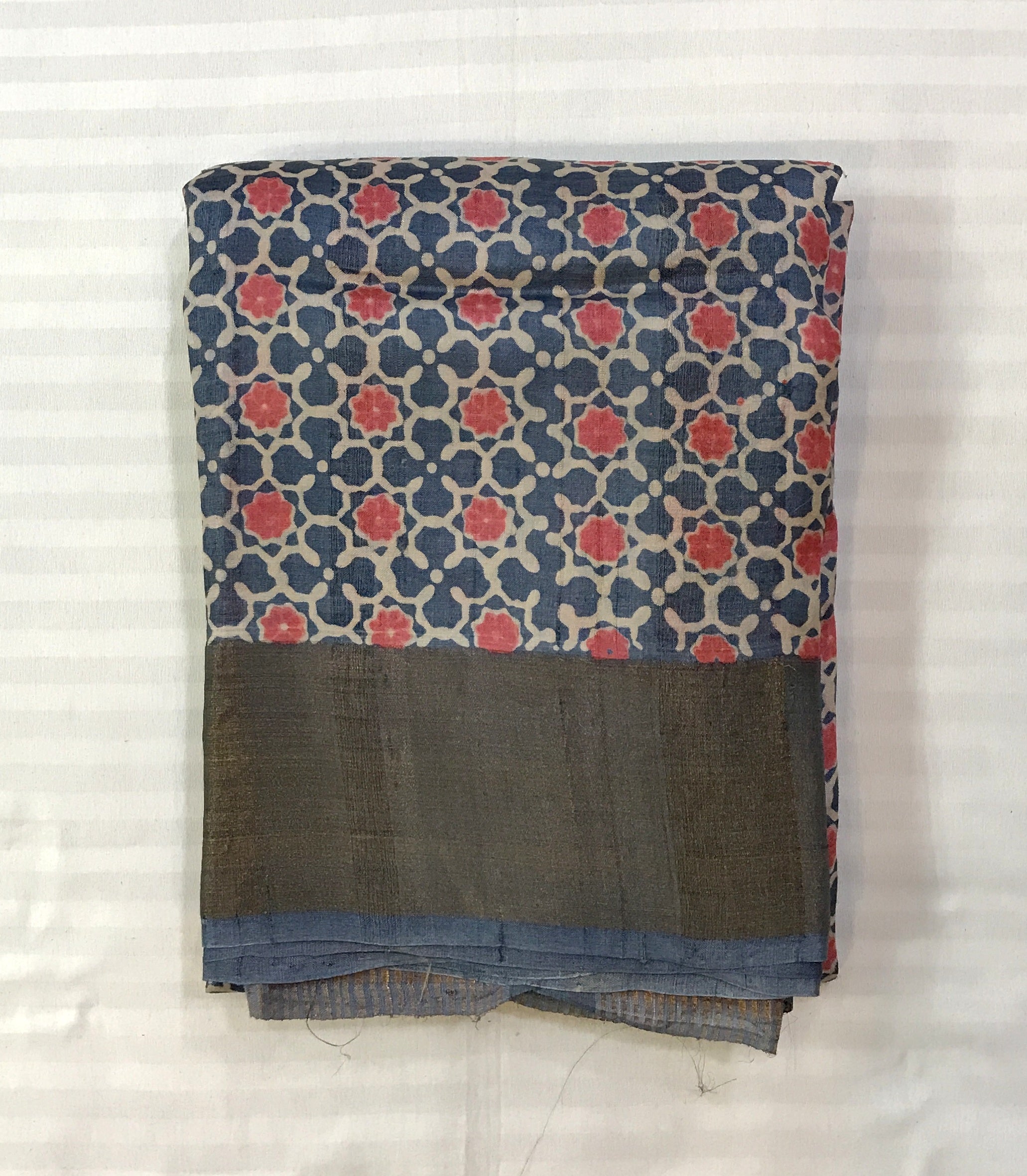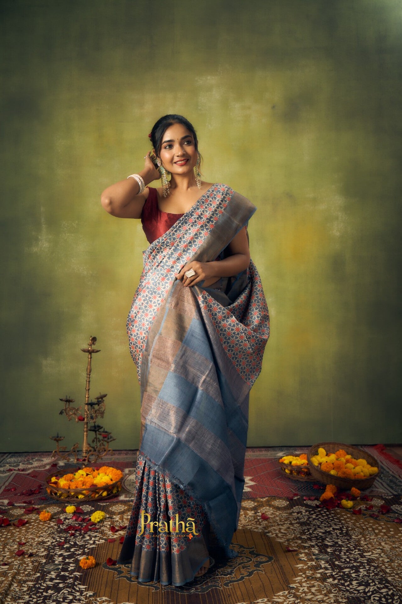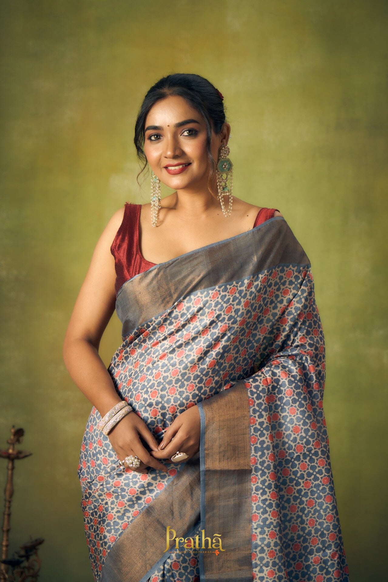 This elegant saree features a beautifully printed body adorned with delicate geometric floral motifs in soft coral tones over a muted blue-grey base, creating a refined and graceful appeal. The contrast pallu stands out with subtle vertical stripes in deep blue and earthy hues, adding depth and character to the drape. Finished with a understated border that ties the design together, this saree is a perfect blend of traditional charm and contemporary sophistication, ideal for both casual elegance and special occasions.