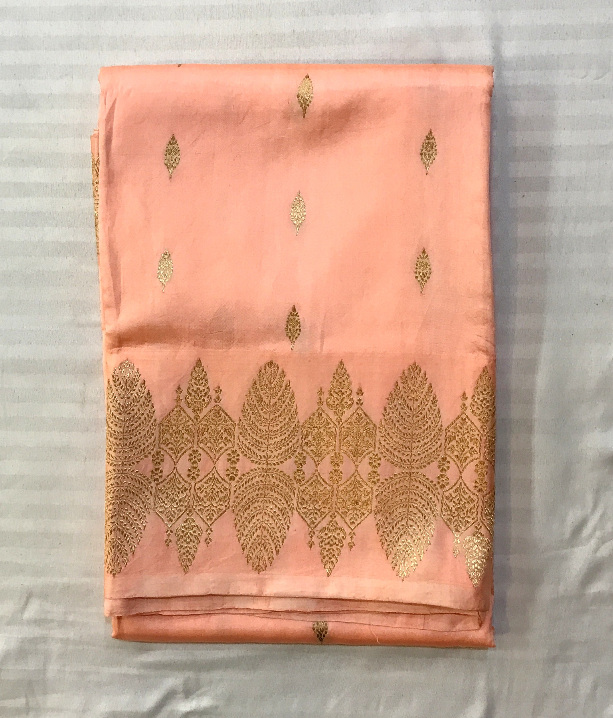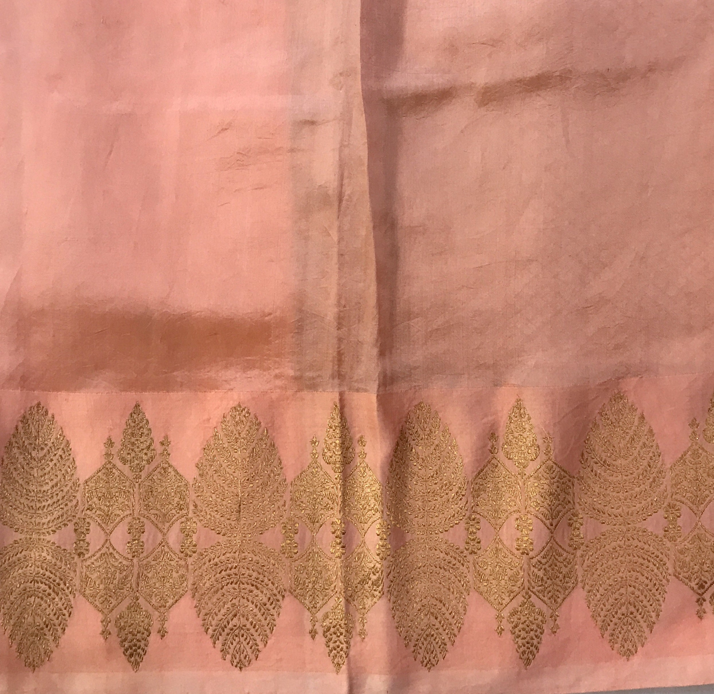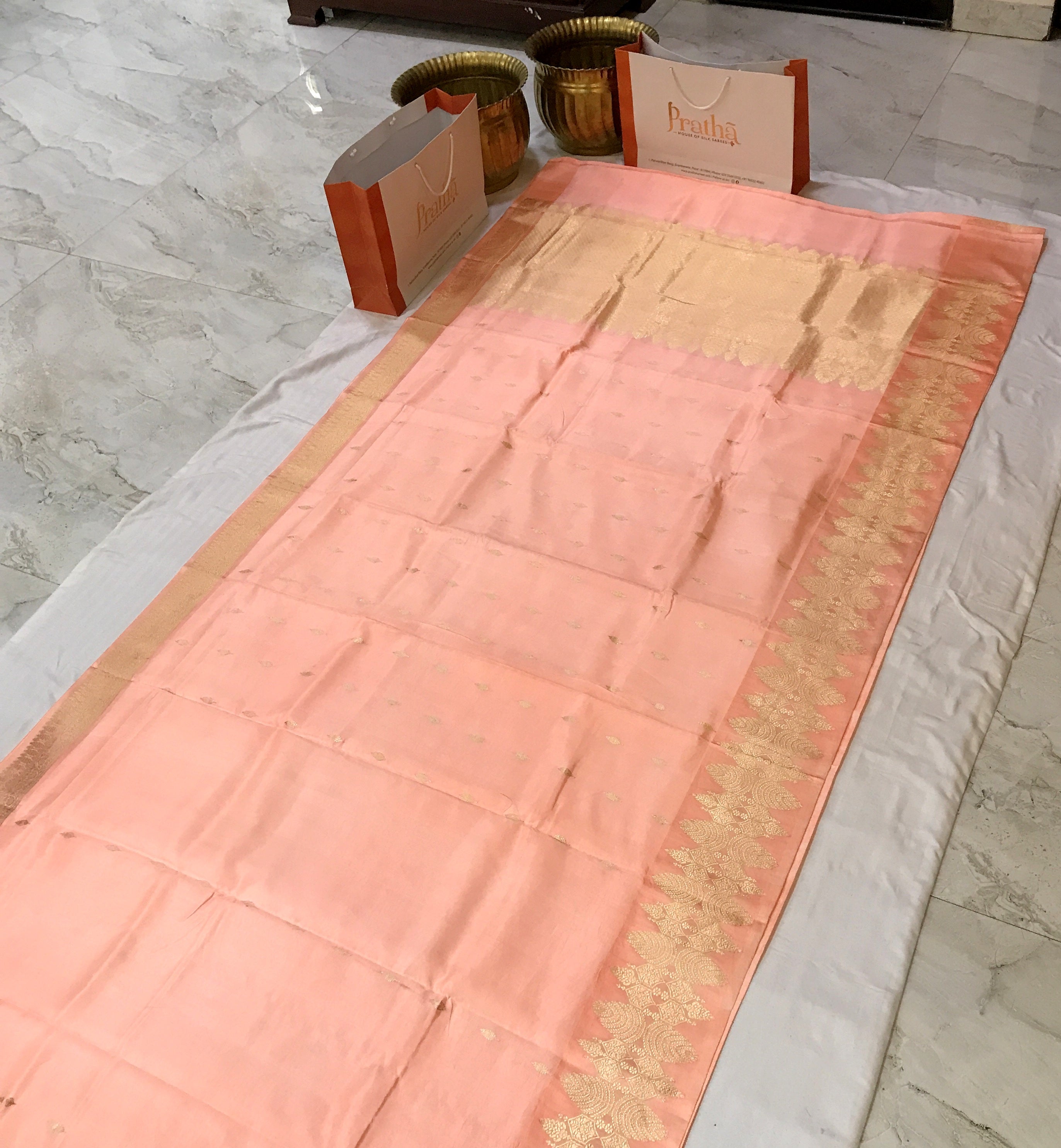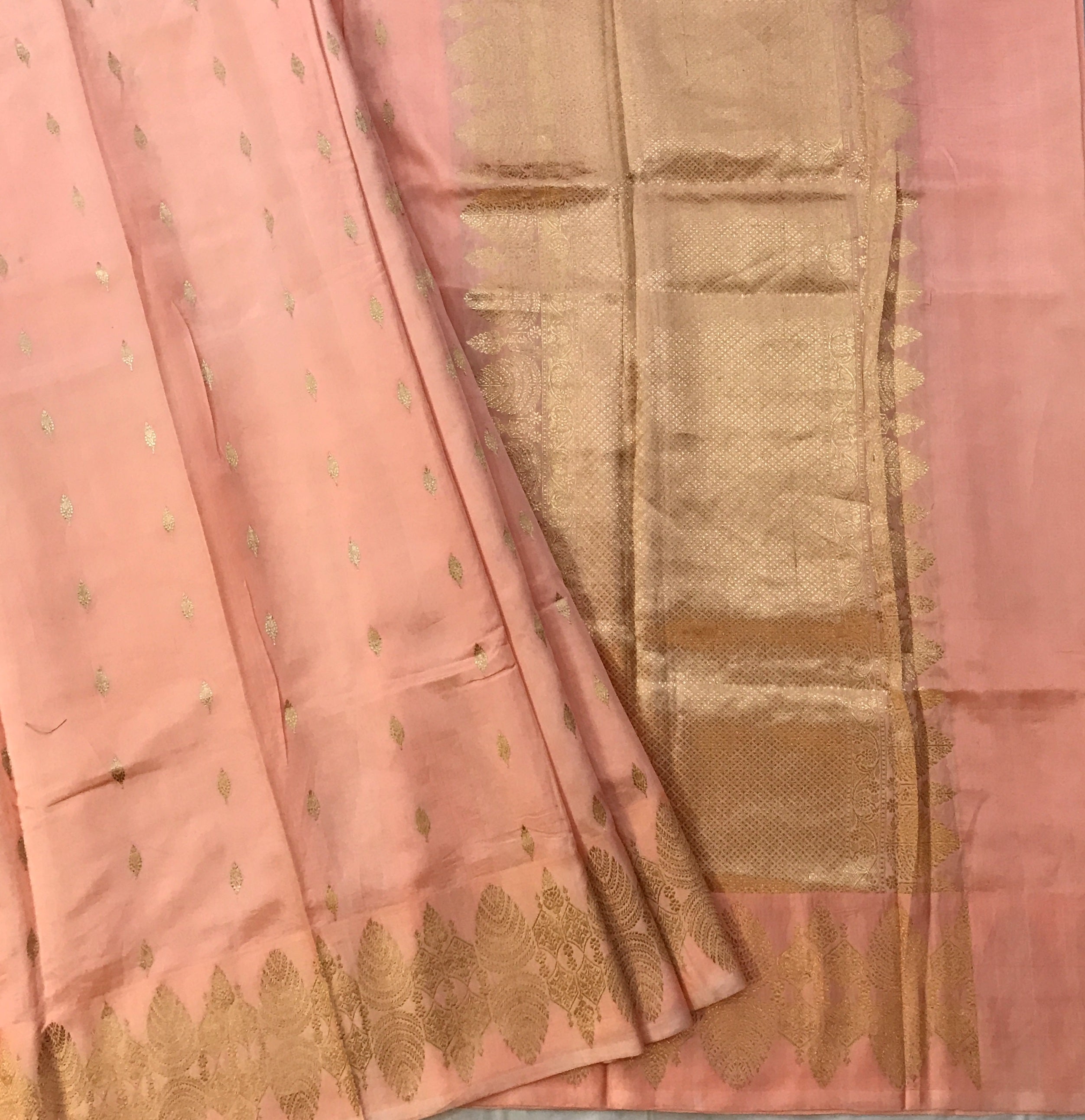 A graceful saree in a soft blush-pink hue, featuring delicate gold zari buta motifs scattered across the body, complemented by a rich golden pallu with finely woven traditional patterns and a subtle sheen; the saree is finished with an elegant gold zari border adorned with intricate leaf-inspired designs, creating a refined and timeless look ideal for festive and formal occasions.