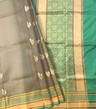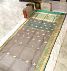 This grey Kora Banarasi saree exudes elegance with its exquisite golden zari work. The luxurious fabric, akin to organza silk. Adding to its charm, the saree is adorned with grand golden-silver zari buttis, creating a regal appeal. The highlight of this masterpiece is its breathtaking pallu, embellished with an intricate design that enhances its timeless beauty. A richly woven floral zari border lends the saree a splendid wedding and festive allure, while the classic Banarasi golden hue on the border adds an element of sophistication.