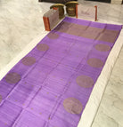 The image shows a traditional fabric, likely a saree, laid flat, featuring a soft lavender or light coral base with subtle tonal variations, small evenly spaced floral or star-like motifs, and large intricately patterned circular medallions, contrasted by a muted brown textured panel on one side with a fine decorative border, giving the lightweight, slightly sheer fabric an elegant and classic appearance.