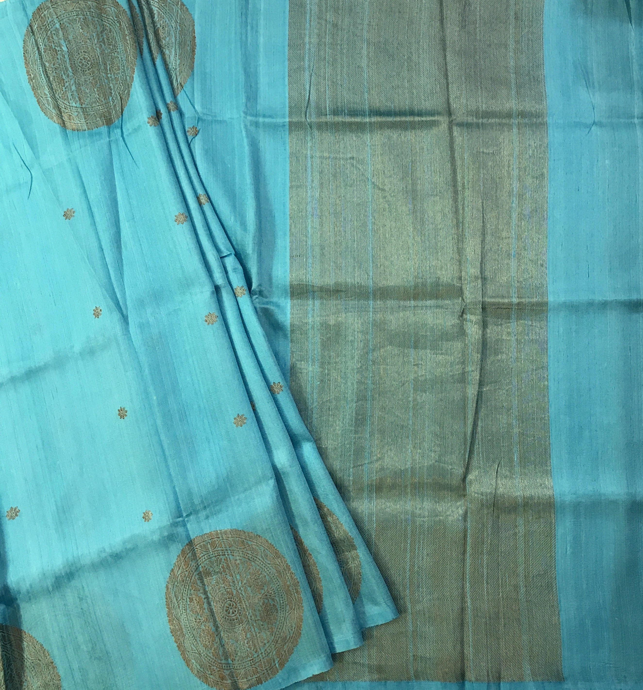 The image shows a traditional fabric, likely a saree, laid flat, featuring a soft sky-blue or light coral base with subtle tonal variations, small evenly spaced floral or star-like motifs, and large intricately patterned circular medallions, on one side with a fine decorative border, giving the lightweight, slightly sheer fabric an elegant and classic appearance.