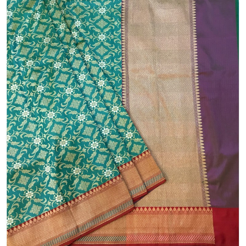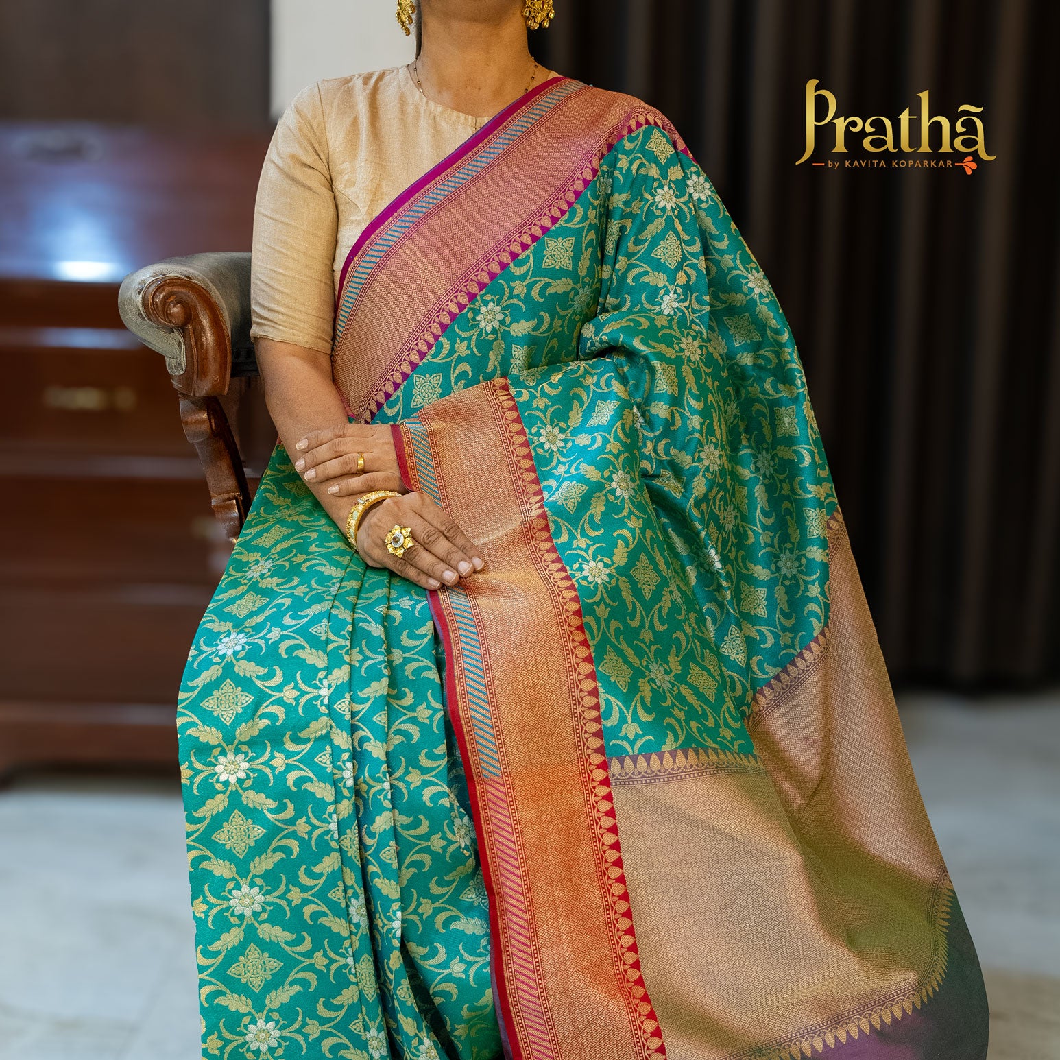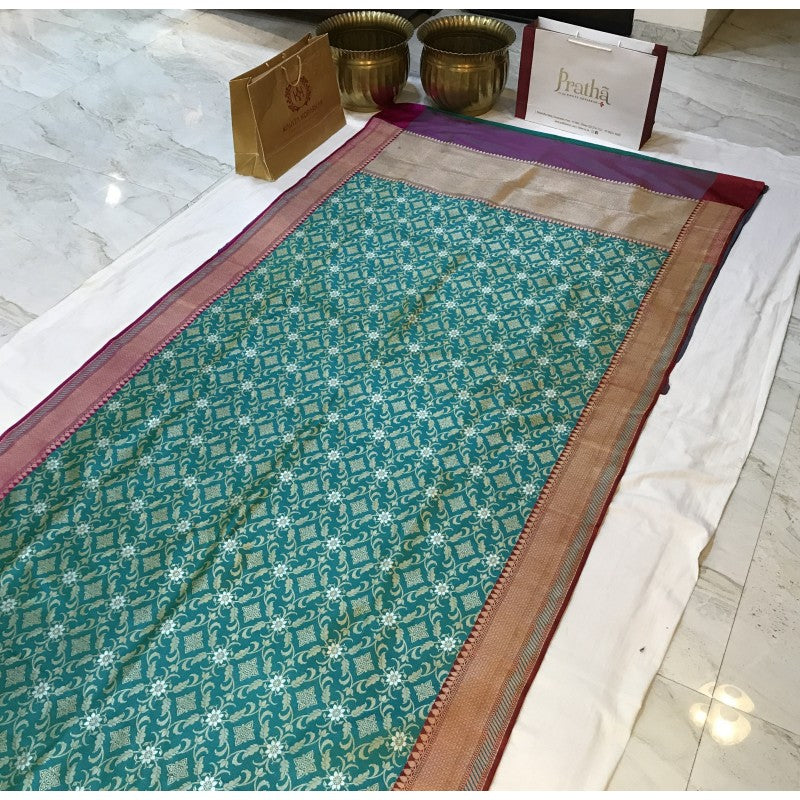 A beautiful shade of green in this Banarasi pure Kataan silk with beautiful brocade design, this saree is a stunner! The bold but rich and intricate design of the motifs in brocade is extremely unique. This brings out the festive vibe in this saree all the more. The zari colour- not too golden , not silver - makes this saree a true Banarasi !