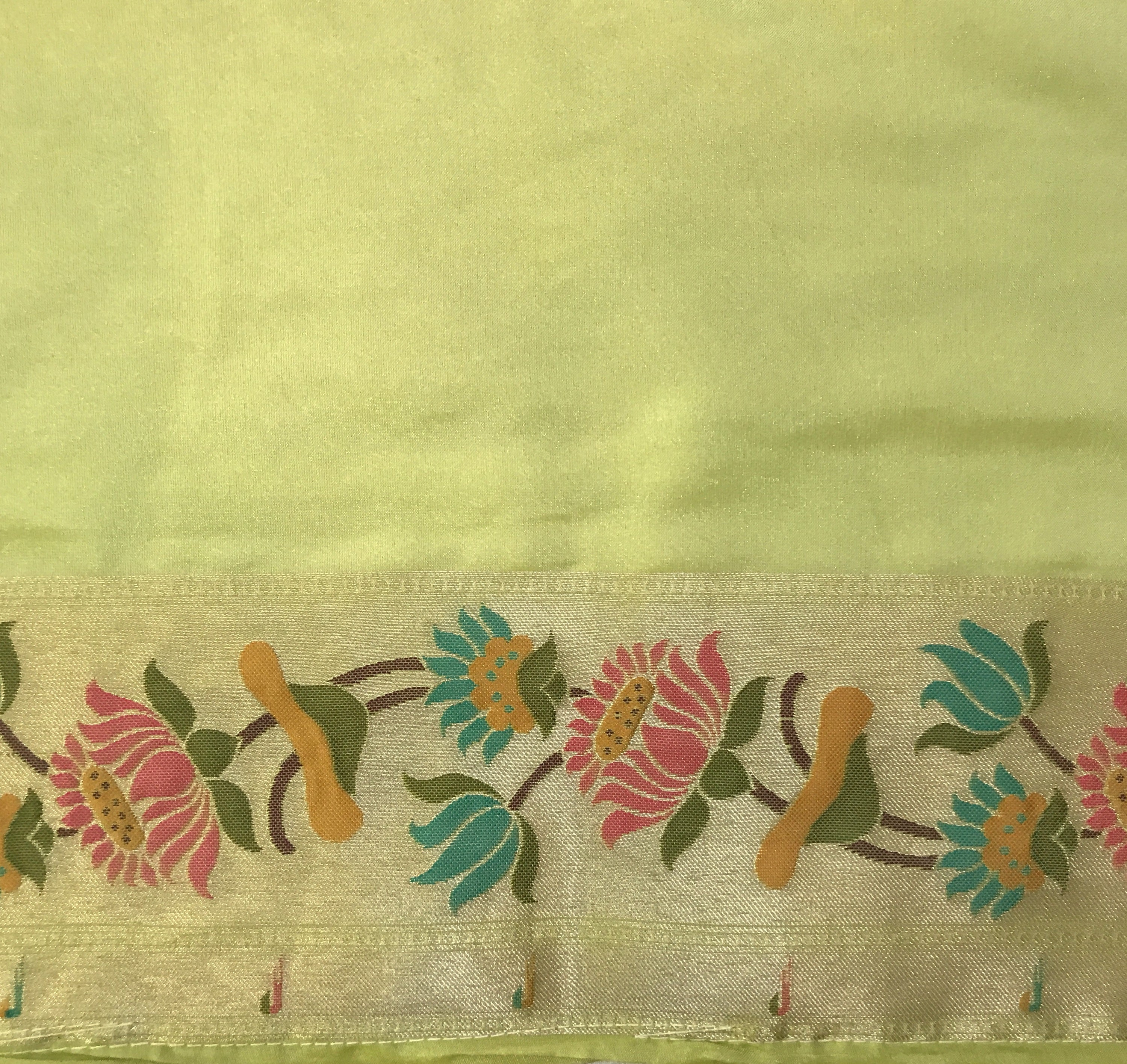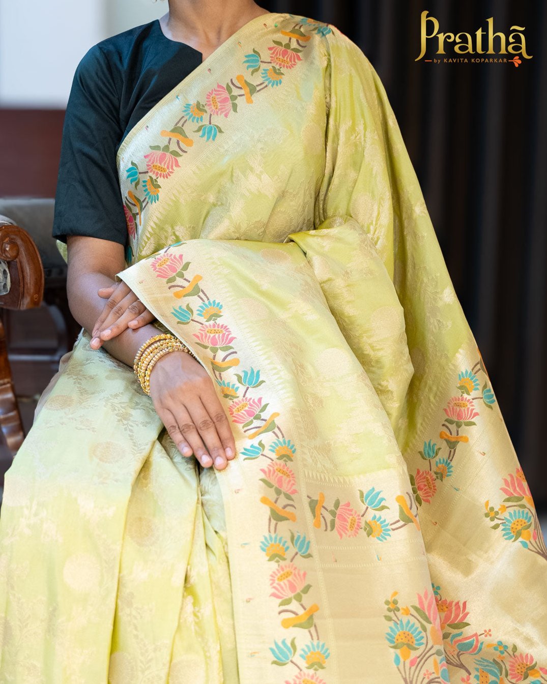 This is very beautiful lemon green with intricate floral ( Lotus motifs ) designed traditional silver zari border, this is a perfect for every festive occasion. This pure silk Brocade Banarasi saree weaving floral design all over, fits in perfectly into the traditional façade. This kind of saree will look great on a bride or on any of your most special days as well as gifting purpose!