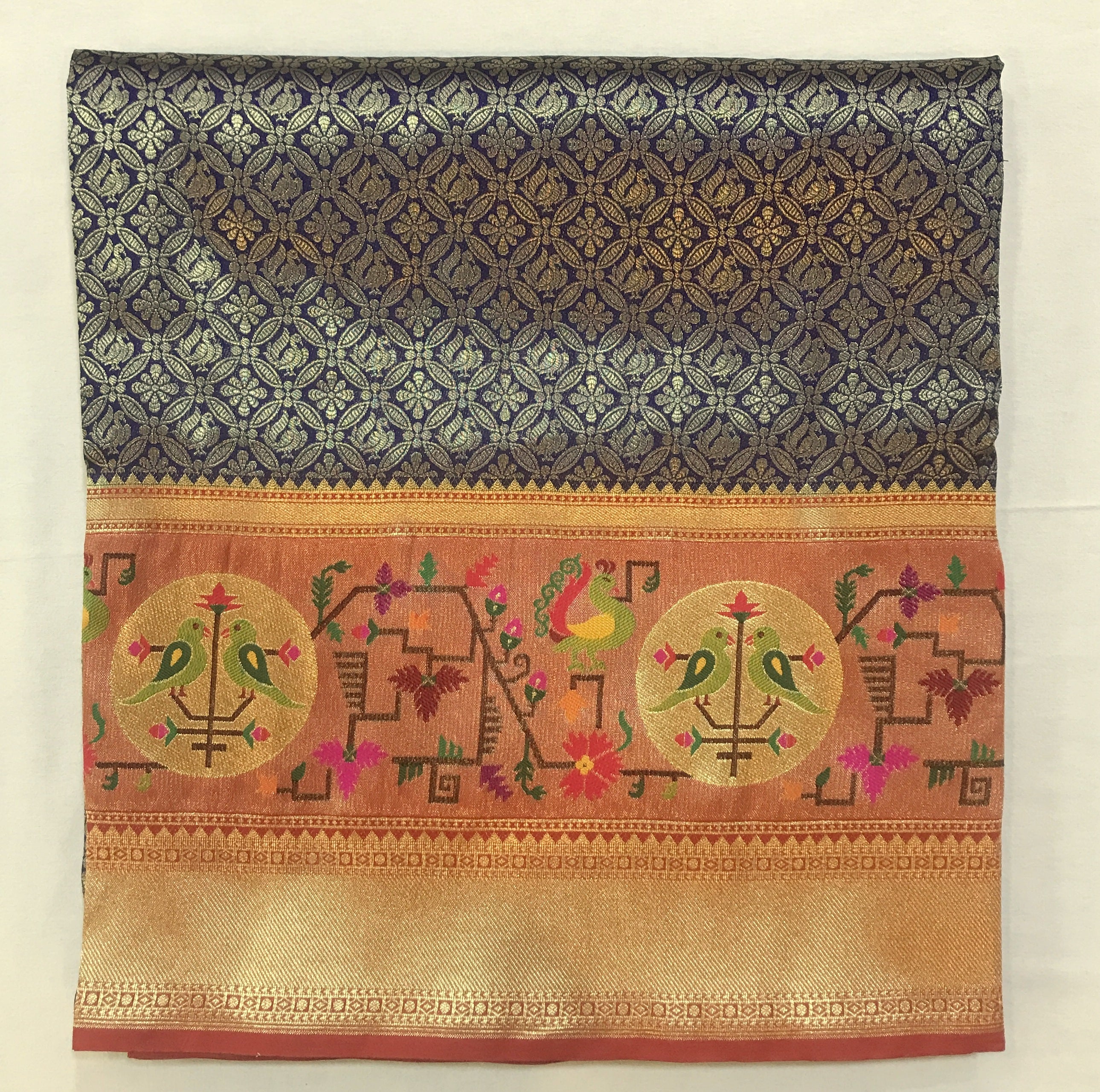 It's a fusion of Banarasi and Paithani saree. A very pretty shade of purple-blue power loom Banarasi saree with golden zari brocade design all over the weave, this saree is a stunner! The unique colour makes you stand out! It has a different shaped floral-peacock butti design all over the saree. Do not miss that, this Banarasi saree with specially inspired paithani border and zari pallu looks different and attractive.