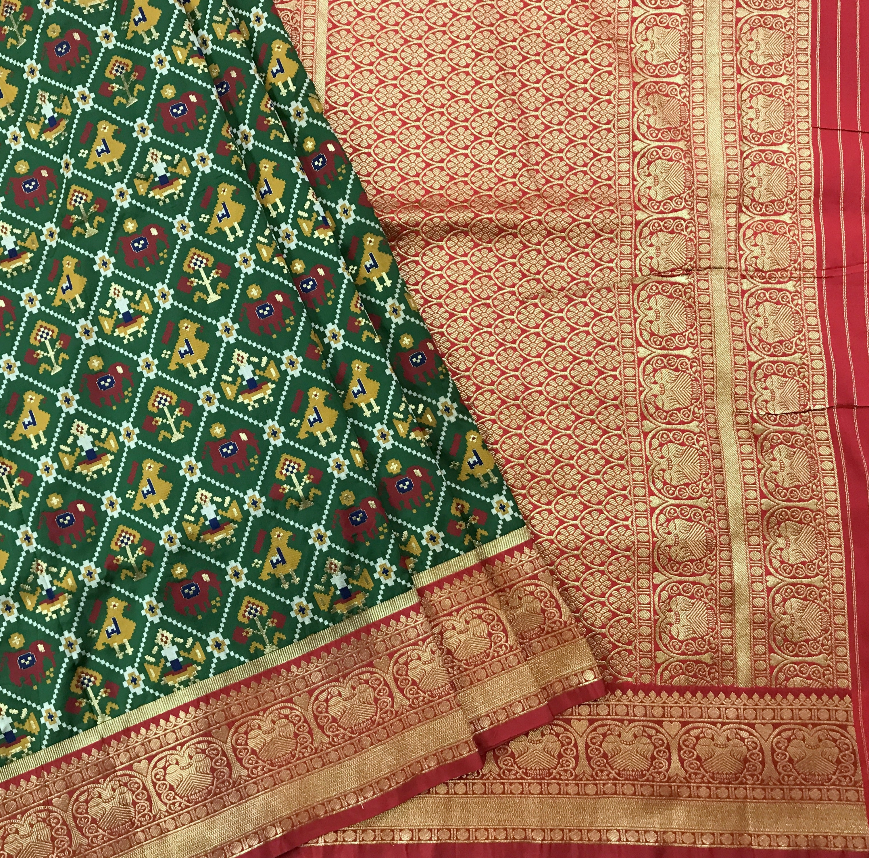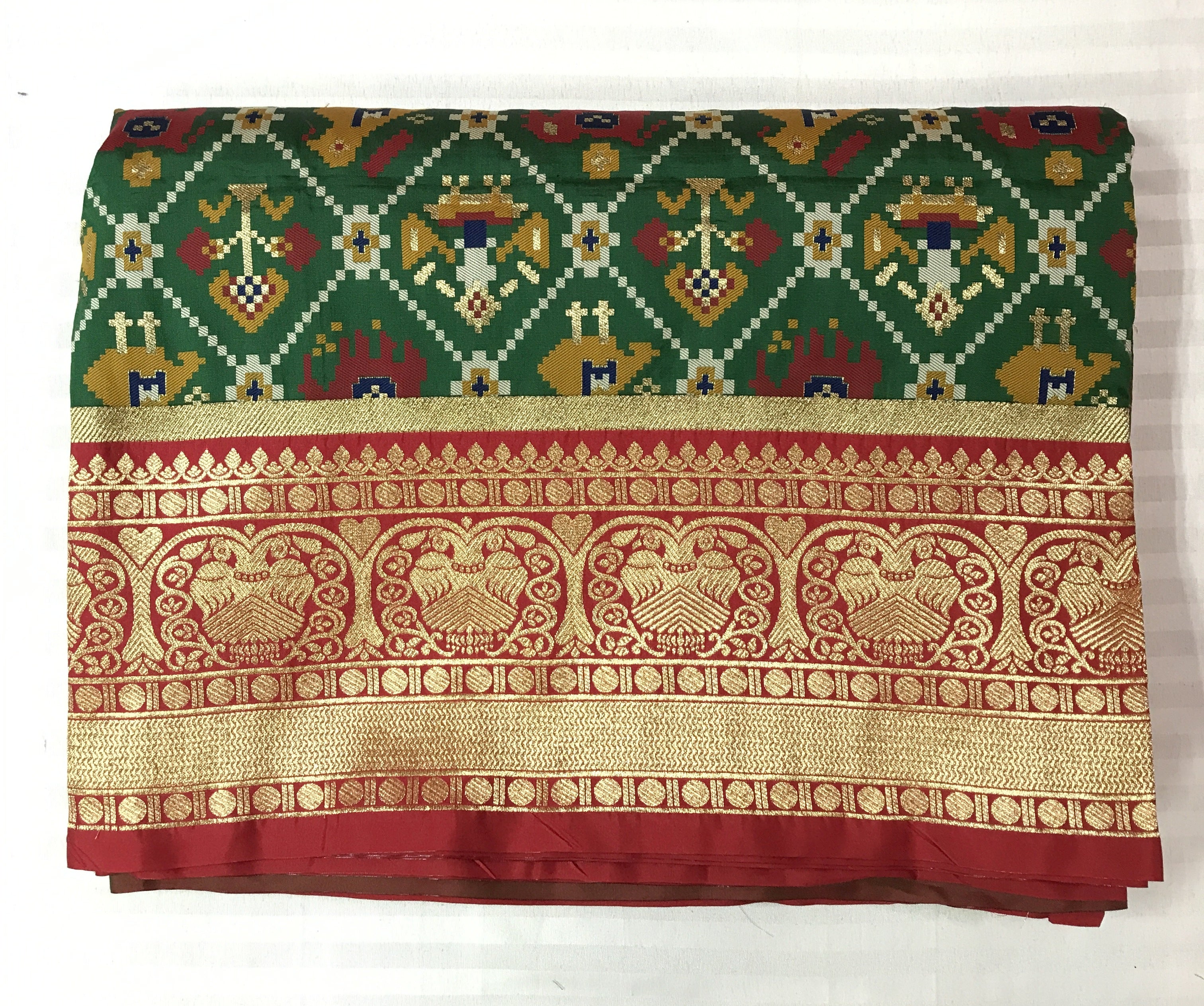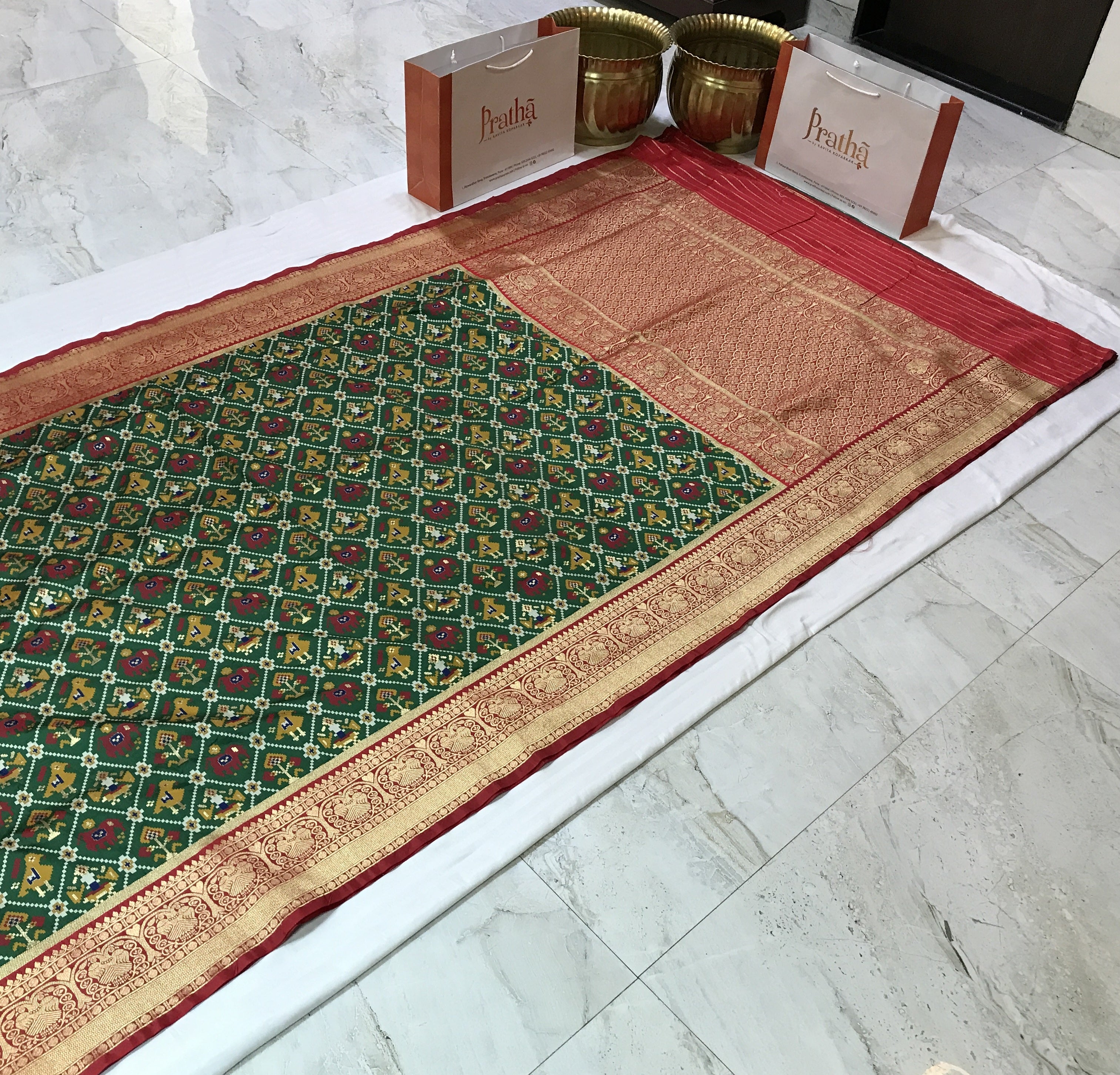 This Banarasi saree its inspired by 'Patola' designs! A very beautiful combination of bright green power loom Banarasi saree with brocade design all over the weave, this saree is a stunner! The unique colour makes you stand out! We can wear this saree on different special occasions like weddings as well as for gifting purpose.