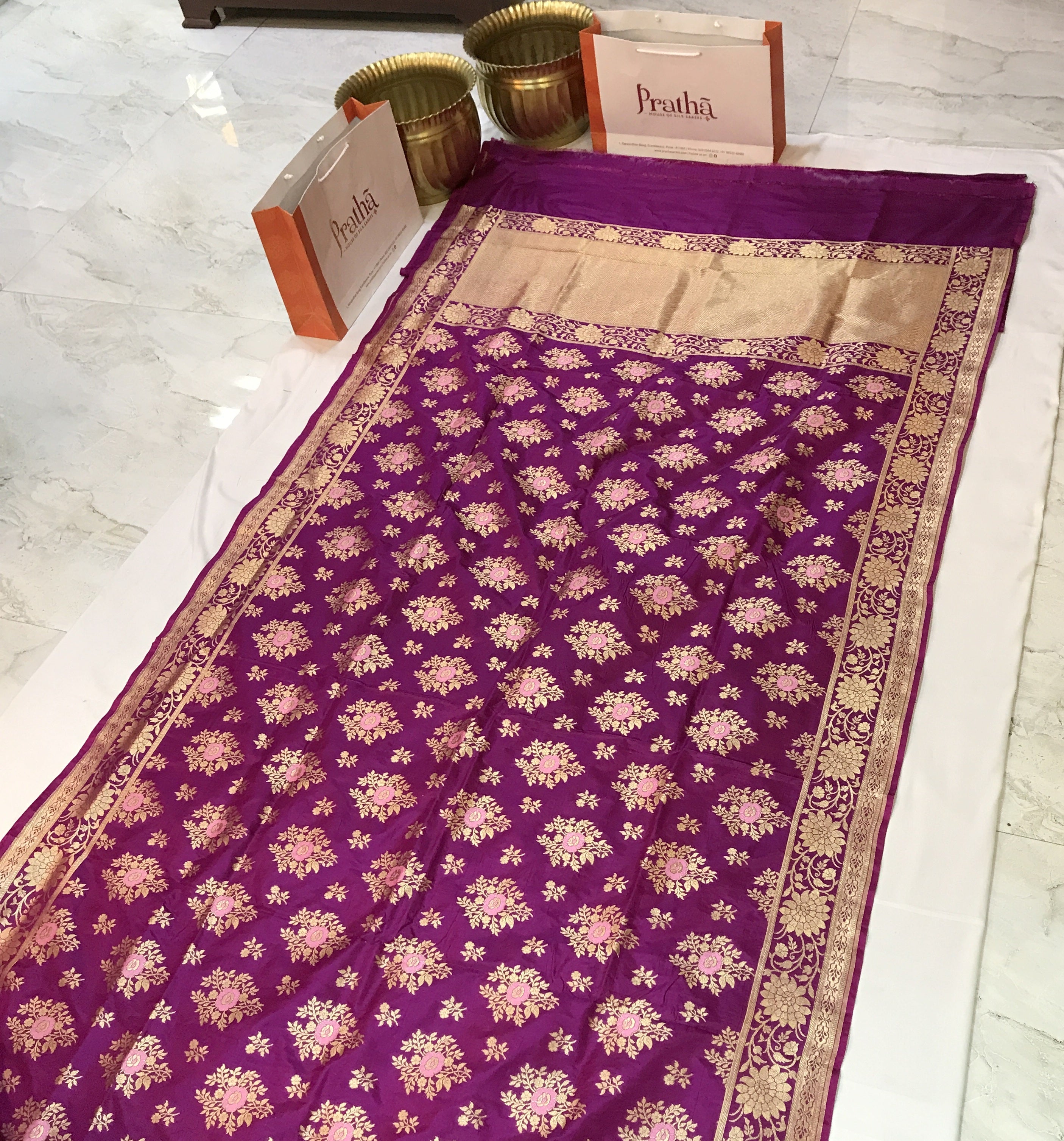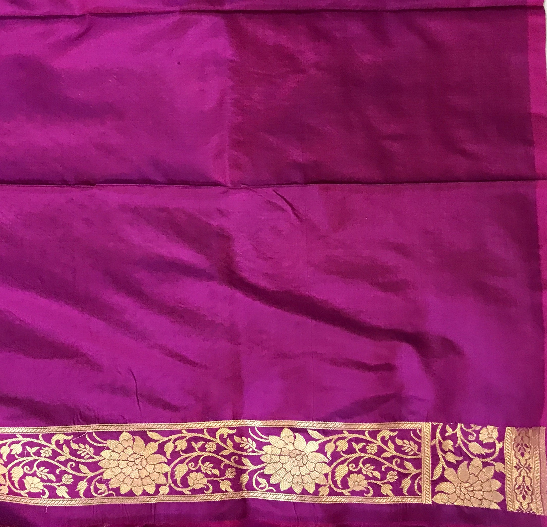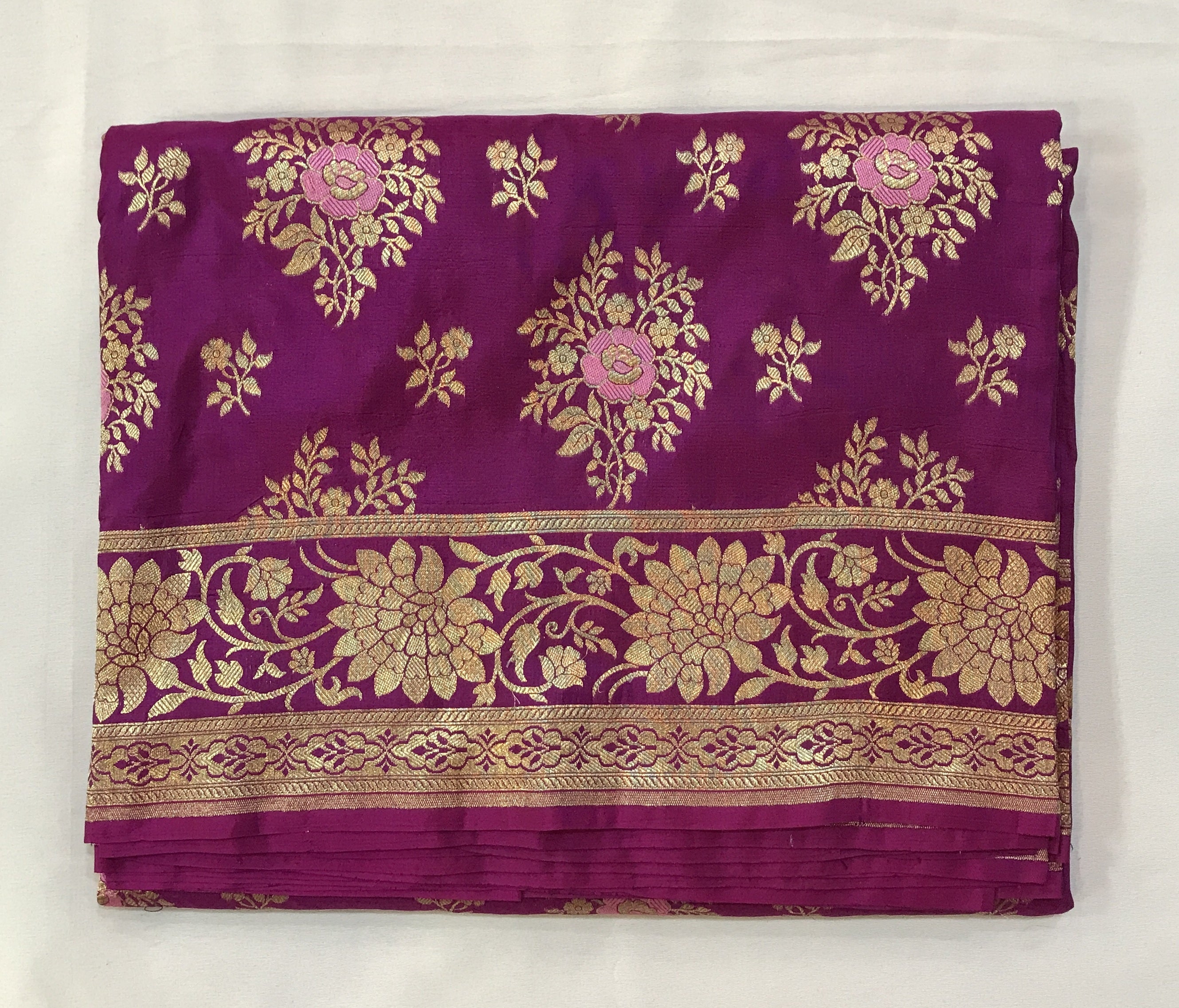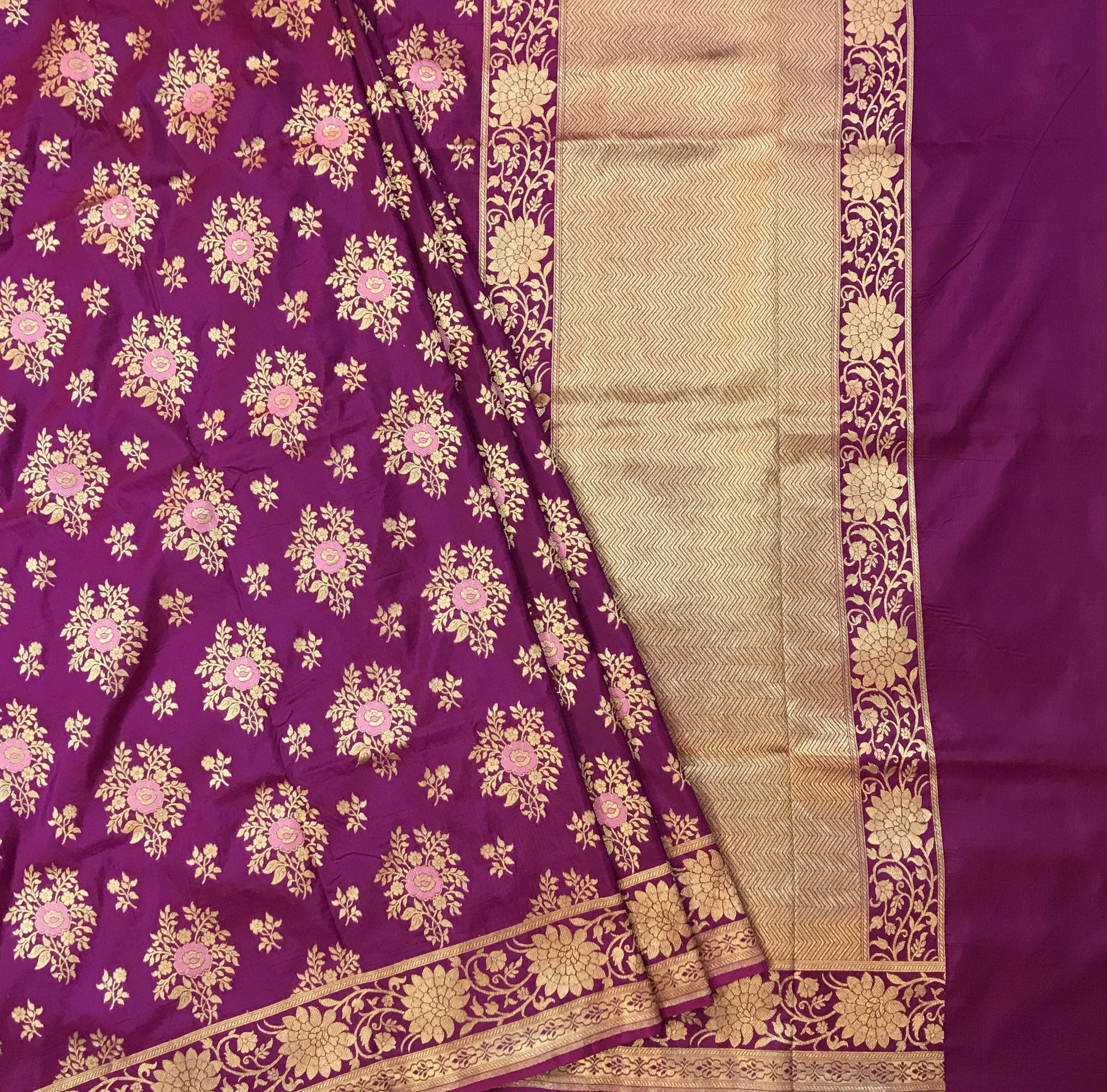 A beautiful shade of magenta in the Banarasi style with brocade design, this saree is a stunner! The different colour makes you stand out! The bold but rich and intricate design of the big ( motifs ) in brocade is extremely outstanding. The zari colour- not too golden , not silver - makes this saree a true Banarasi !