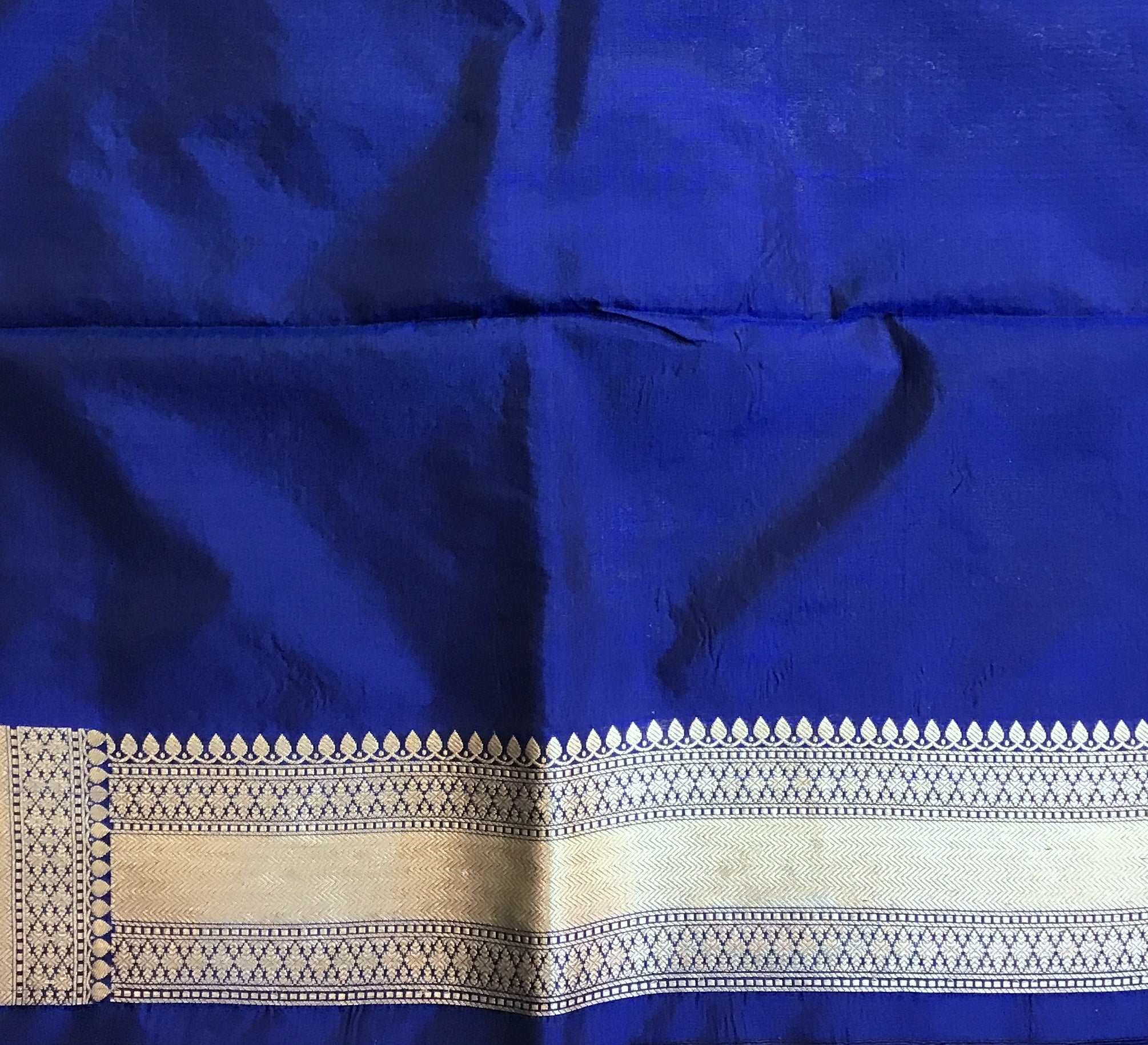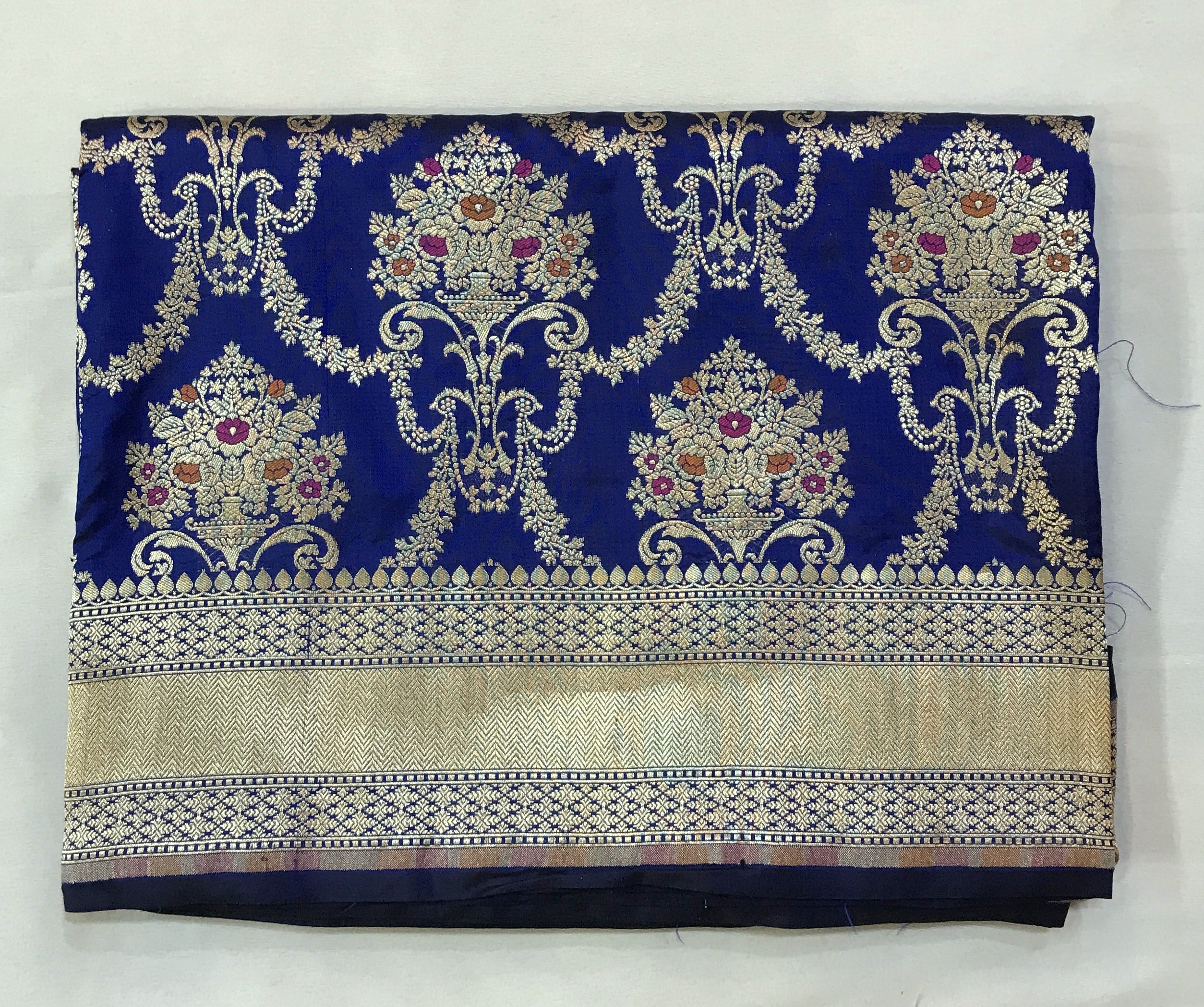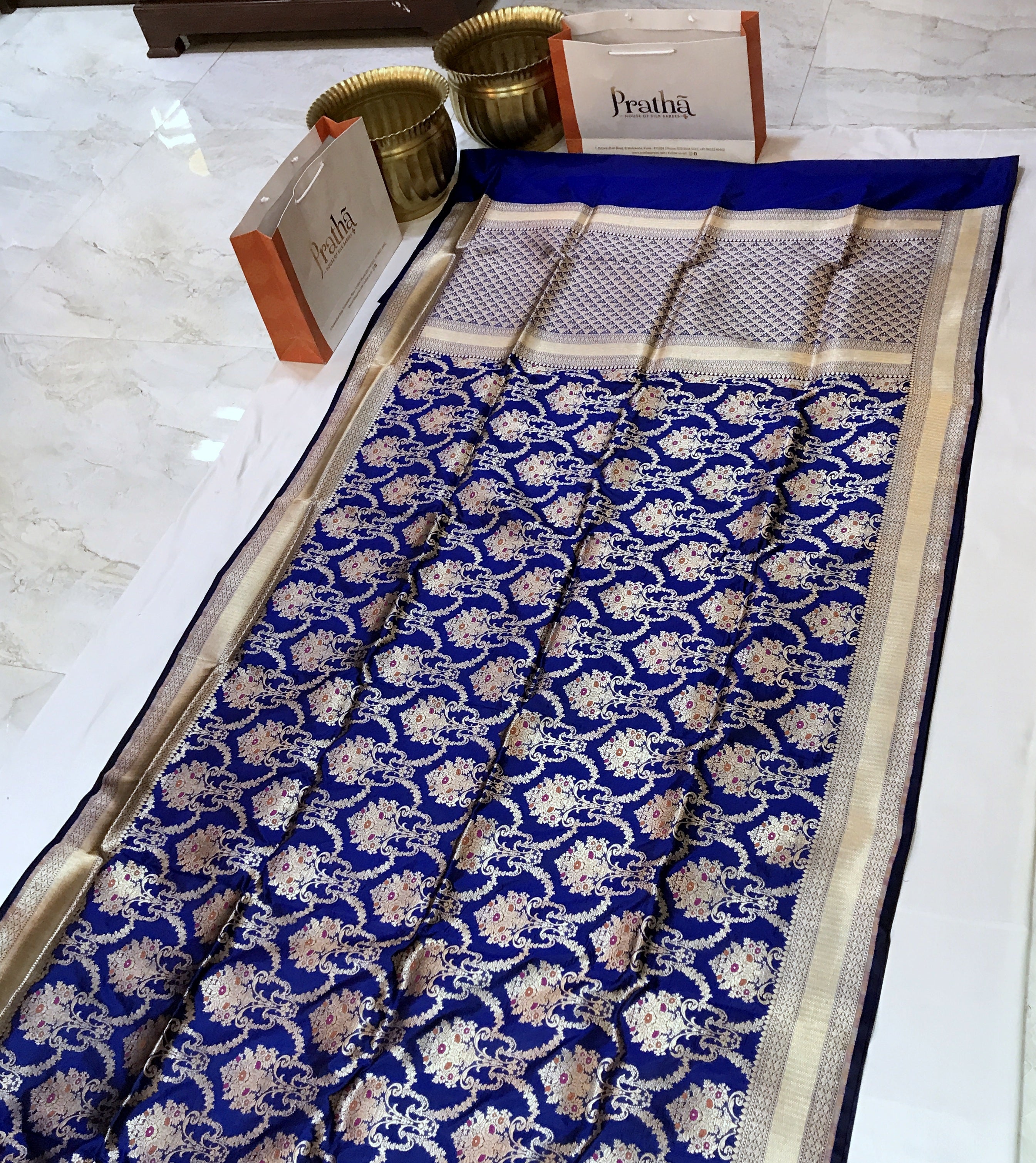 That's a beautiful blue Banarasi with as charming designer border as it's pallu. The brocade floral design all over the saree adds to its grandeur. What can be more attractive than the multicolored meenakari. This cusp of different weaving styles makes this saree unique and refreshing!