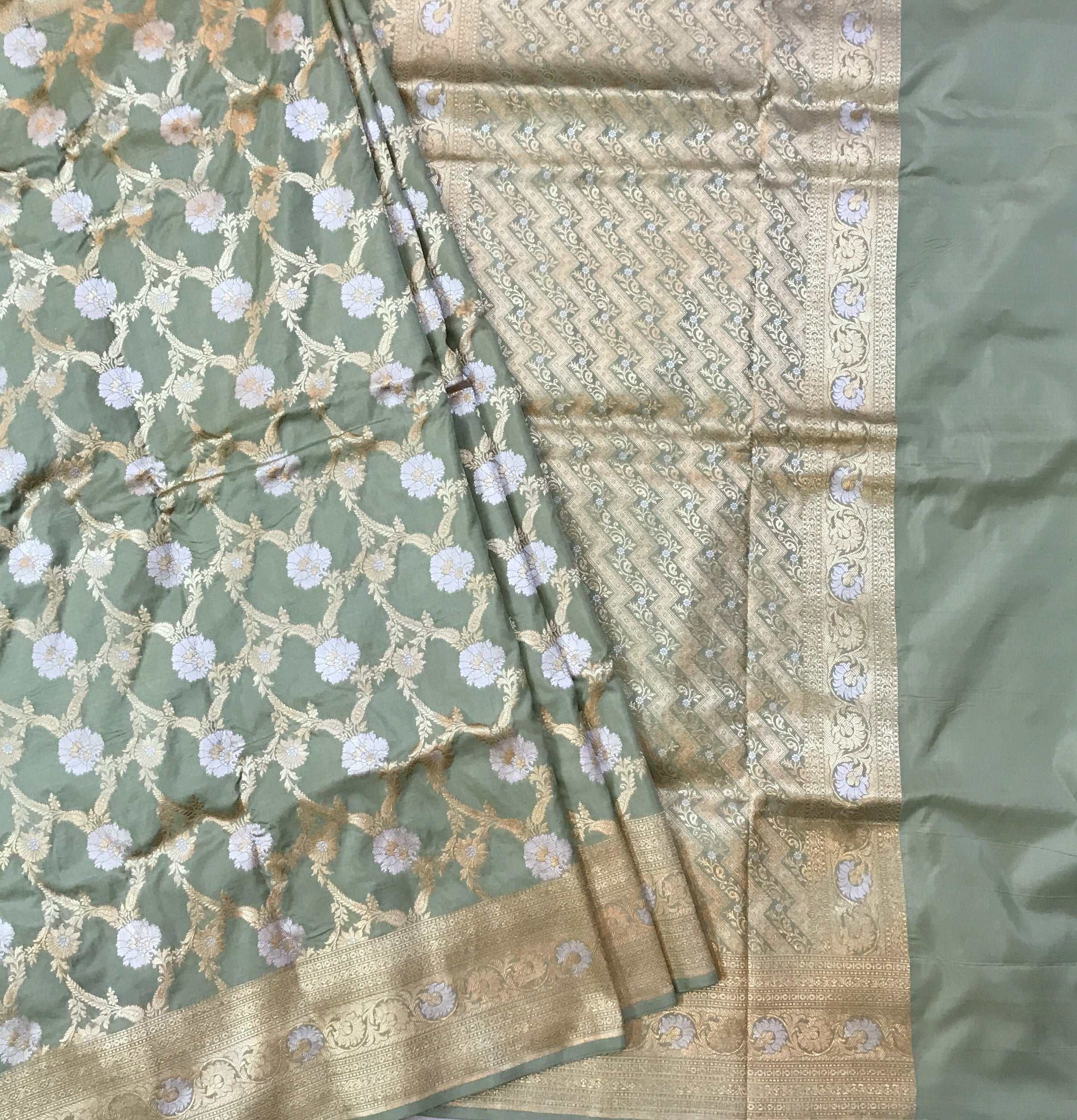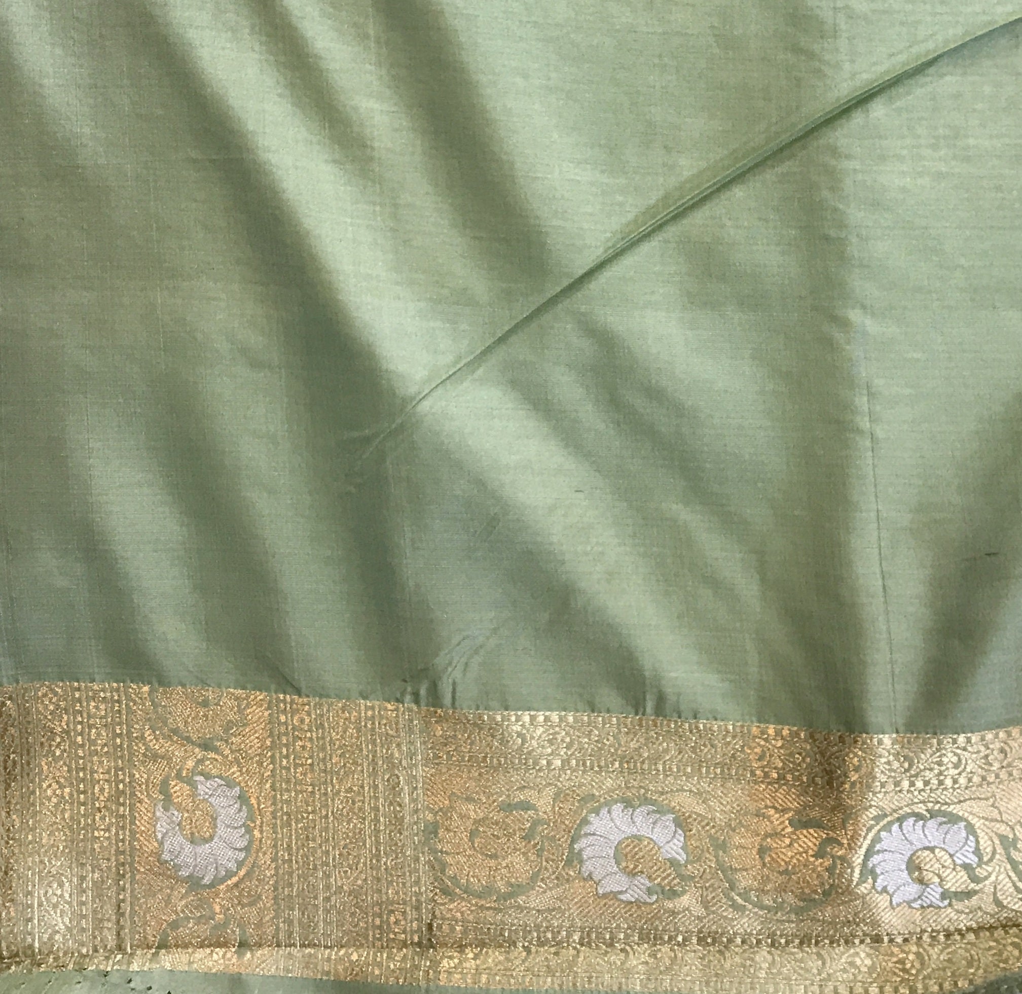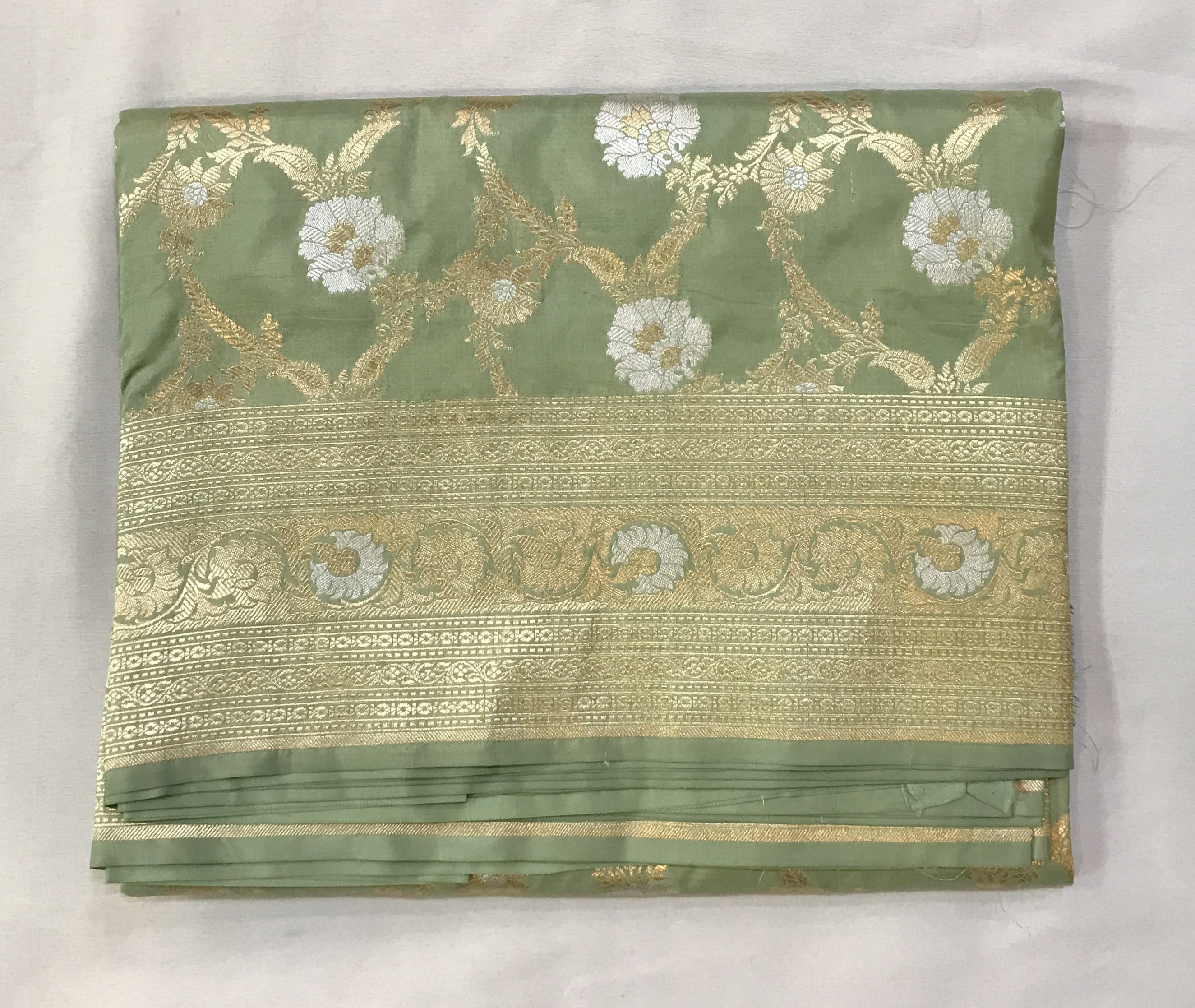 A unusual shade of fresh pista-green in the Banarasi style with silver-golden brocade design all over the weave, this saree is a stunner! The unique colour makes you stand out! It has a different shaped floral butti design all over the saree, and a striking edge with a intricate design silver-golden zari border .