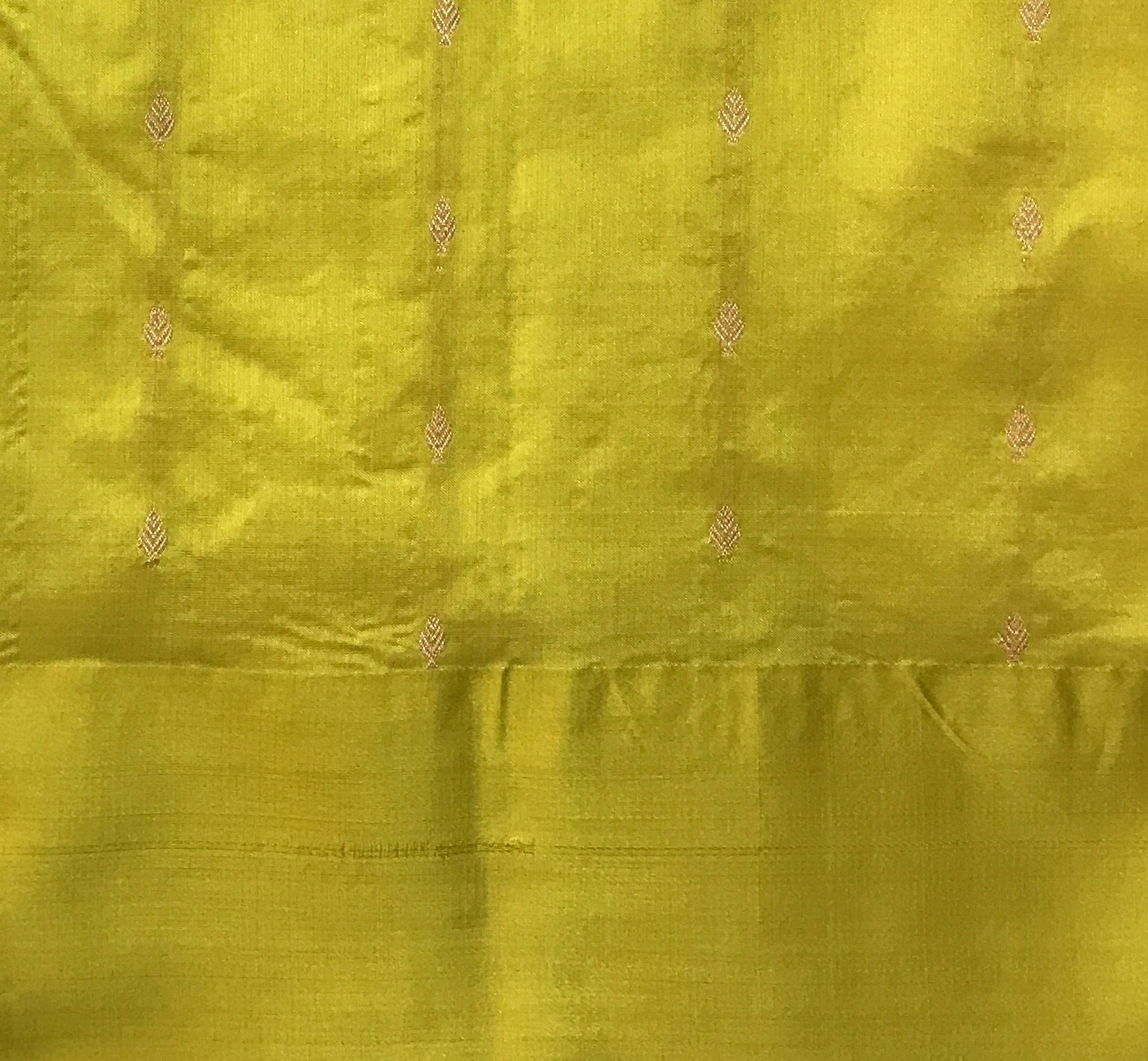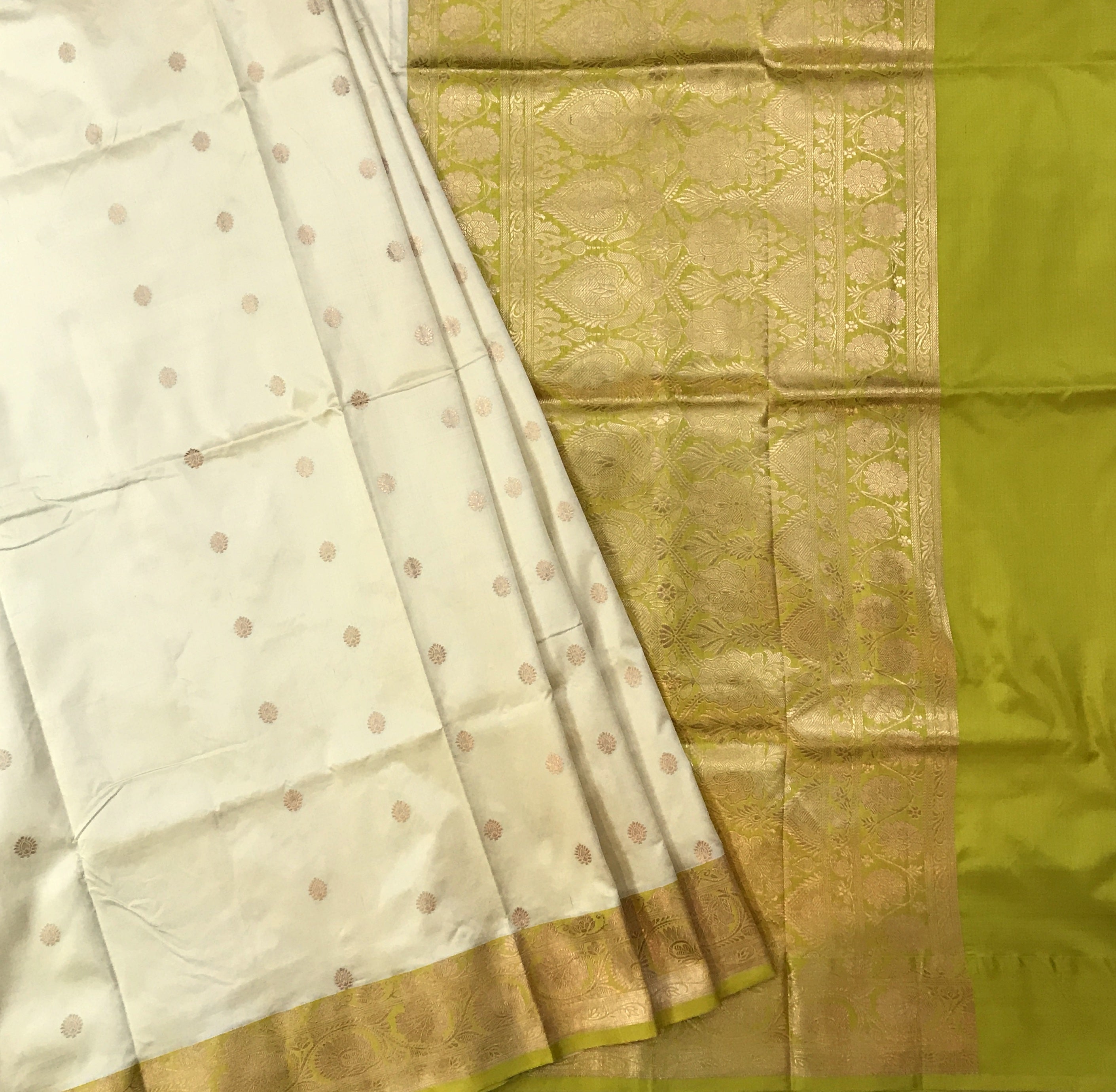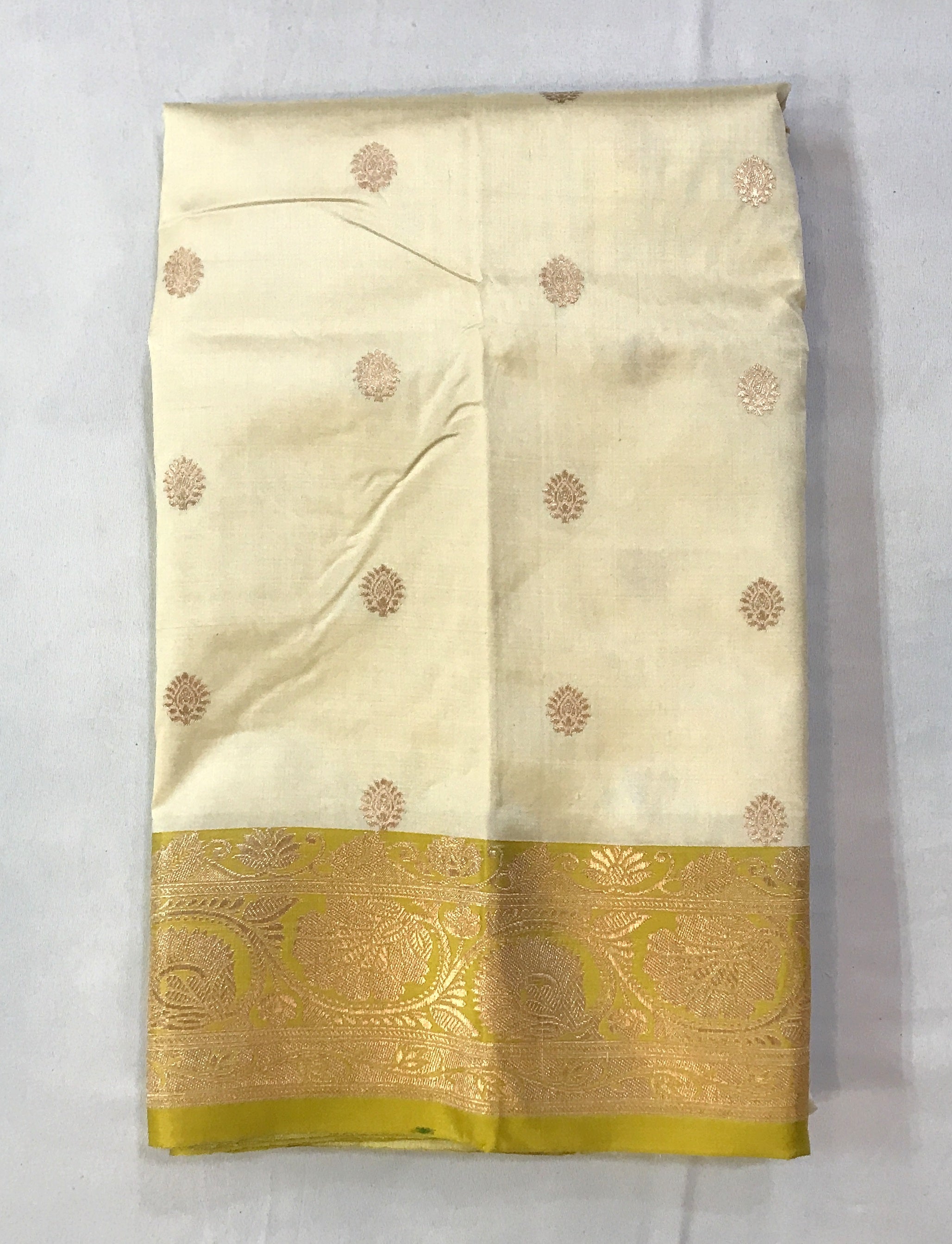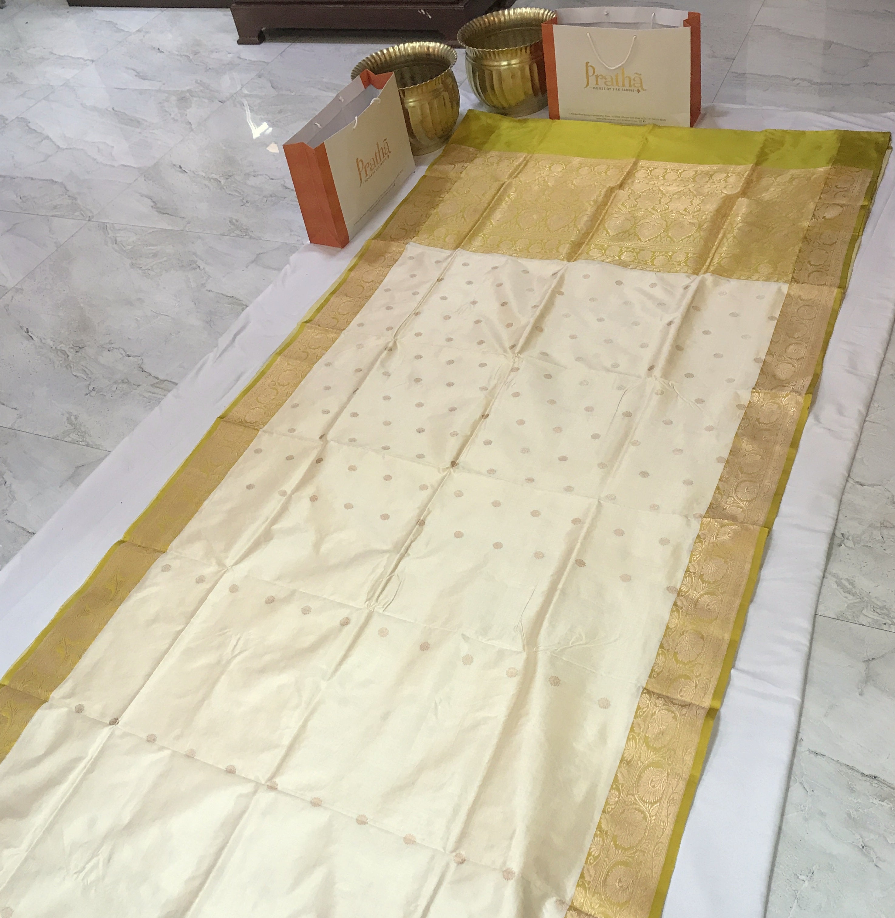 This saree in a stunning shade of beige with a beautiful olive green contrast border ' with delicate shaped butti zari thread, is all set to steal hearts. Do not miss the border and pallu of this saree which have a beautiful design of golden zari, that's amazing. This kind of saree will look great on a bride or on any of your most special days!