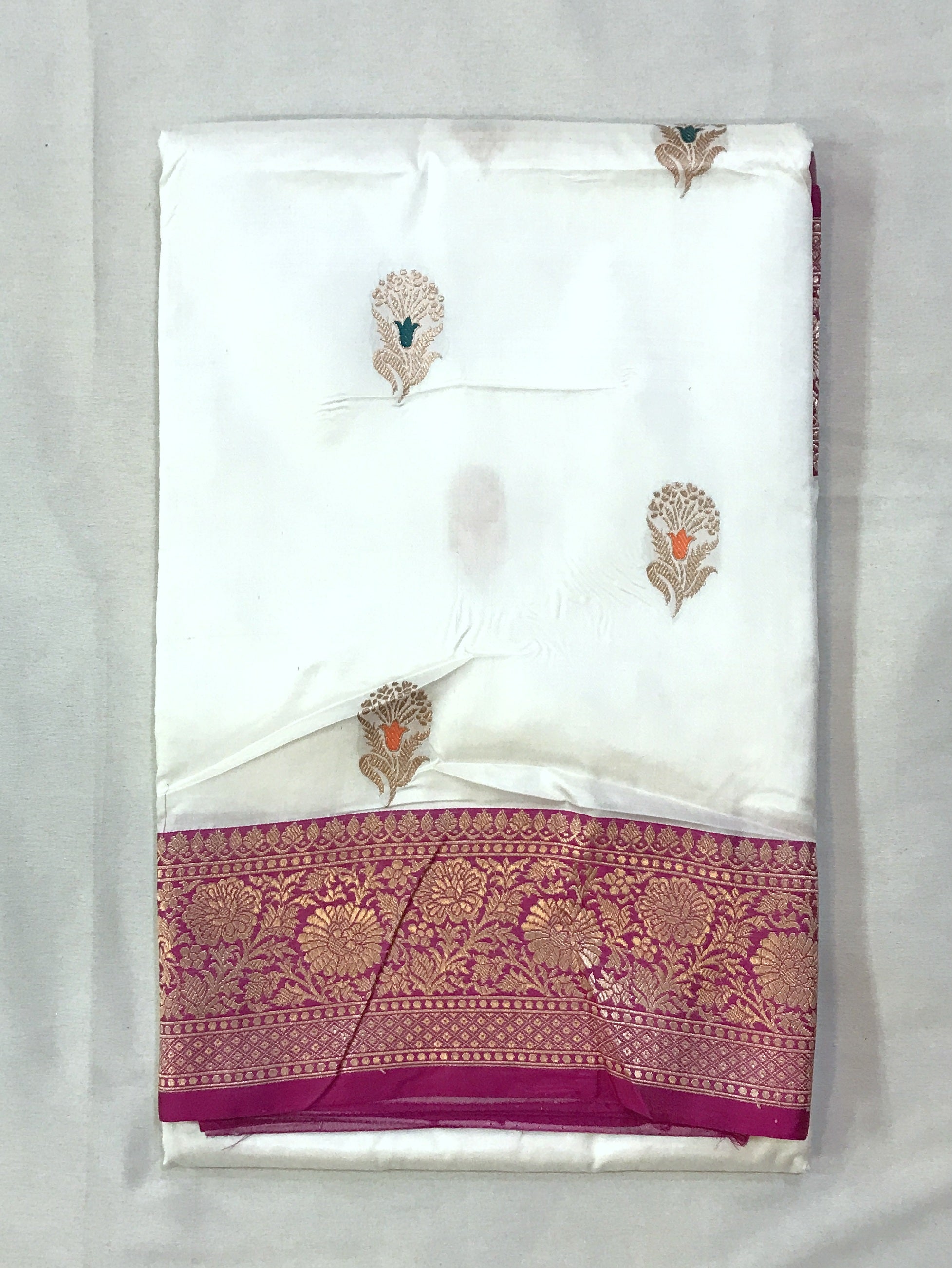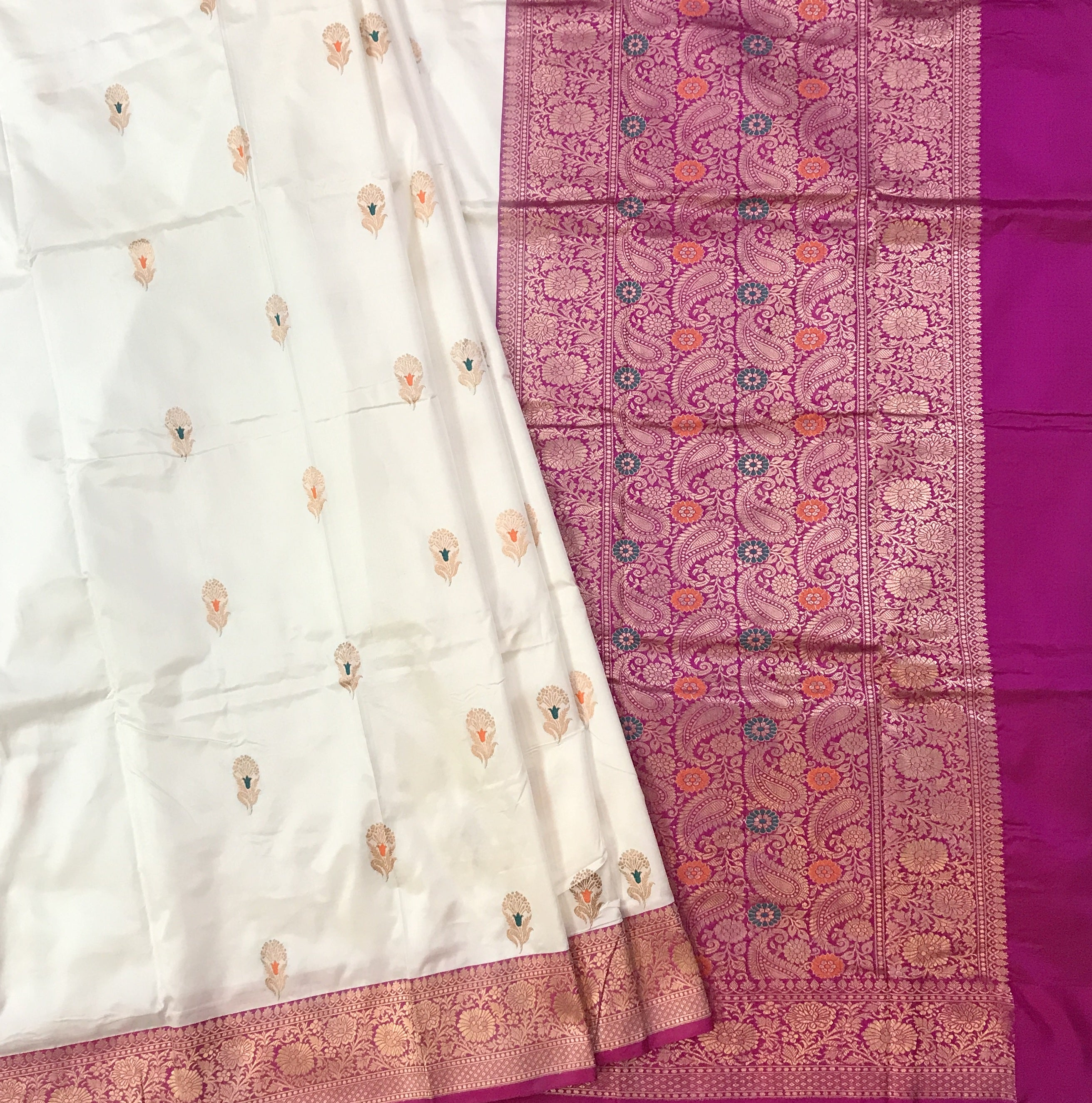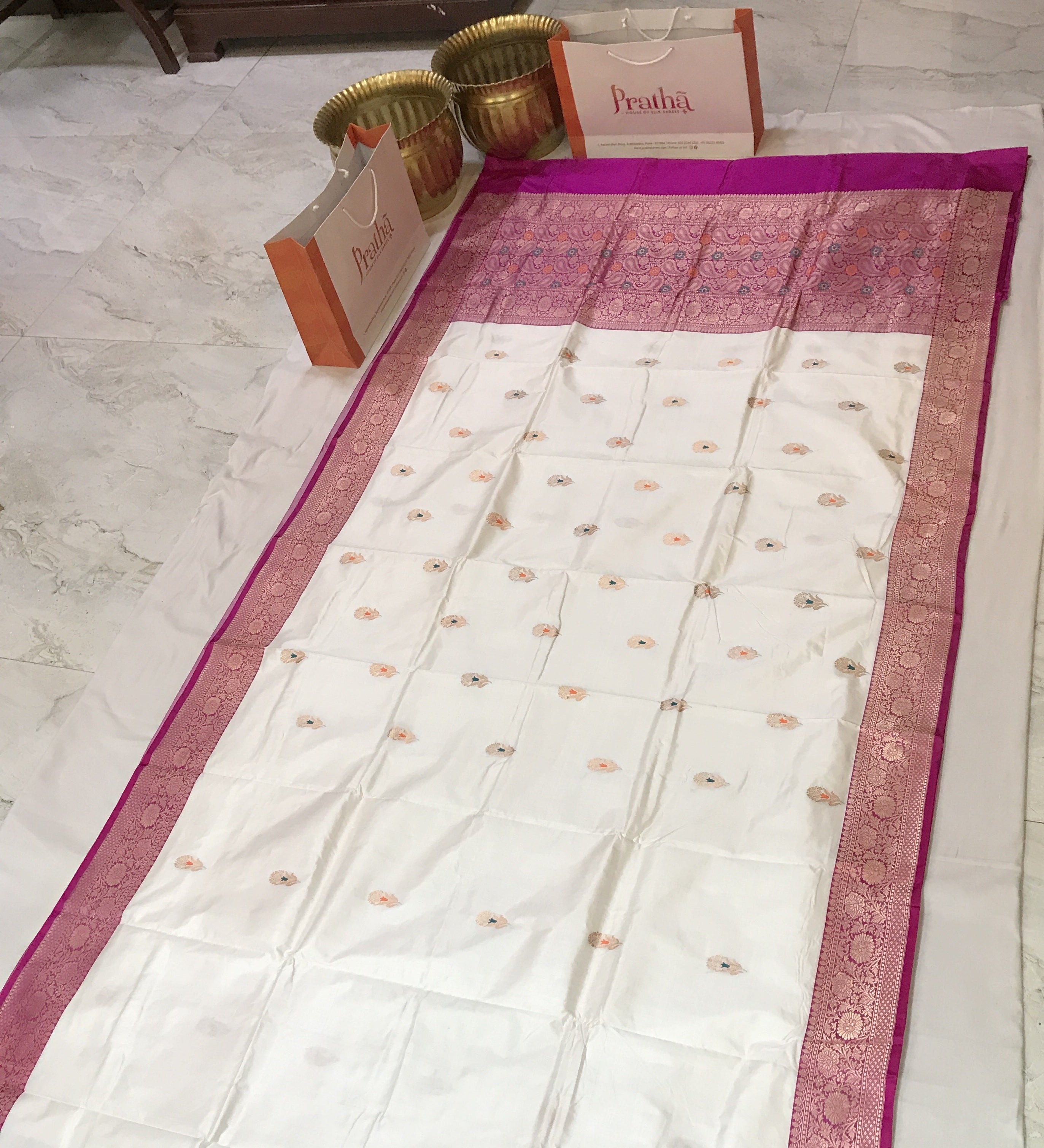 A lovely shade of white colour with contrast pink colured zari border gives this traditional Banarasi a beautiful look. This unusual combination, the intricate floral shaped-inspired meenakari butti ( motifs), in zari - all these add to the beauty of this saree . The specialty of this saree is that it has a intricated floral design on border and pallu in multicolor with beautiful meenakari, look distinctives and complementing each other.