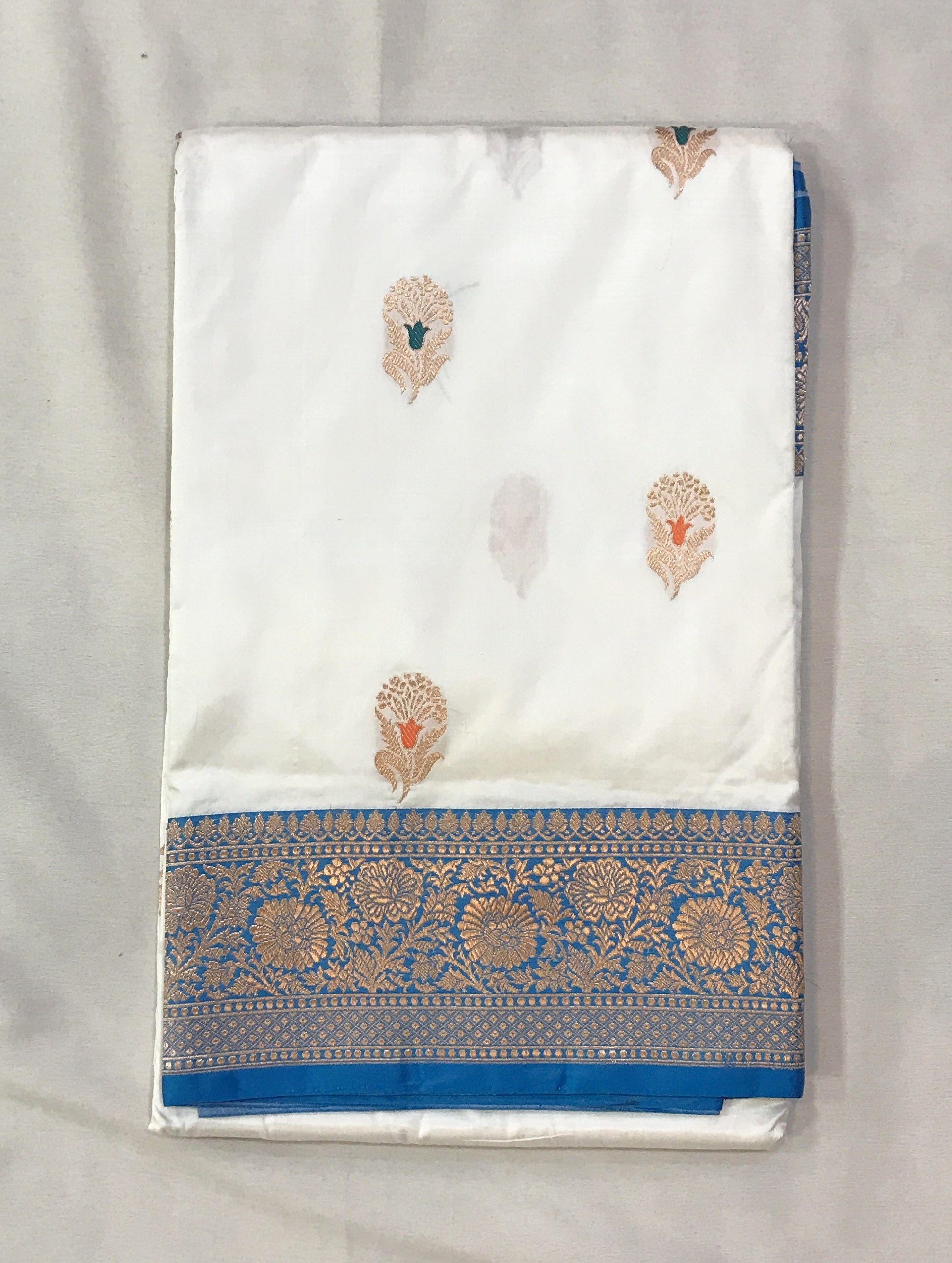 A lovely shade of white colour with contrast blie colured zari border gives this traditional Banarasi a beautiful look. This unusual combination, the intricate floral shaped-inspired meenakari butti ( motifs), in zari - all these add to the beauty of this saree . The specialty of this saree is that it has a intricated floral design on border and pallu in multicolor with beautiful meenakari, look distinctives and complementing each other.
