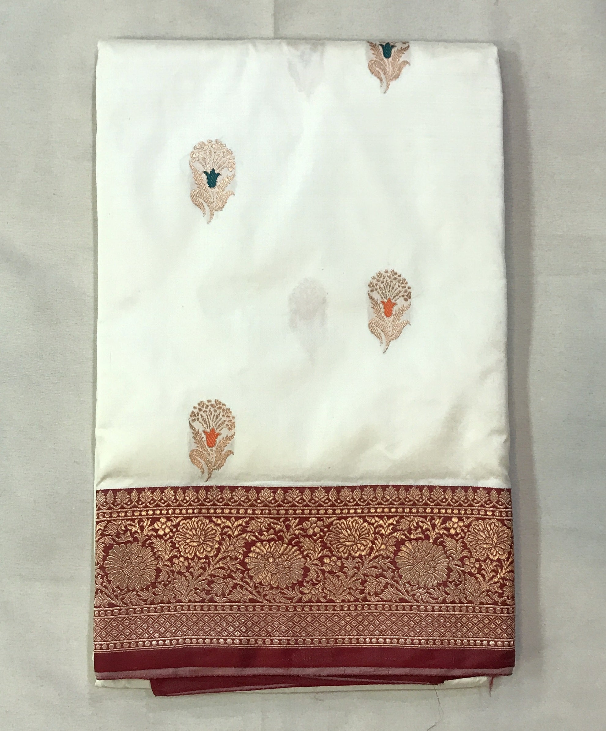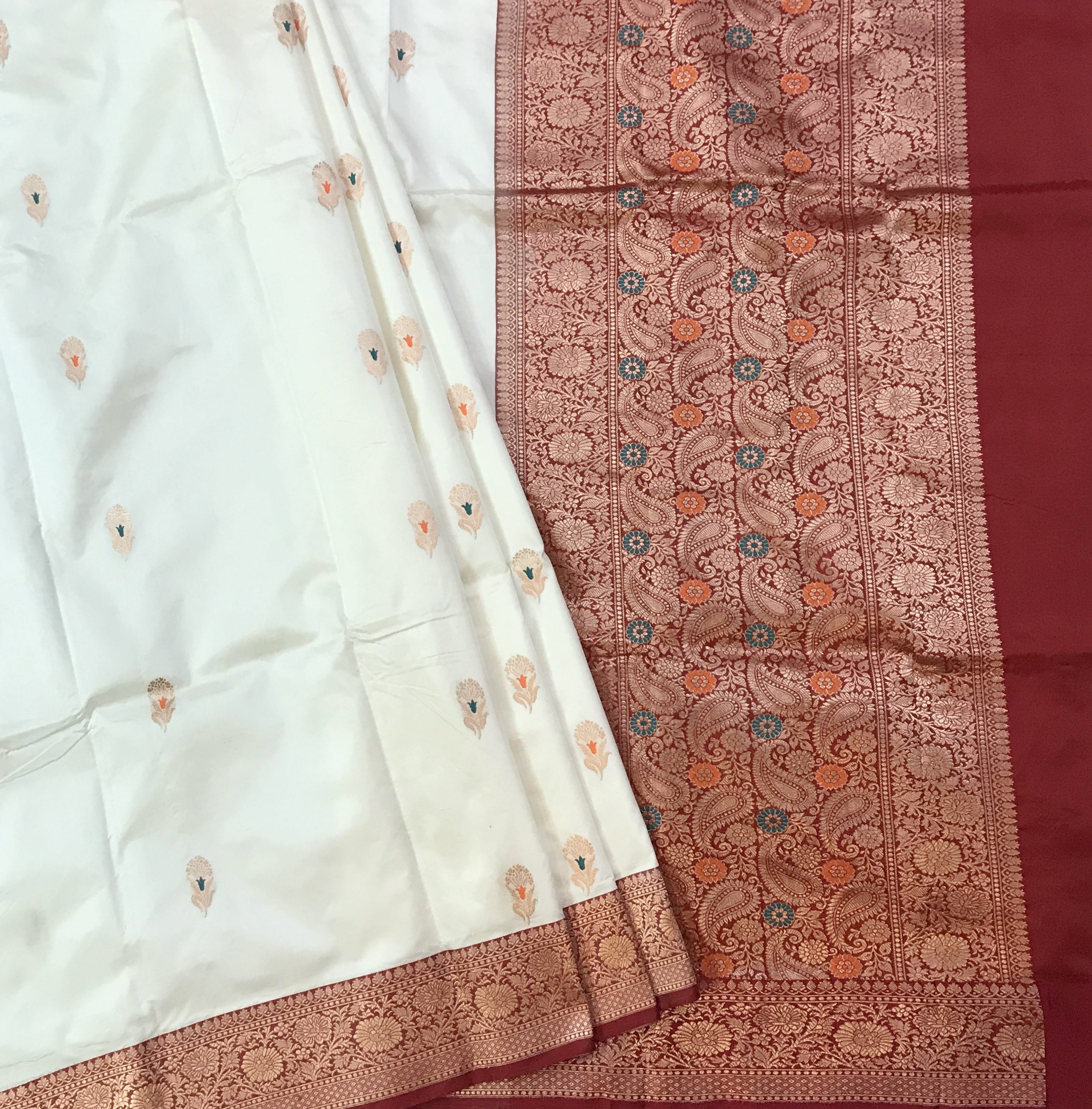 A lovely shade of white colour with contrast red colured zari border gives this traditional Banarasi a beautiful look. This unusual combination, the intricate floral shaped-inspired meenakari butti ( motifs), in zari - all these add to the beauty of this saree . The specialty of this saree is that it has a intricated floral design on border and pallu in multicolor with beautiful meenakari, look distinctives and complementing each other.