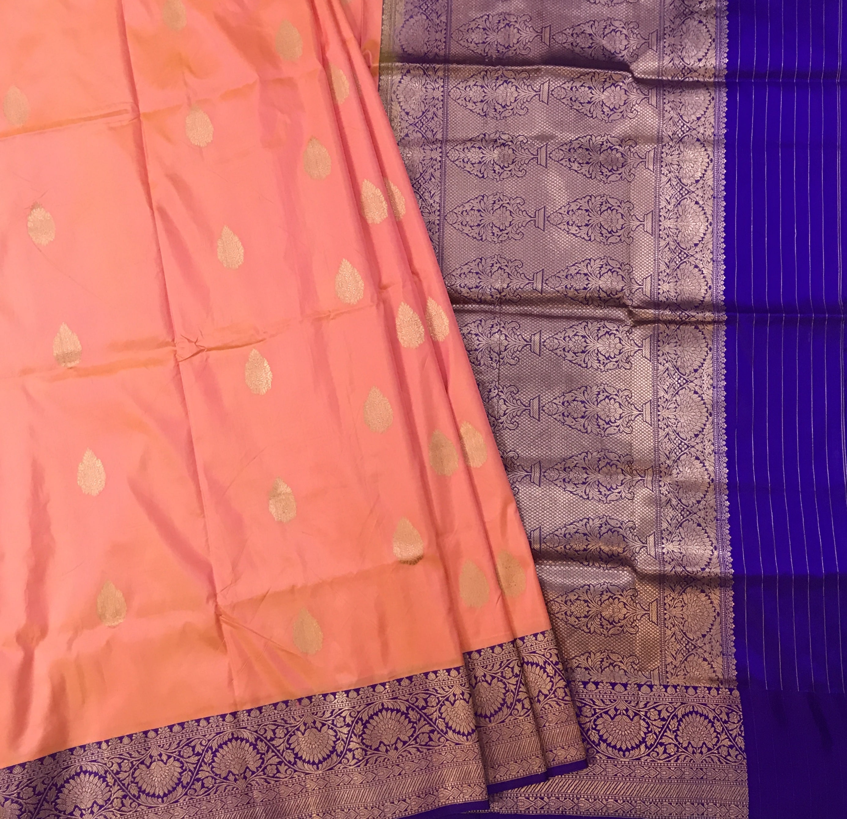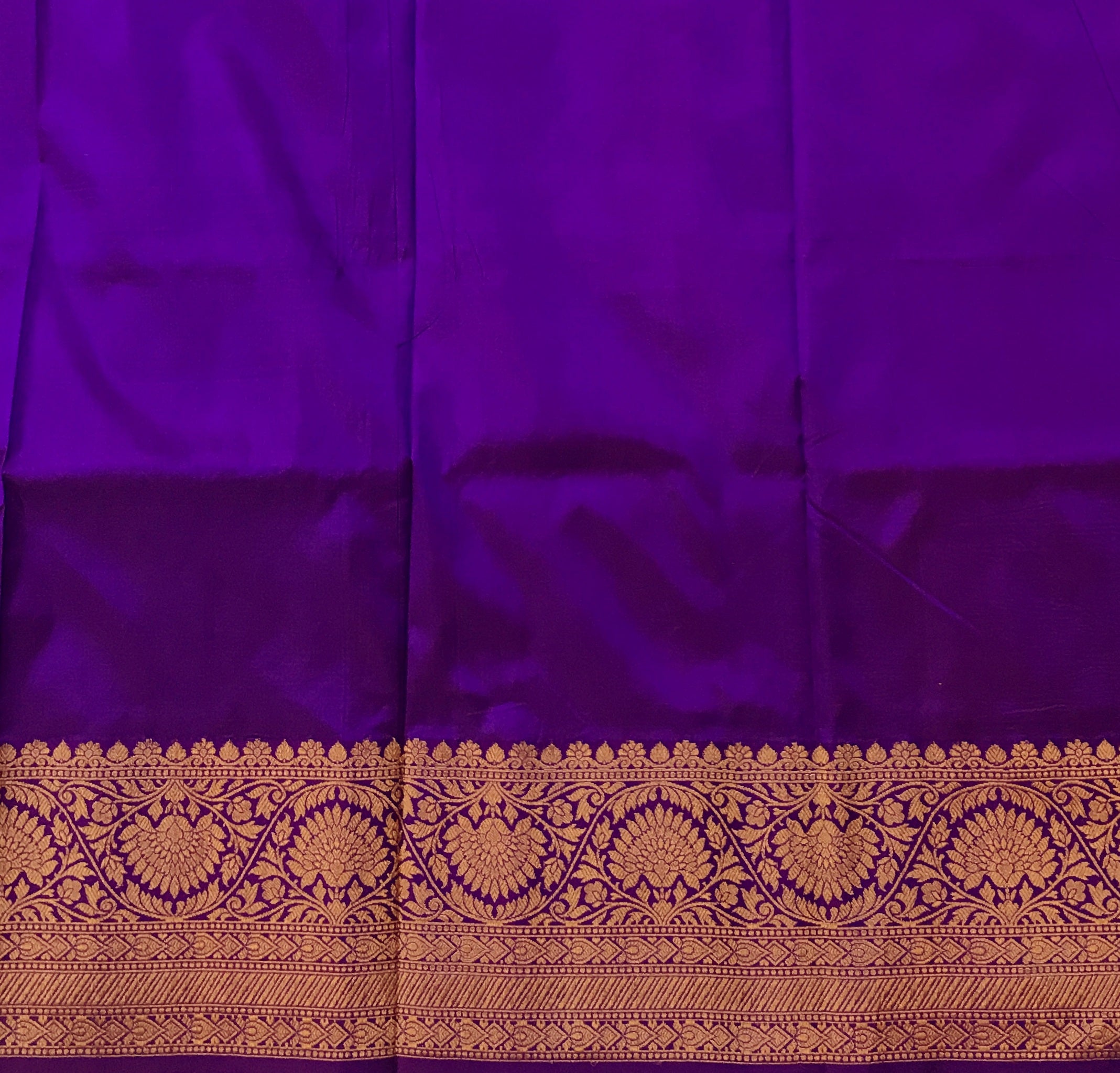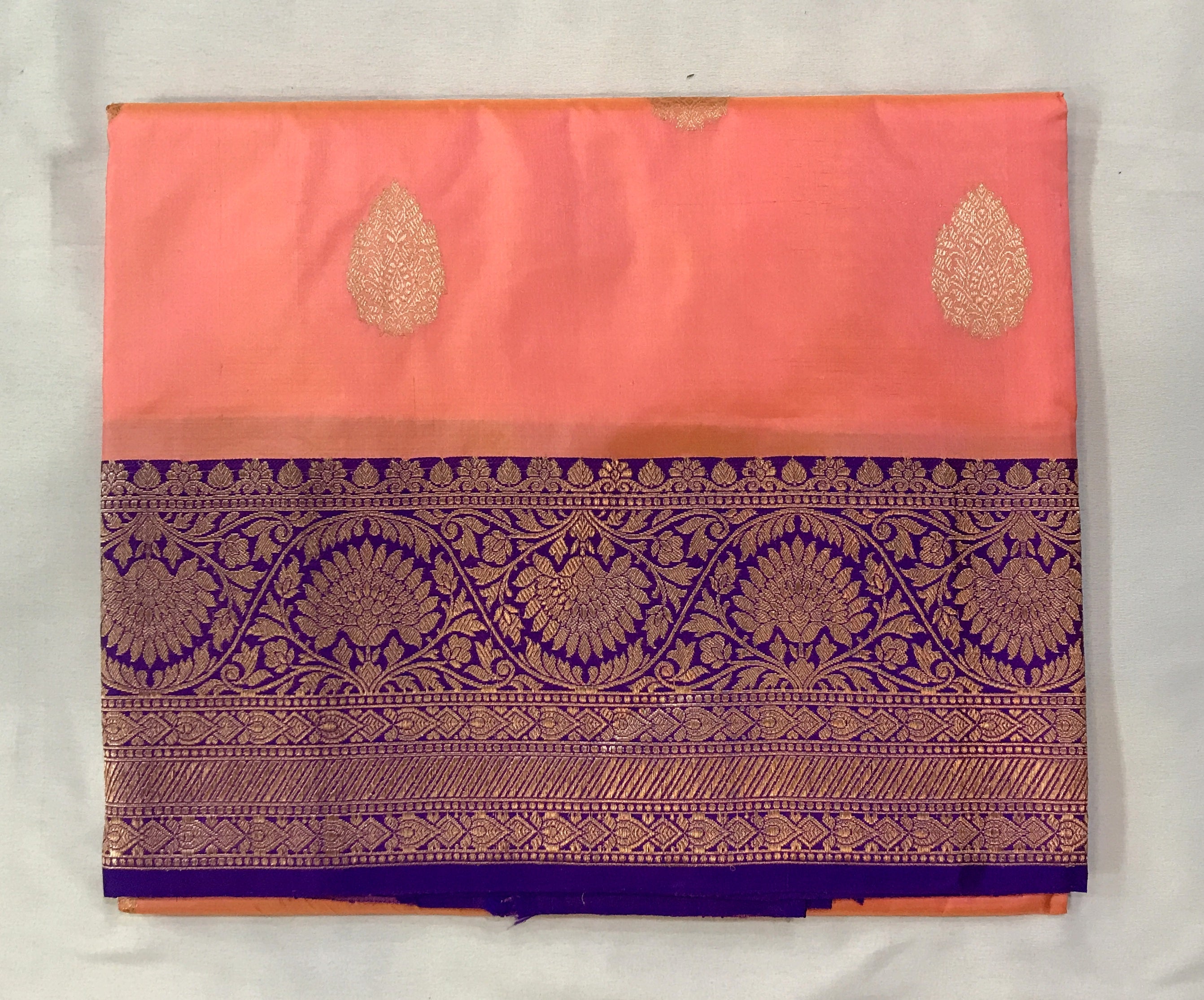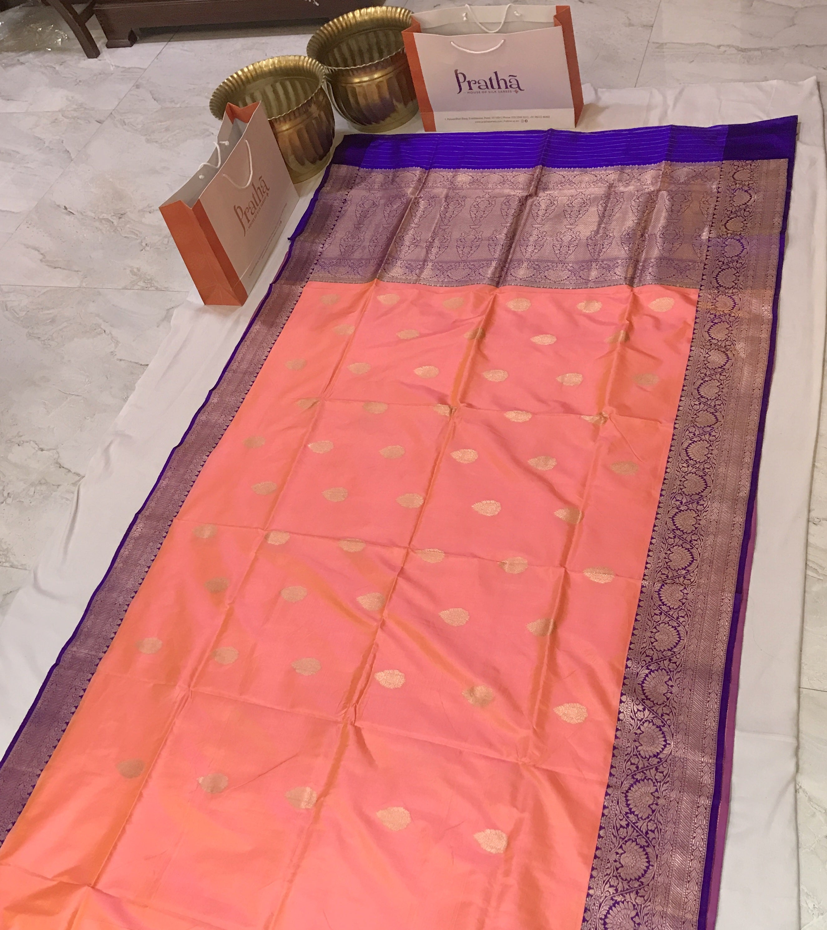 A very gorgeous shade of Peach-pink Banarasi with nice purple traditional border looks great! For the love of unusual colours, this Banarasi saree is definitely going to win your heart. This saree will look soothing and beautiful when draped! The golden zari border and pallu stands true to the Banarasi culture of saree weaving.