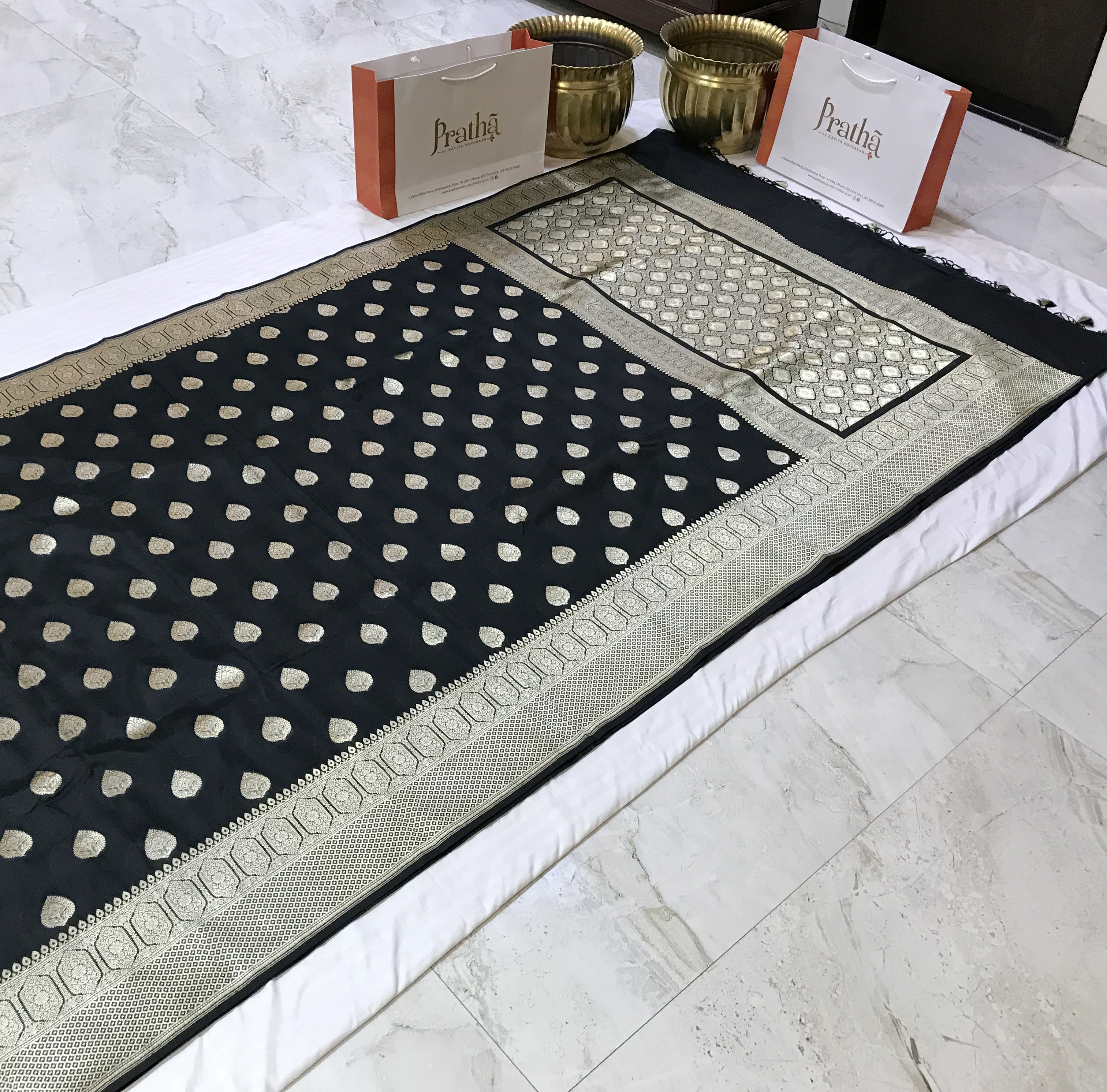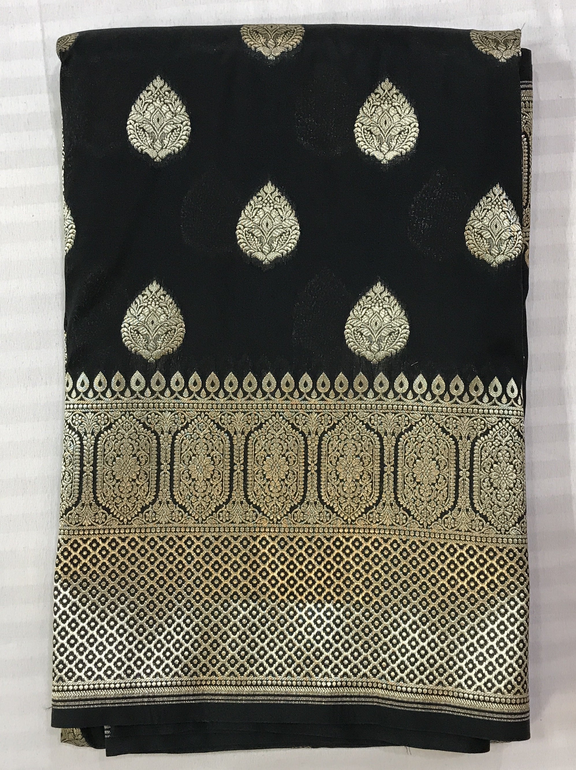 This Black Banasari Organza saree exudes elegance and grace with its intricate weaving and delicate fabric. Crafted with precision, it showcases a mesmerizing blend of traditional Banarasi motifs on lightweight Organza, creating a stunning drape that captivates attention. This saree embodies timeless beauty, making it a perfect choice for special occasions where sophistication meets tradition in a seamless fusion in black colour.