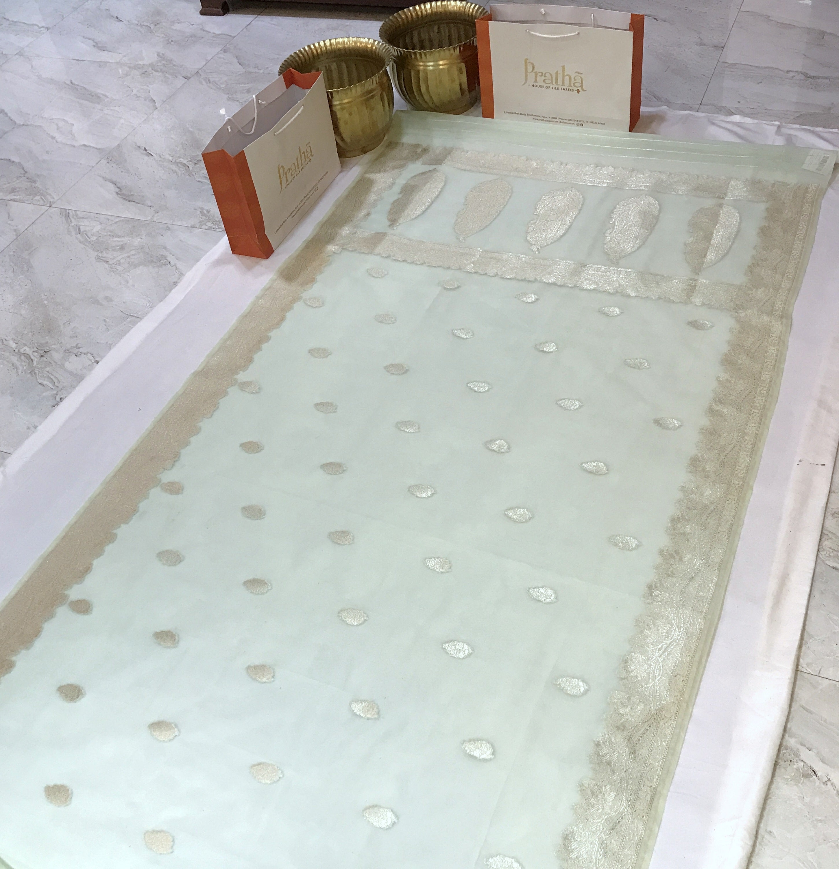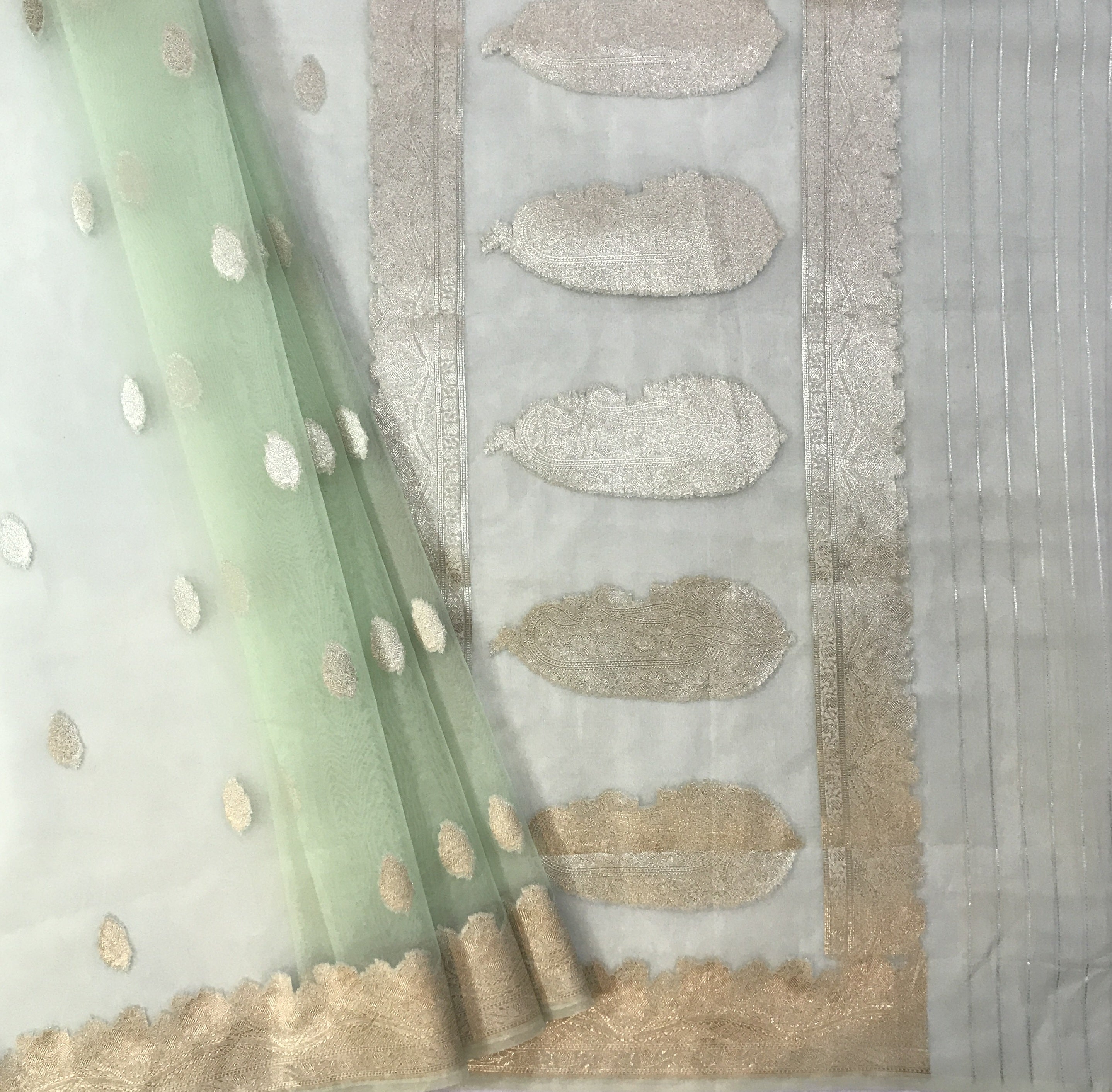 The Banasari Organza saree exudes elegance and grace with its intricate weaving and delicate fabric. Crafted with precision, it showcases a mesmerizing blend of traditional Banarasi motifs on lightweight Organza, creating a stunning drape that captivates attention. This saree embodies timeless beauty, making it a perfect choice for special occasions where sophistication meets tradition in a seamless fusion in pista green colour.