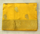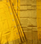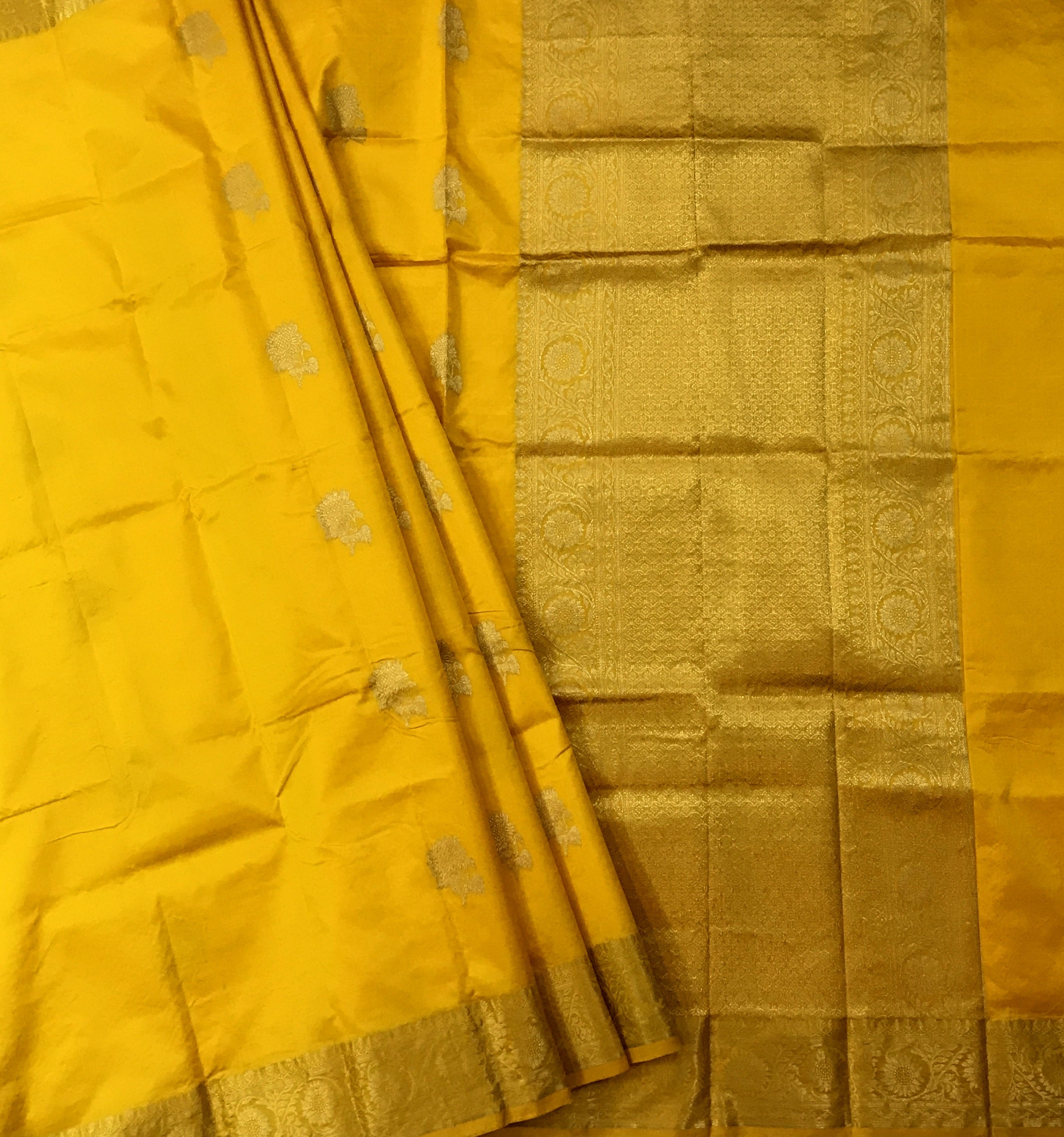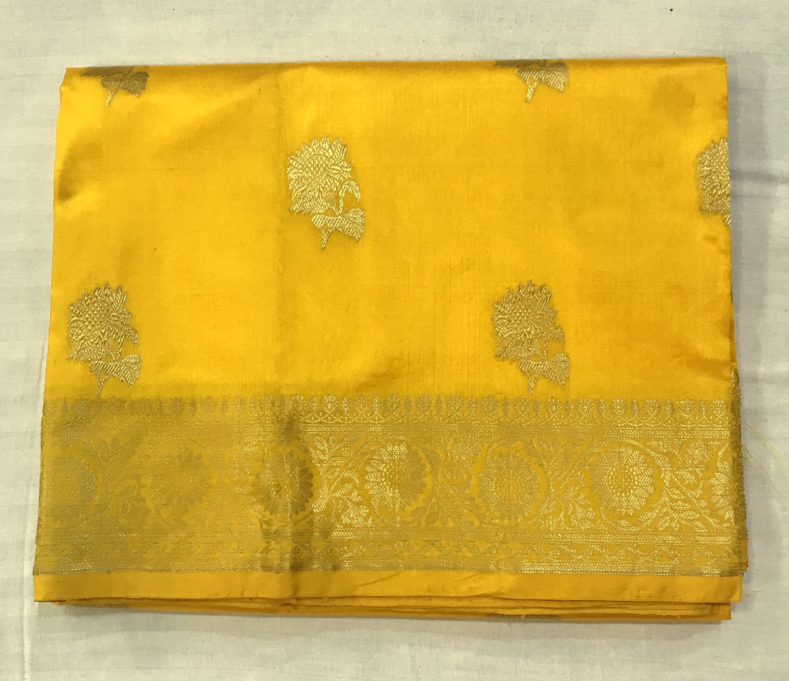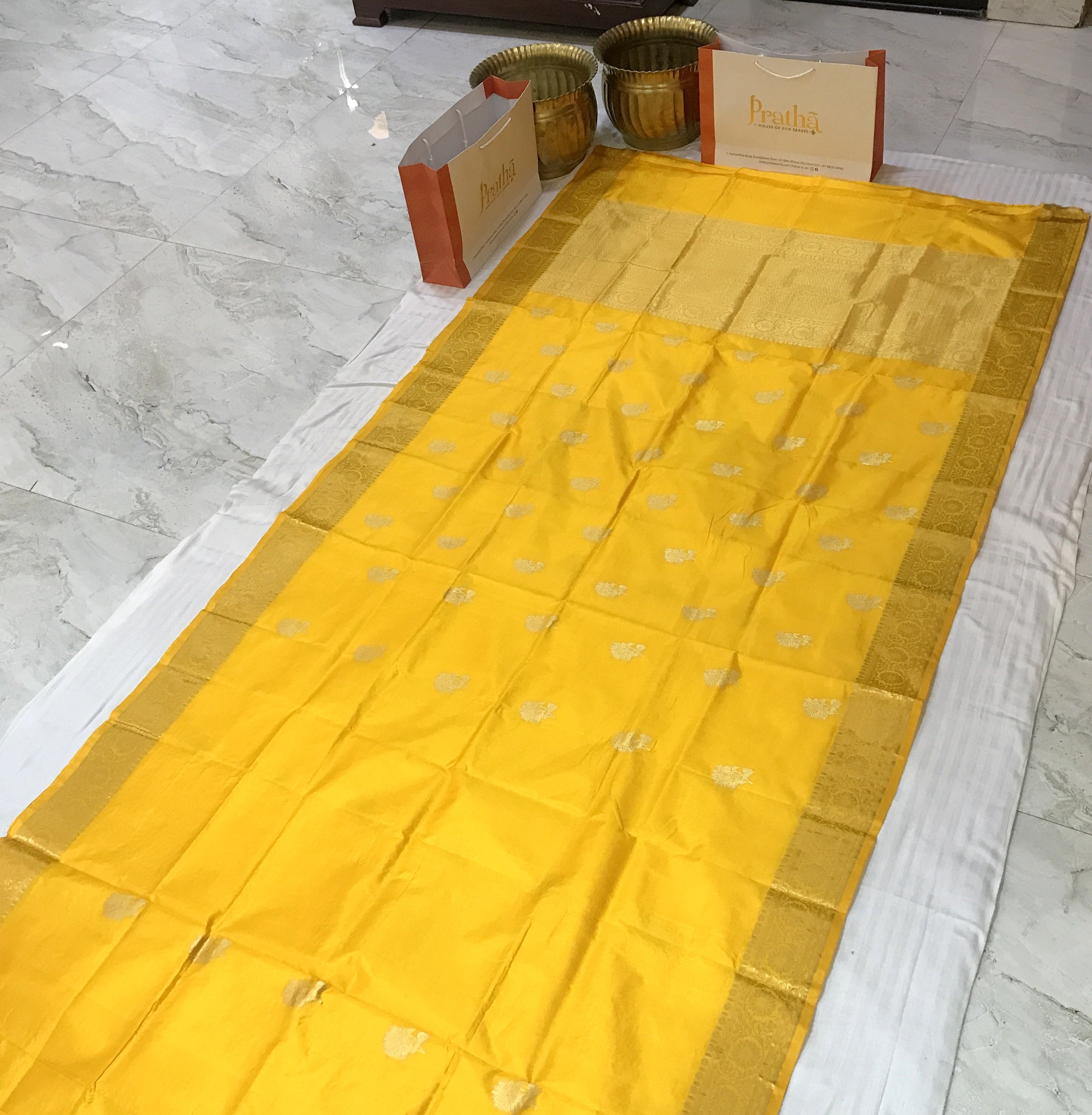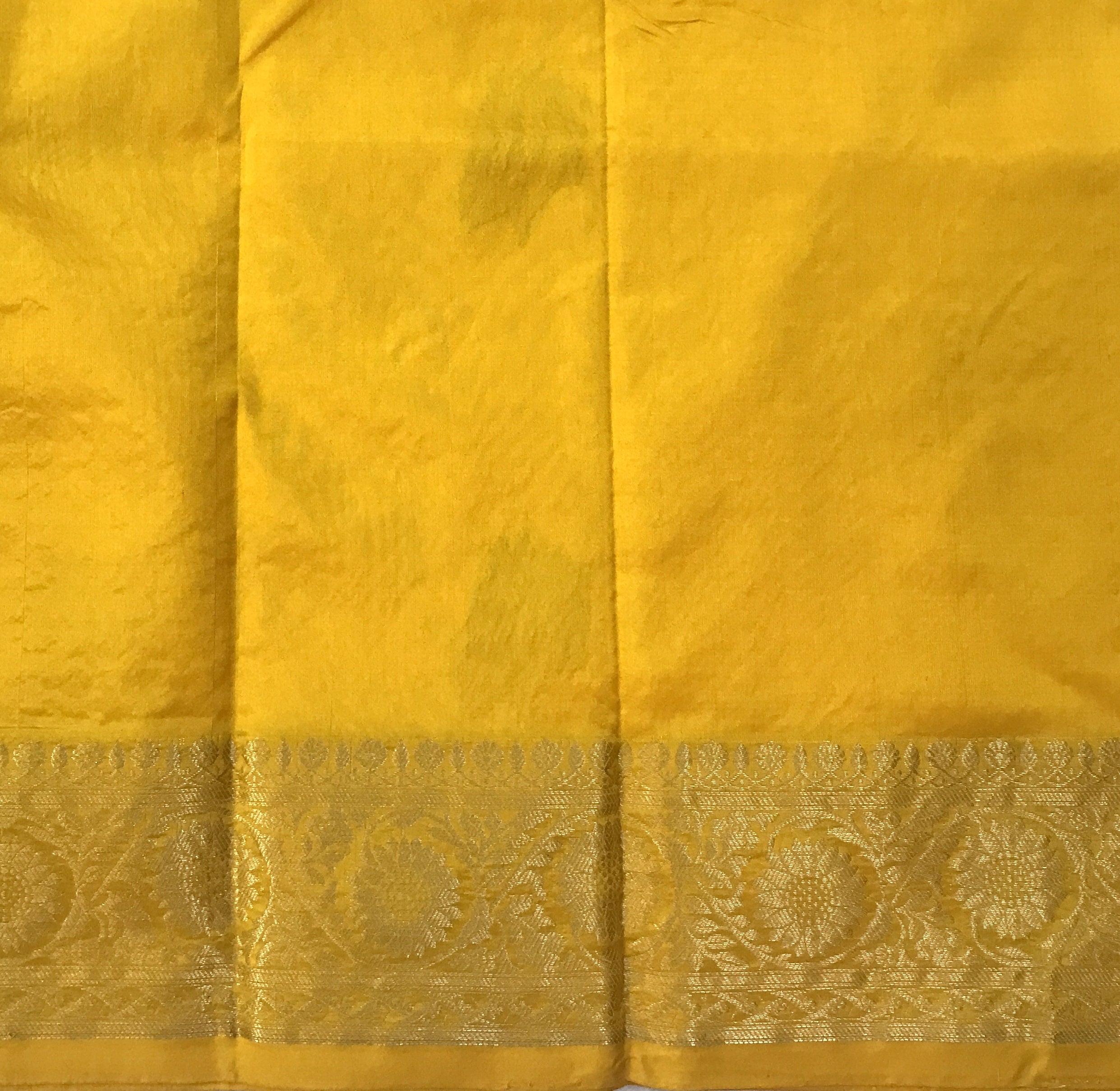 A very lovely and uncommon shade mango-yellow Banarasi with a nice self border looks great! This saree is light weight and easy to wear at any function, meetings and parties. Do not miss the delicate floral butti and pallu all over the saree woven in golden zari thread! This is simply beautiful.