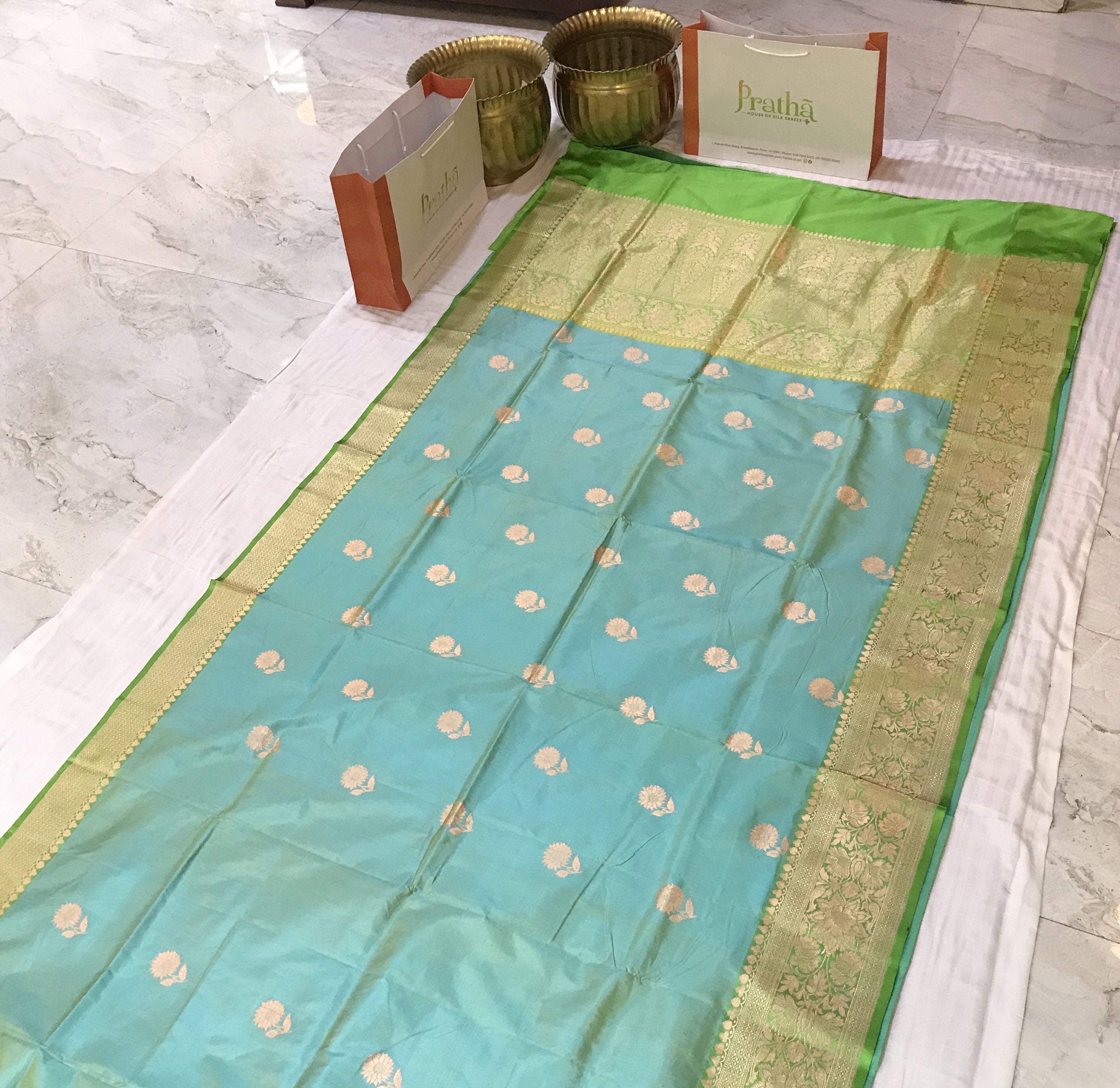 This saree in a stunning shade of pista-green with a fresh parrot green contrast border ' with an big floral design butti zari thread, is all set to steal hearts. Do not miss the border and pallu of this saree which have a beautiful design of golden zari, that's amazing. This kind of saree will look great on a bride or on any of your most special days!