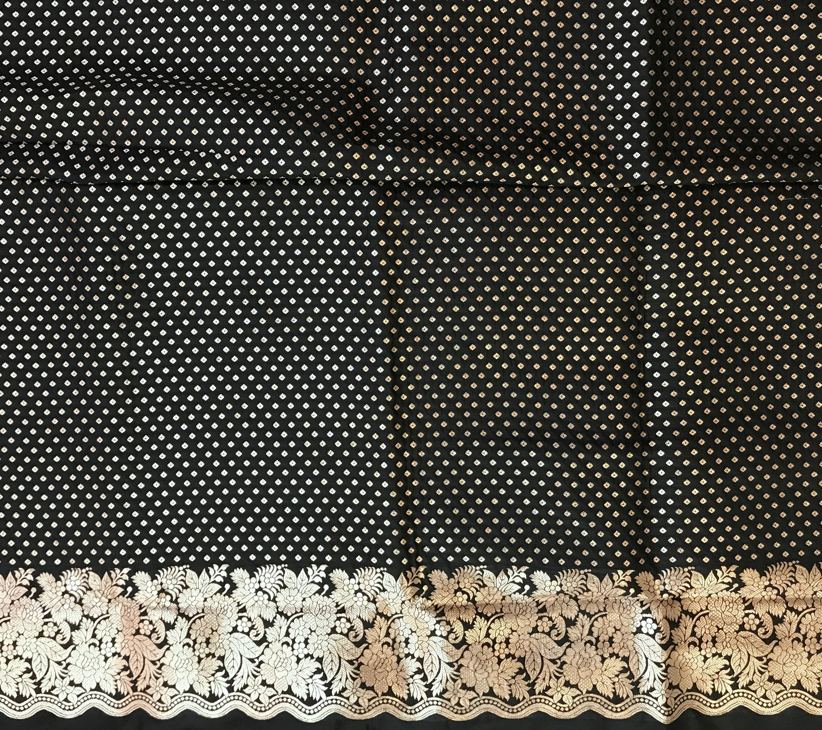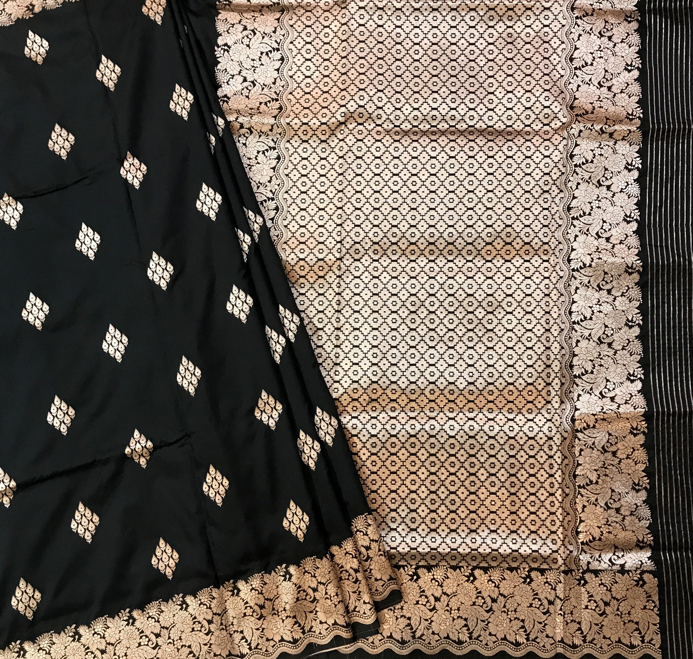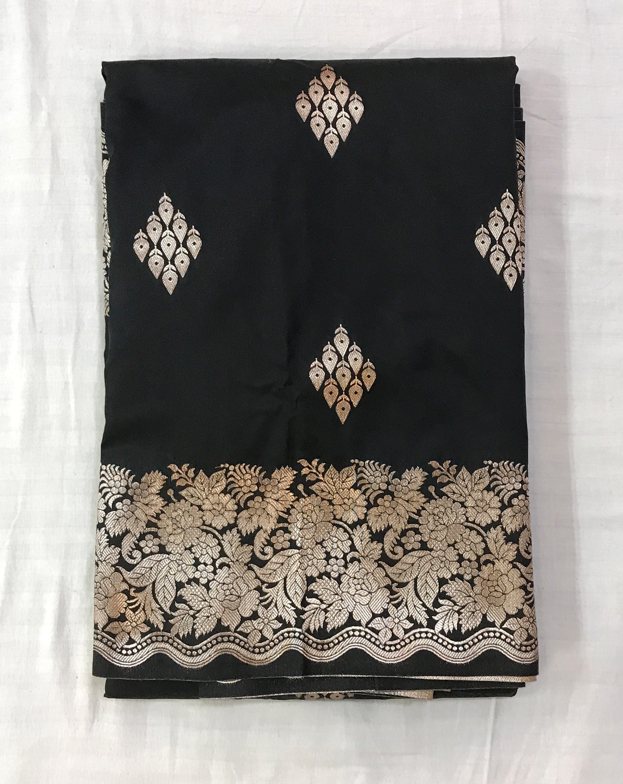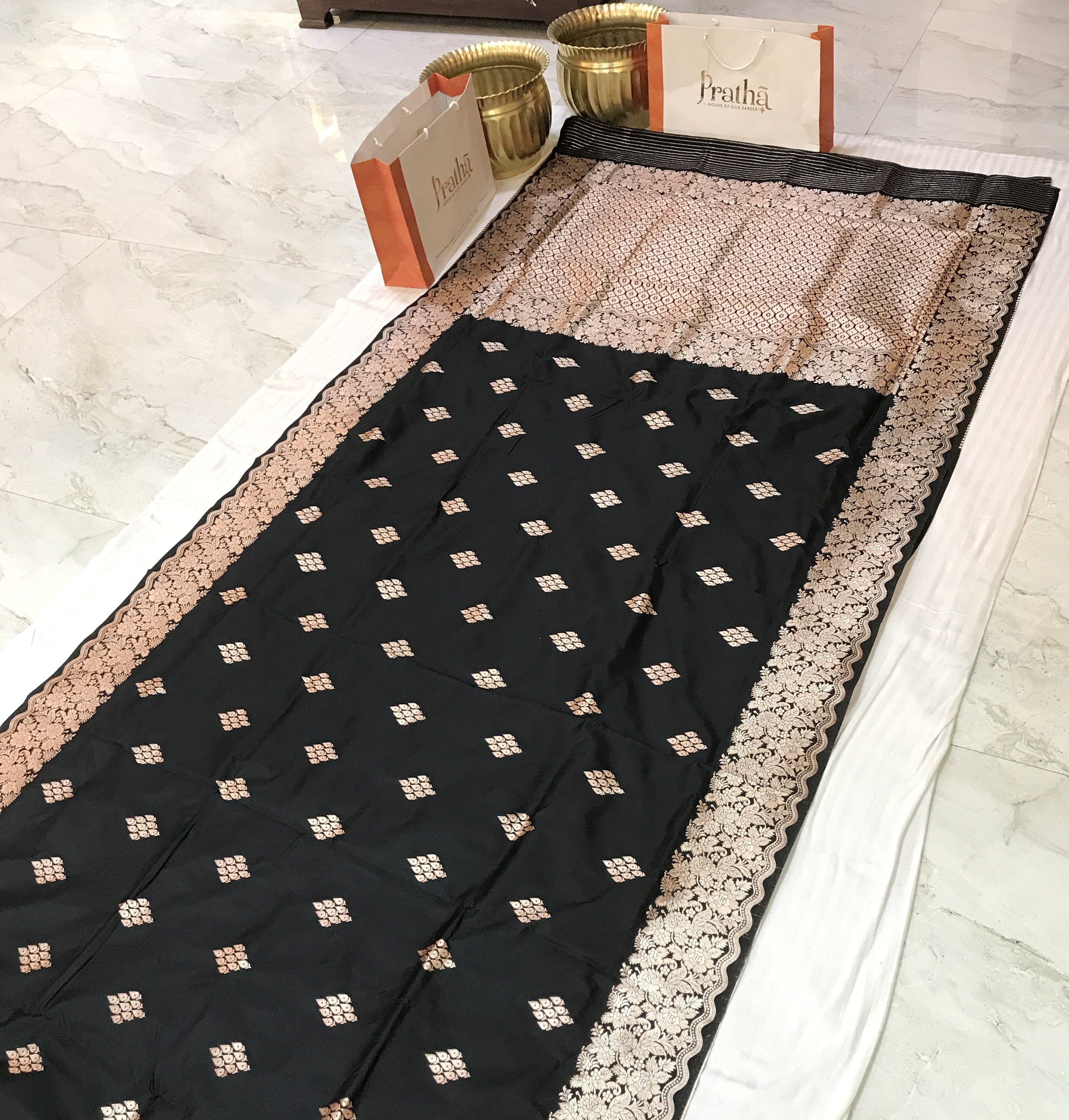 This Black Banasari saree exudes elegance and grace with its intricate weaving and delicate fabric. Crafted with precision, it showcases a mesmerizing blend of traditional Banarasi motifs on lightweight, creating a stunning drape that captivates attention. This saree embodies timeless beauty, making it a perfect choice for special occasions where sophistication meets tradition in a seamless fusion in black colour.