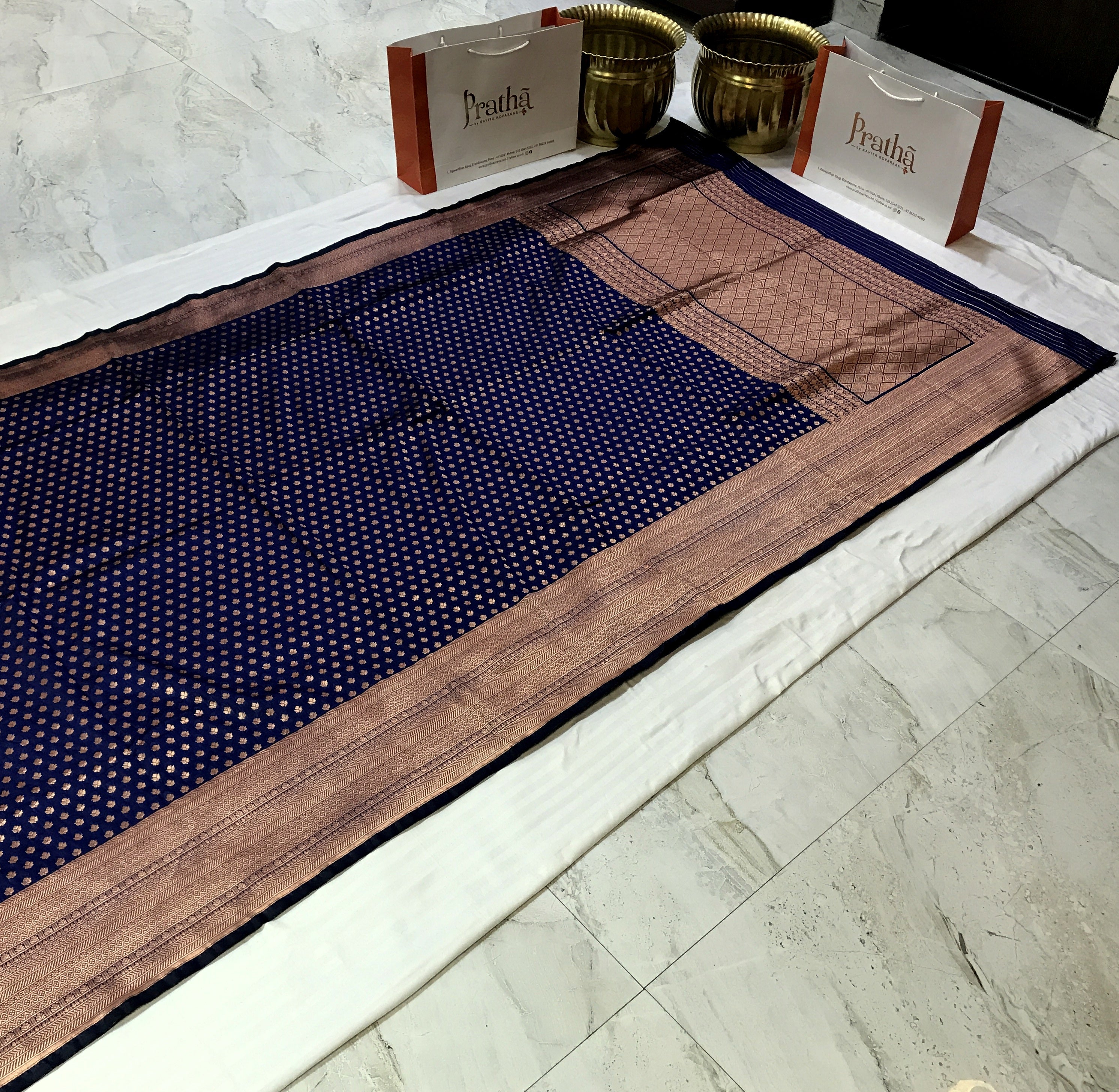 Single colour silk Banarasi saree with uncommon butti design and pallu by Pratha! These ravishing blue Banarasi silk saree with delicate butti highlighted copperish zari and stylish pallu patterns are a perfect pick for traditional occasion as well as party wear!