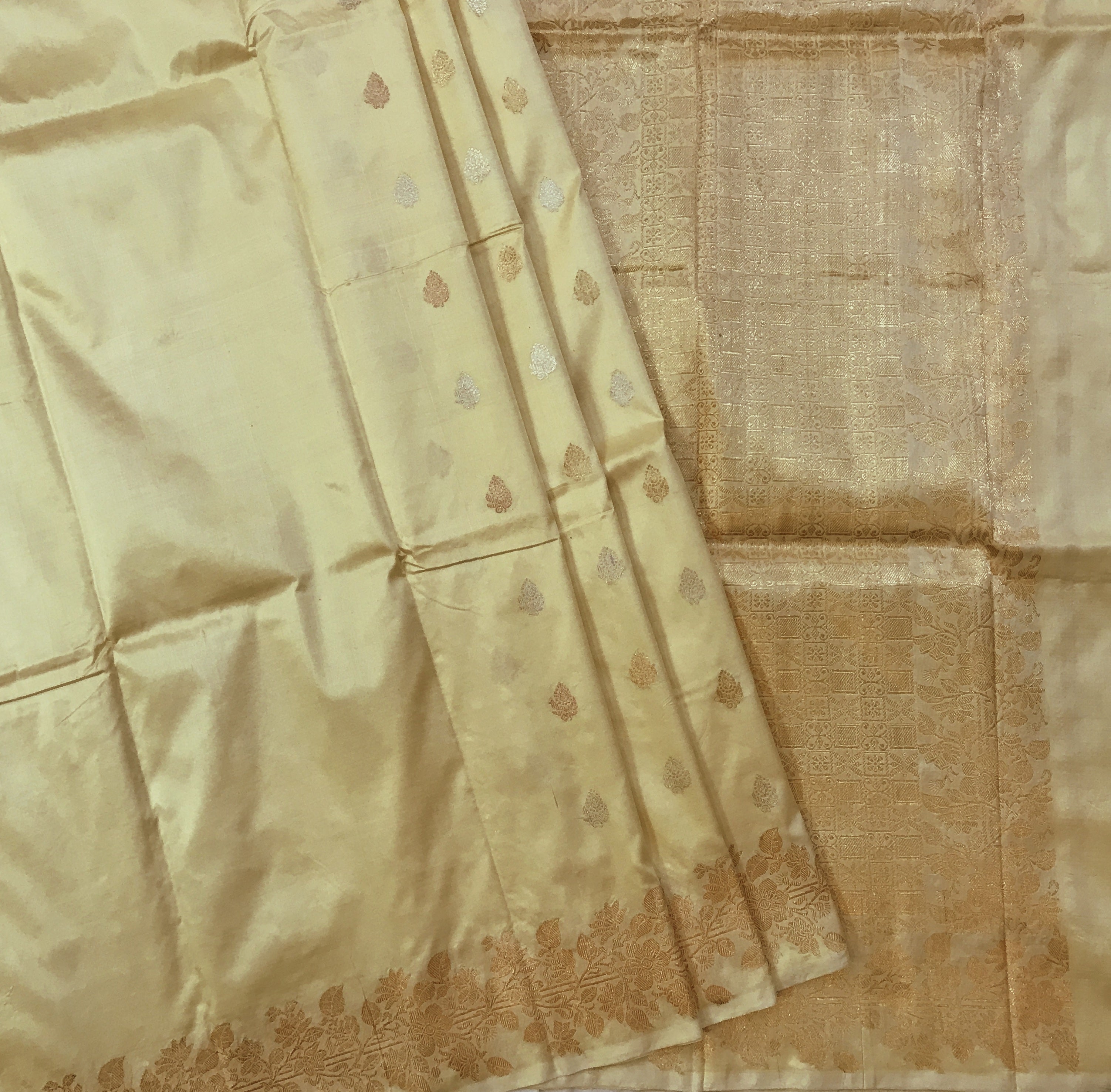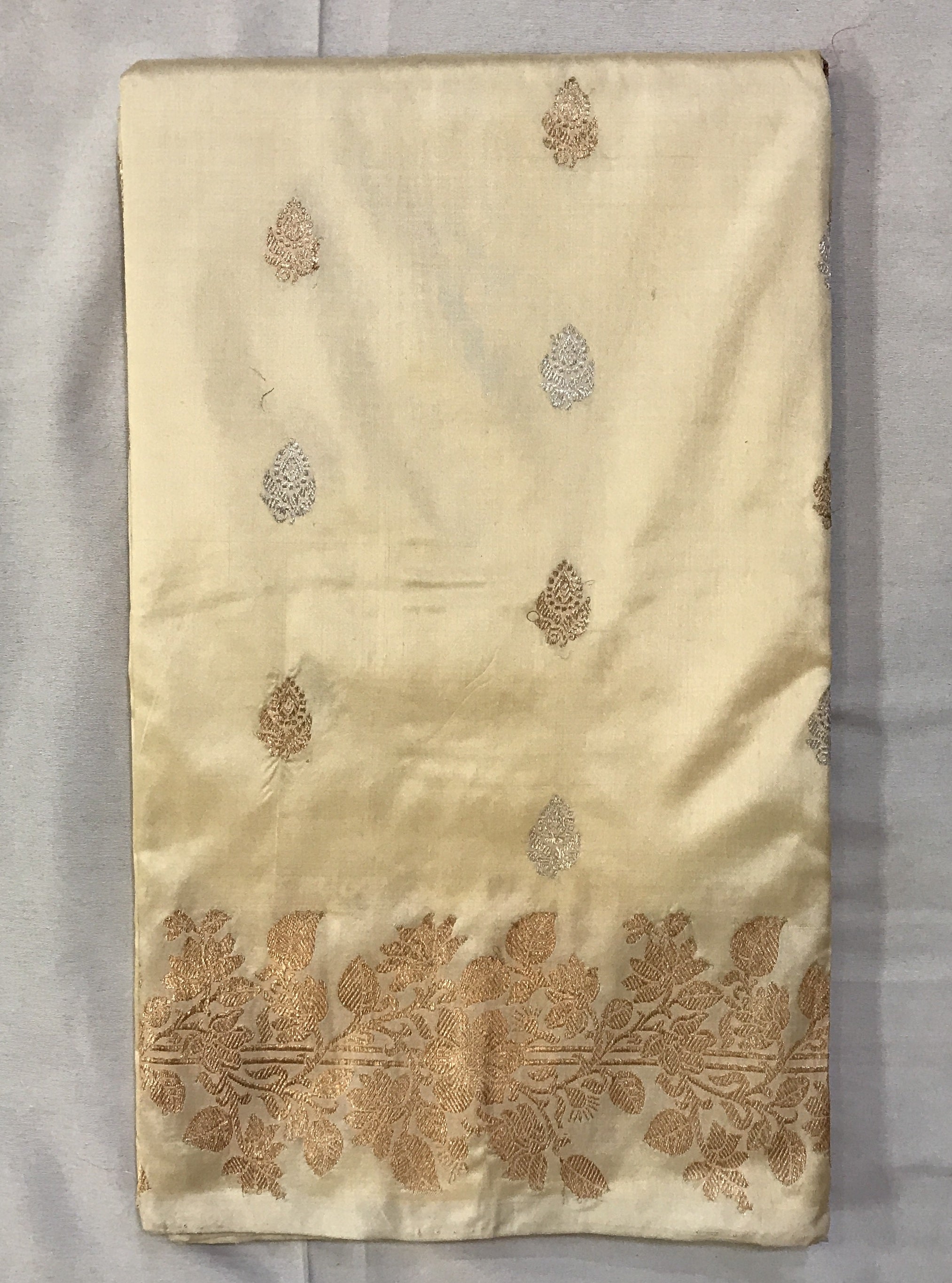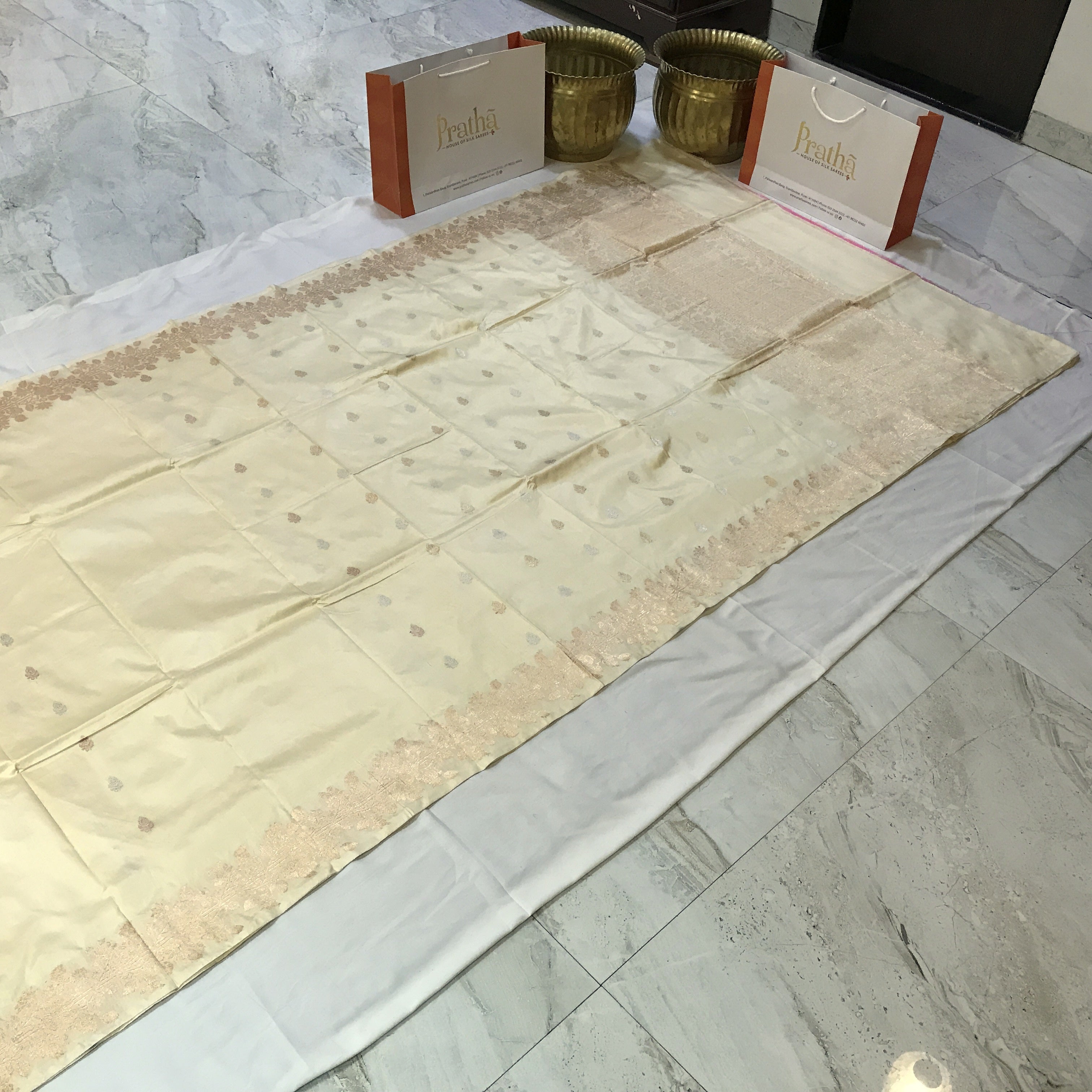 This Banarasi Silk saree, is a very new variety of Banarasi saree which is very unique and attractive. A fresh soothing off-white saree is a treat to the eyes! The lovely intricate small shaped motifs woven in golden and silver zari threads add to the grace of this weave. Do not miss that, this saree has a very beautiful intricate design border and pallu which looks great! For those who are on the lookout for something different, this one is just for you!