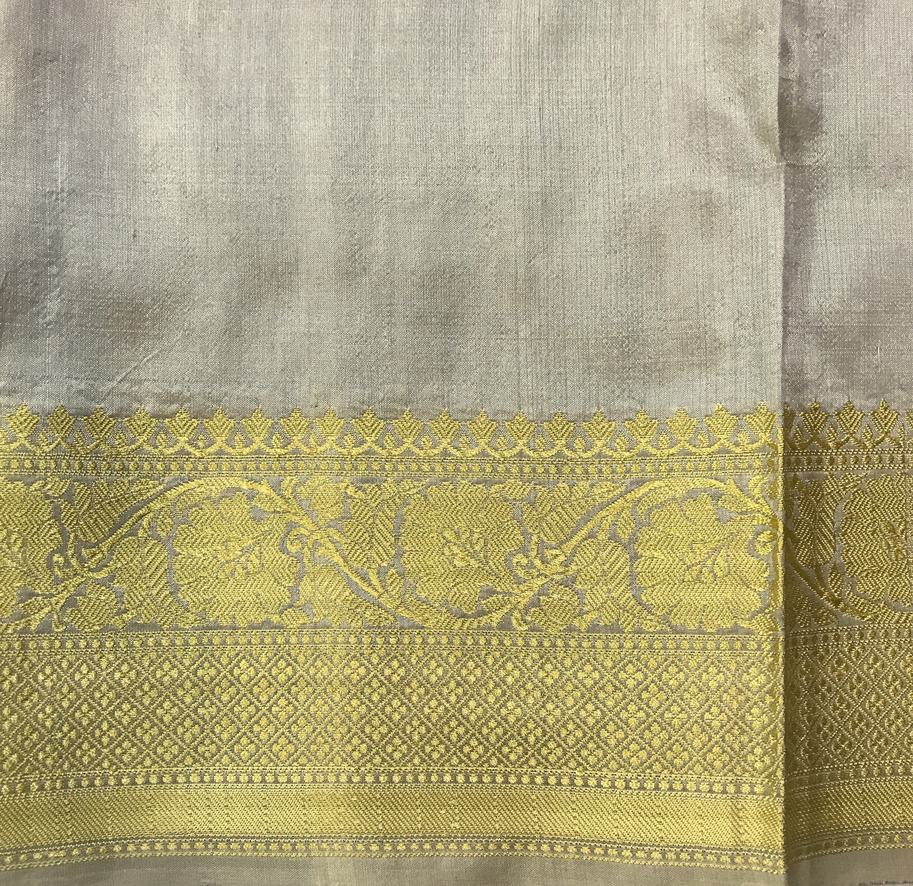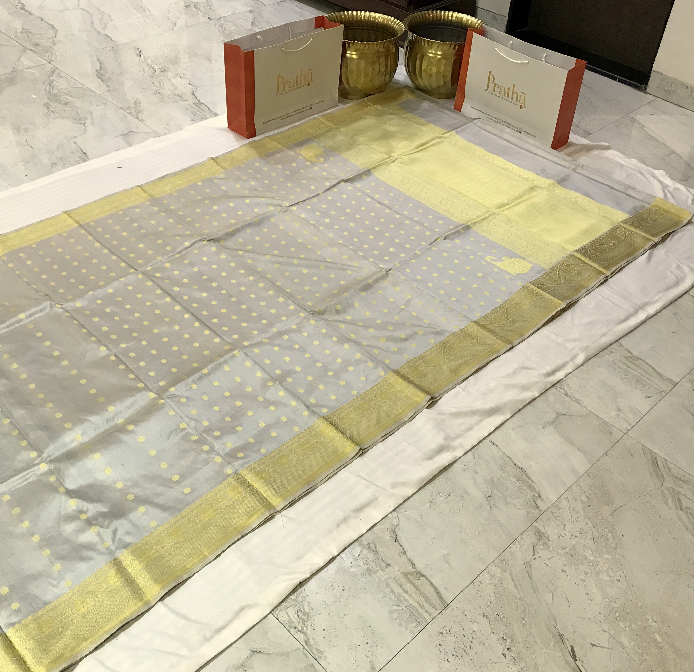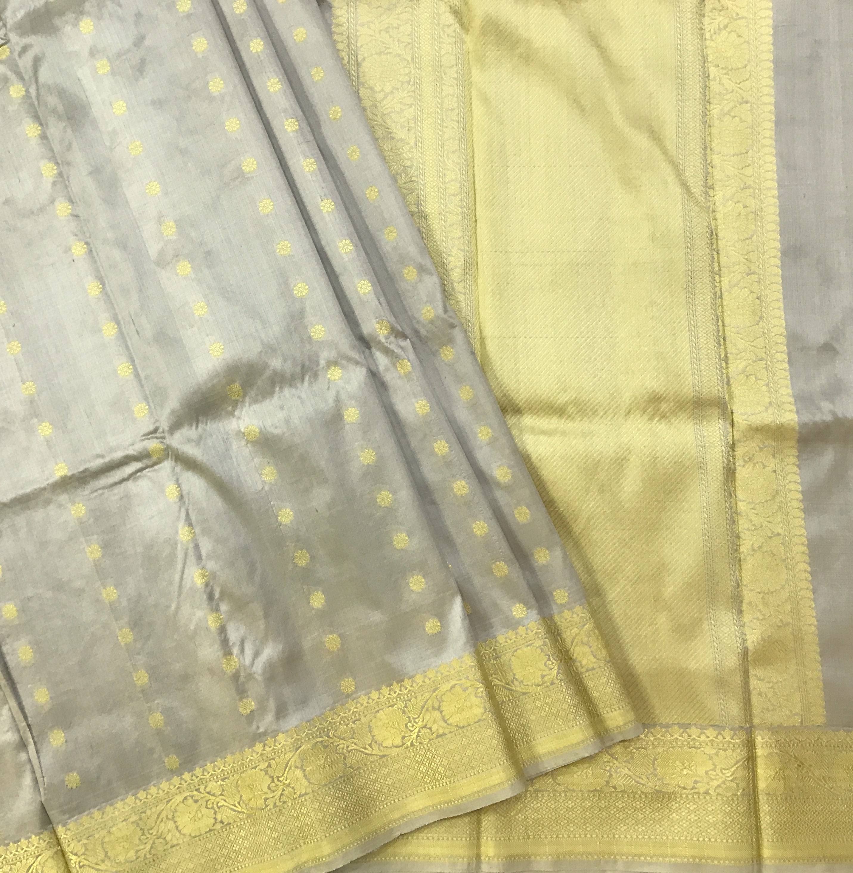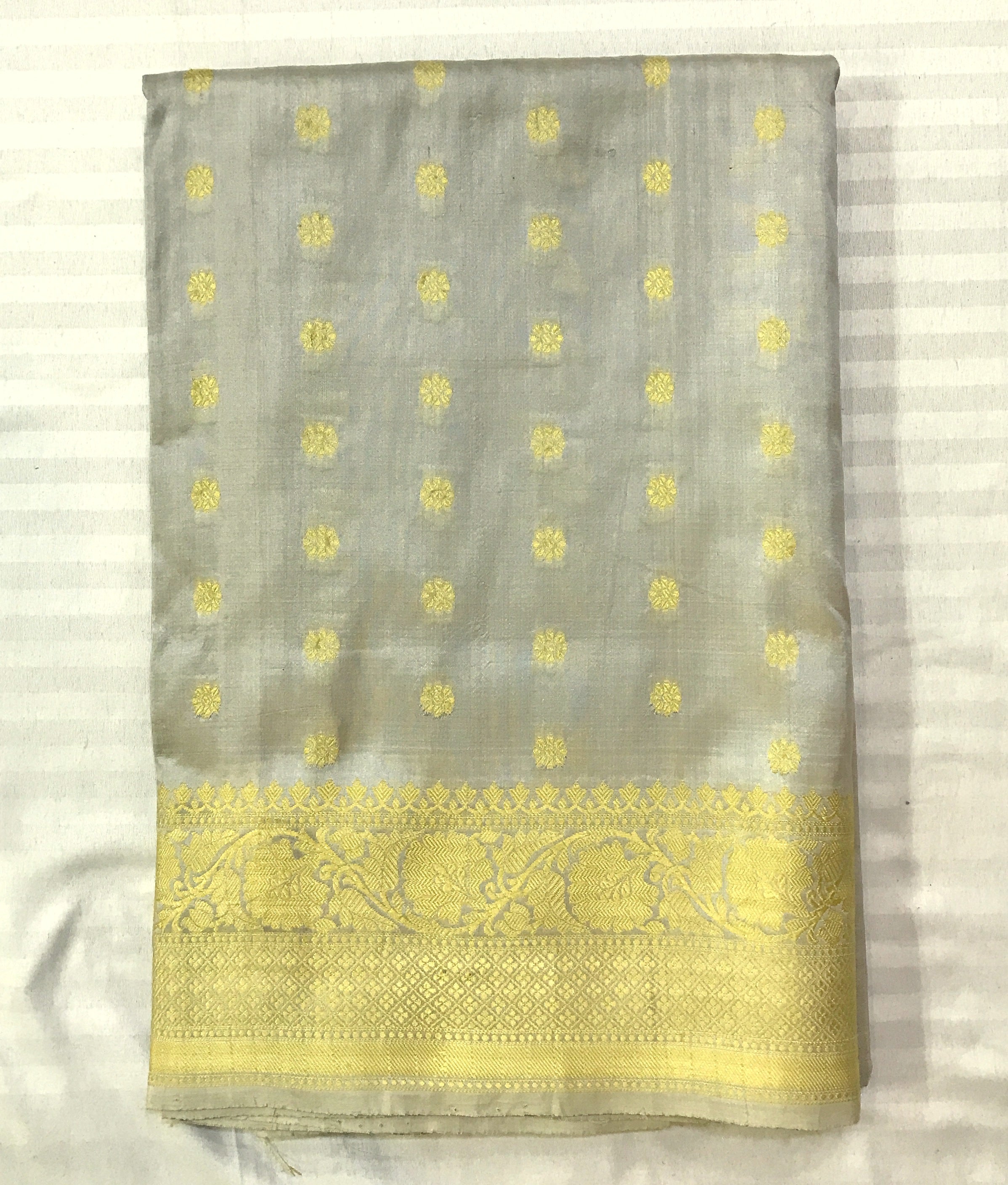 A very lovely and uncommon mix shade grey-beige Banarasi with a nice traditional border looks great! This saree is light weight and easy to wear at any function, meetings and parties. Do not miss the delicate floral butti and pallu all over the saree woven in reshim thread! This is simply beautiful.