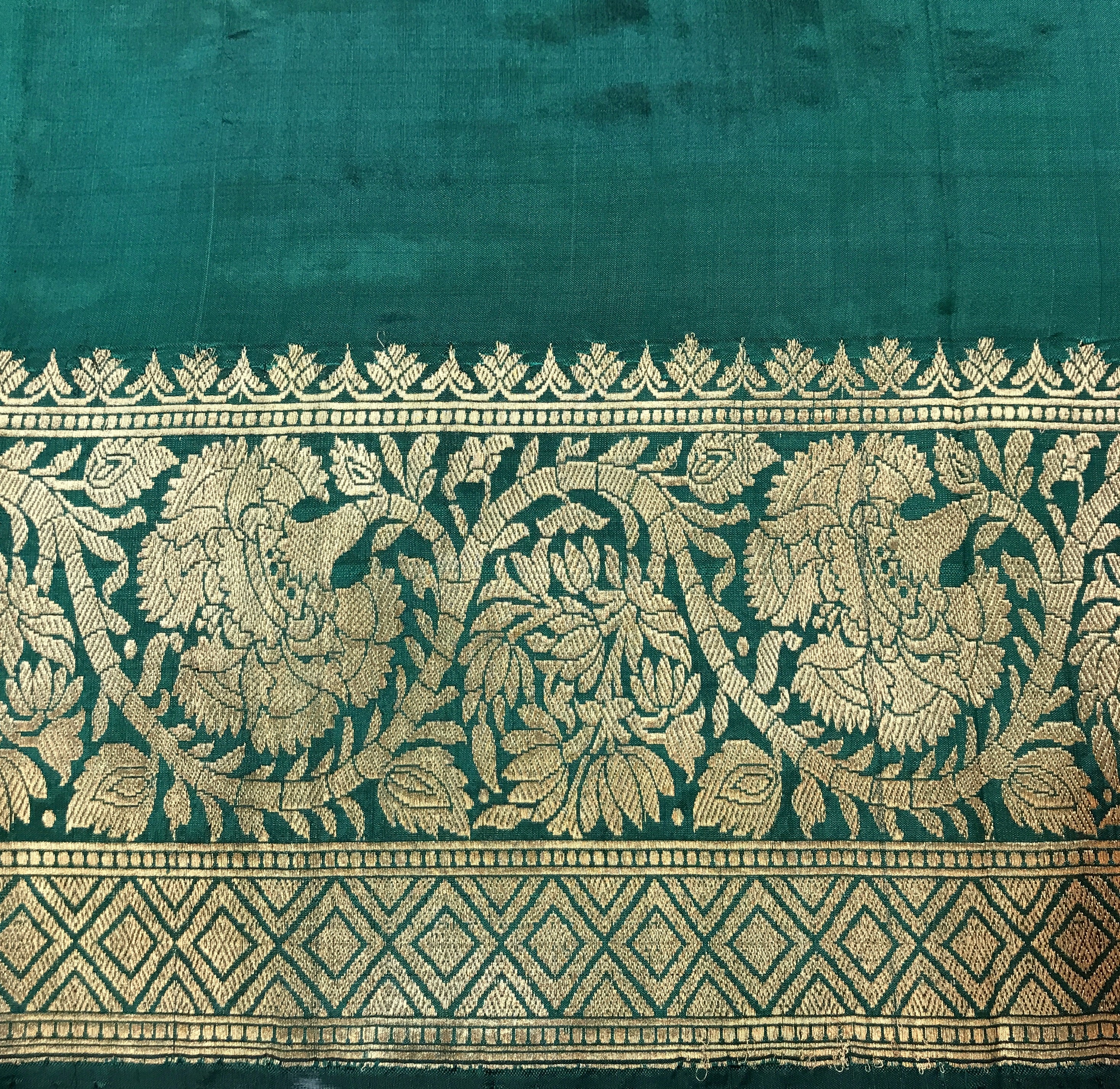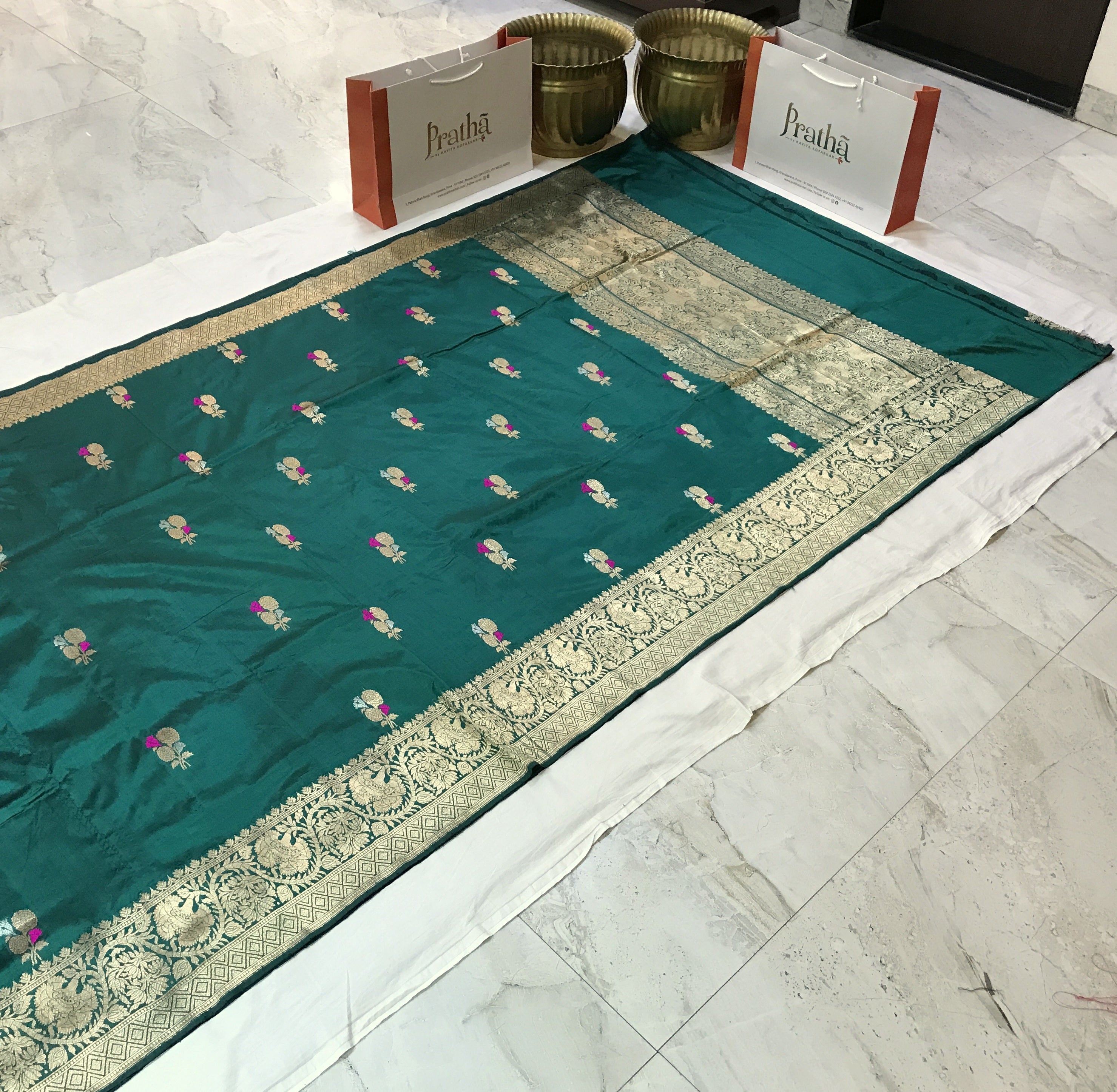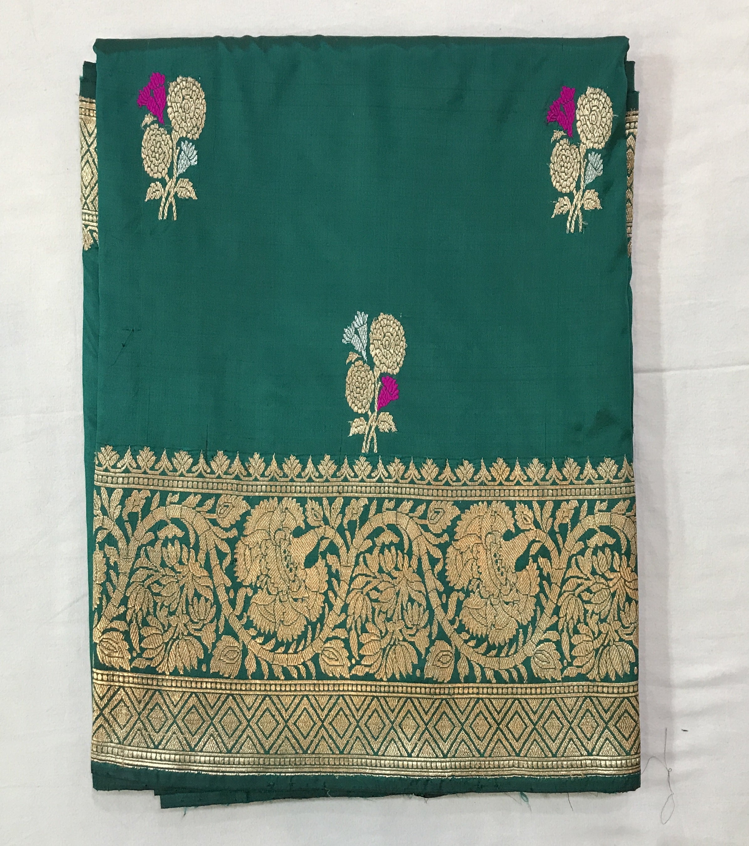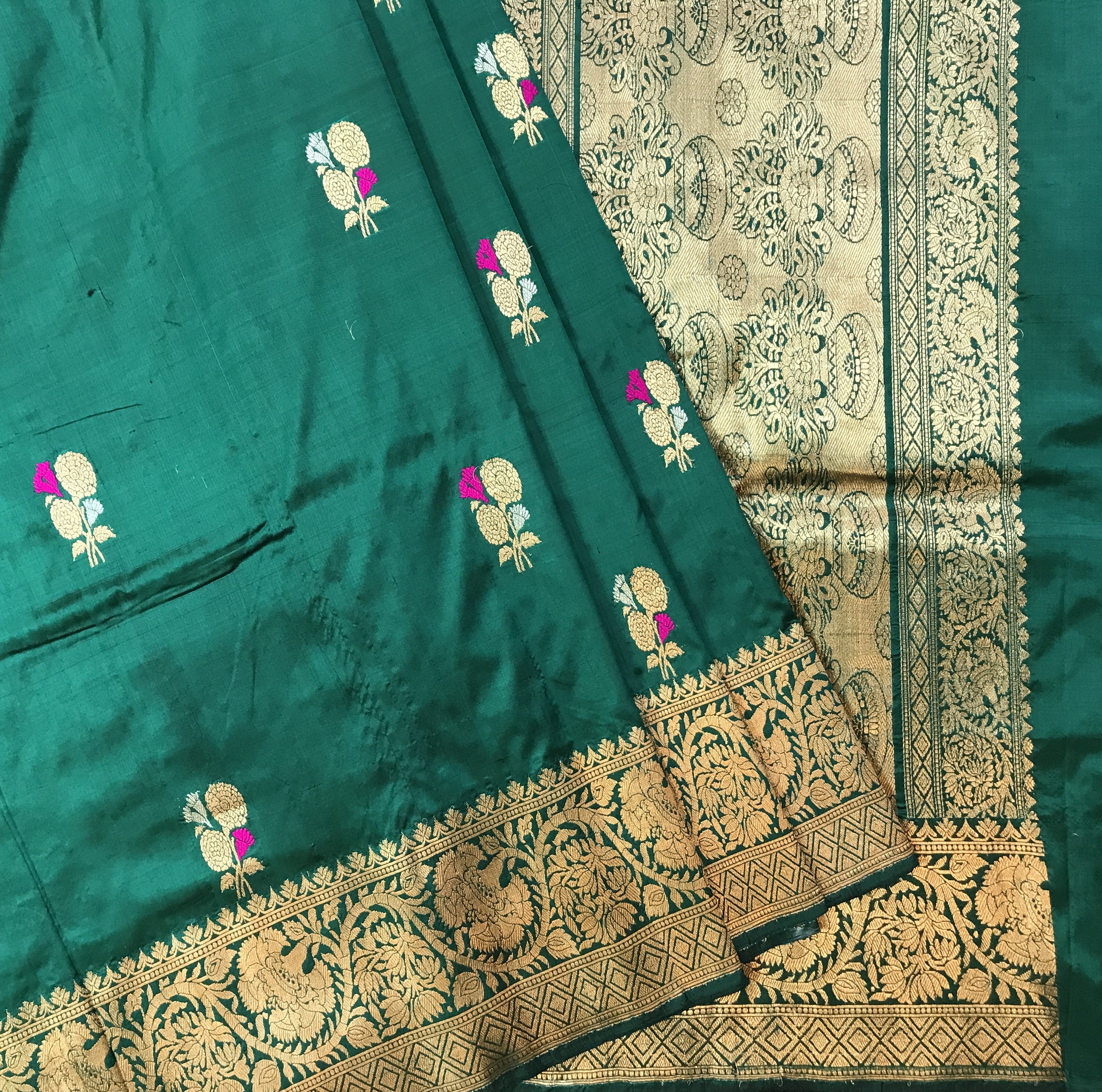 A saree in the tones deep green body and intricate zari border, sets a festive vibe. This is a traditional Banarasi, with floral butti highlighted pink silk thread and intricate broad design floral border. This is extremely light in weight and soft which makes it easy t drape and carry, perfect for occasions.