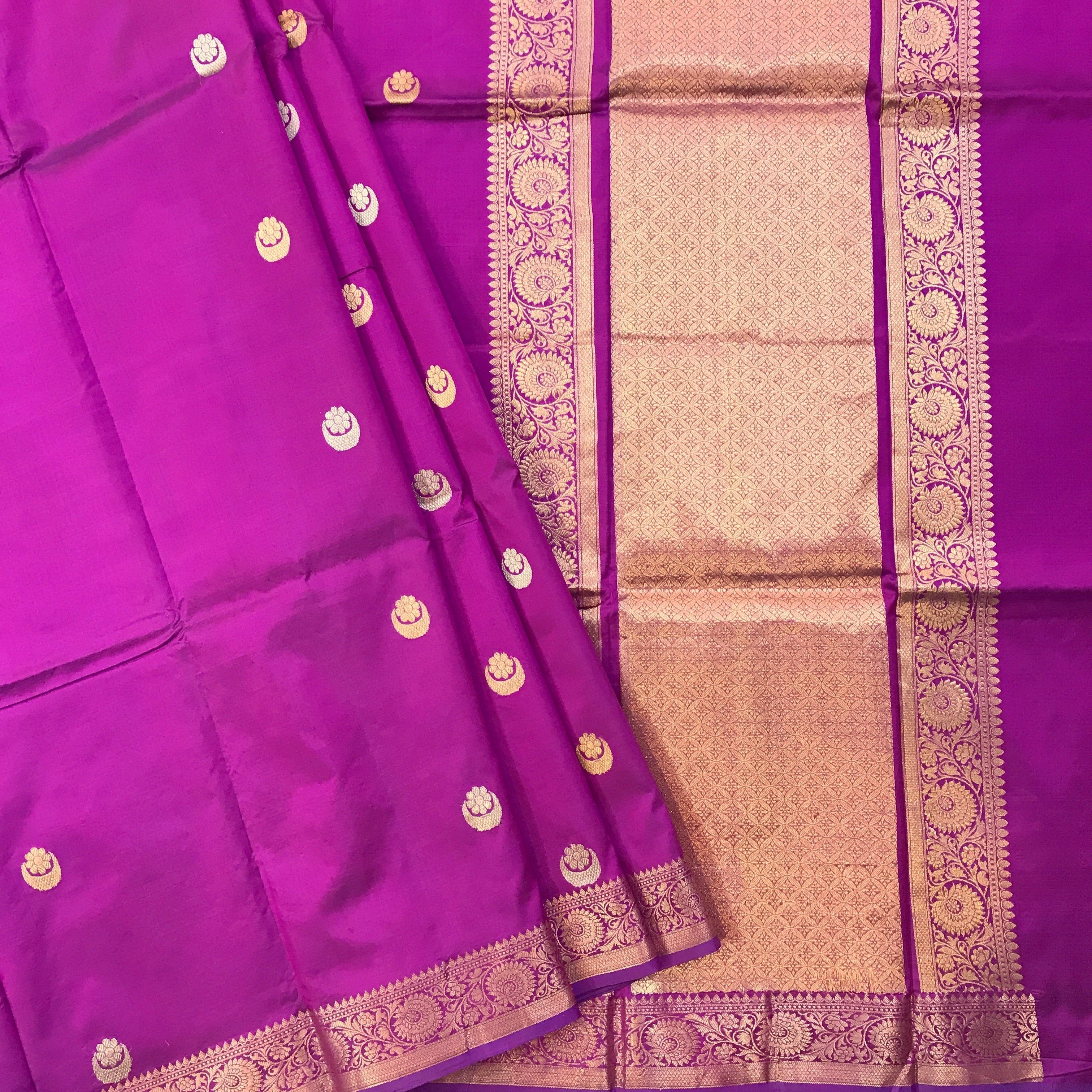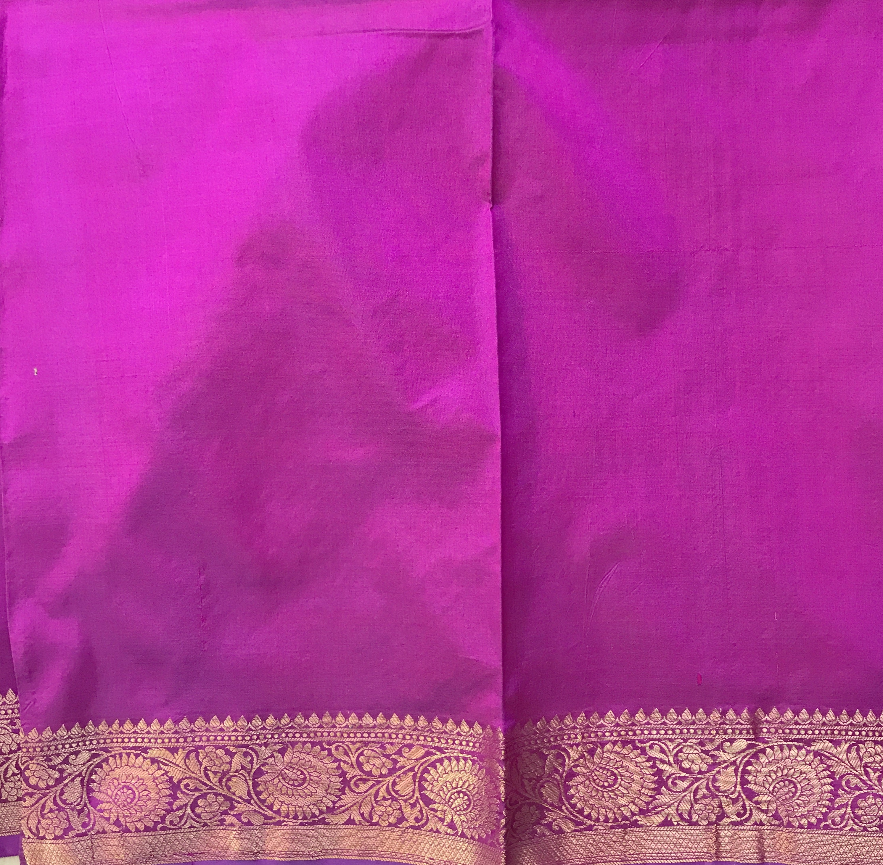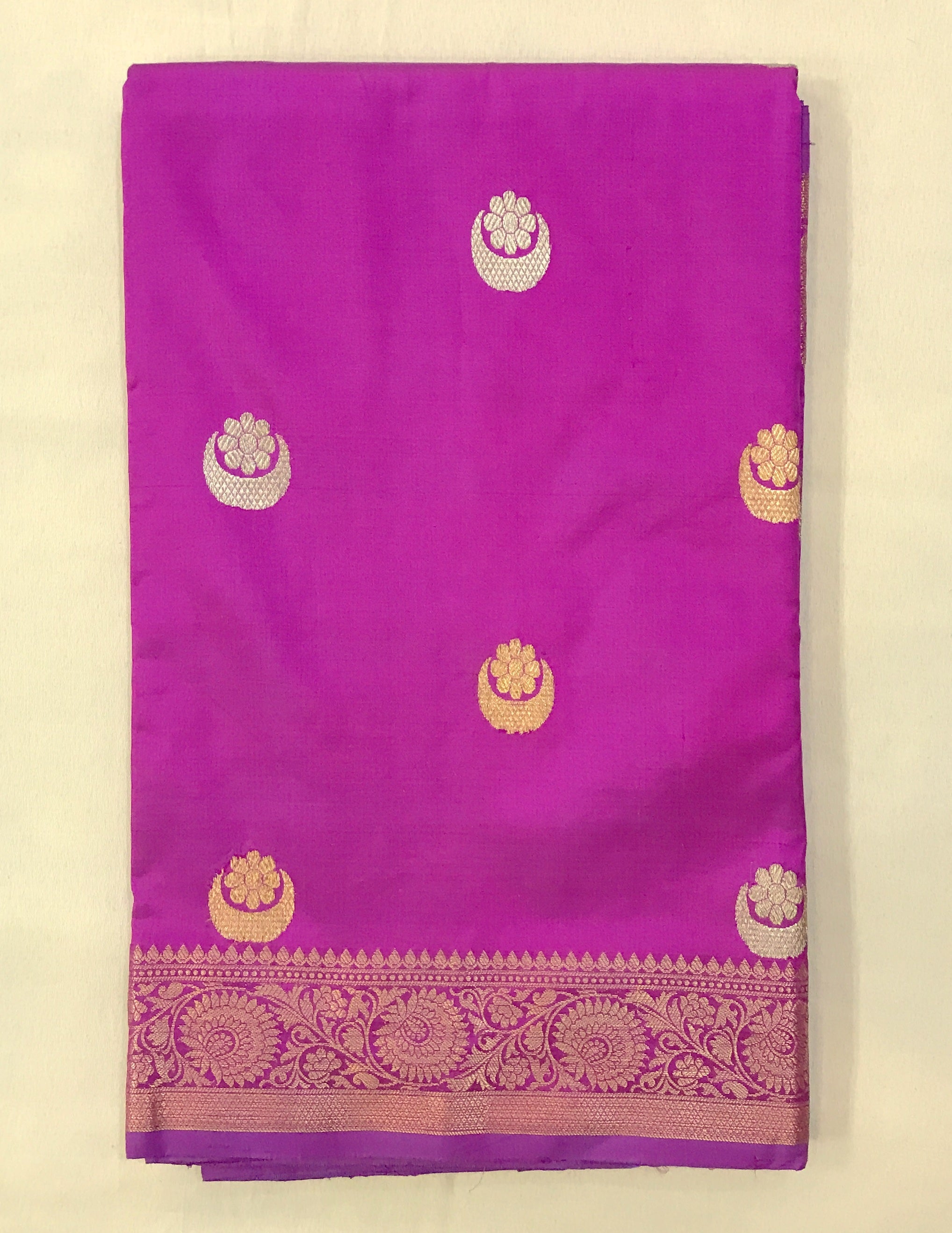 This Banarasi Silk saree, is a very new variety of Banarasi saree which is very attractive. A fresh soothing magenta-purple saree is a treat to the eyes! The lovely intricate unique shaped motifs woven in golden zari threads add to the grace of this weave. Do not miss that, this saree has a very beautiful intricate design border and pallu which looks great! For those who are on the lookout for something different, this one is just for you!