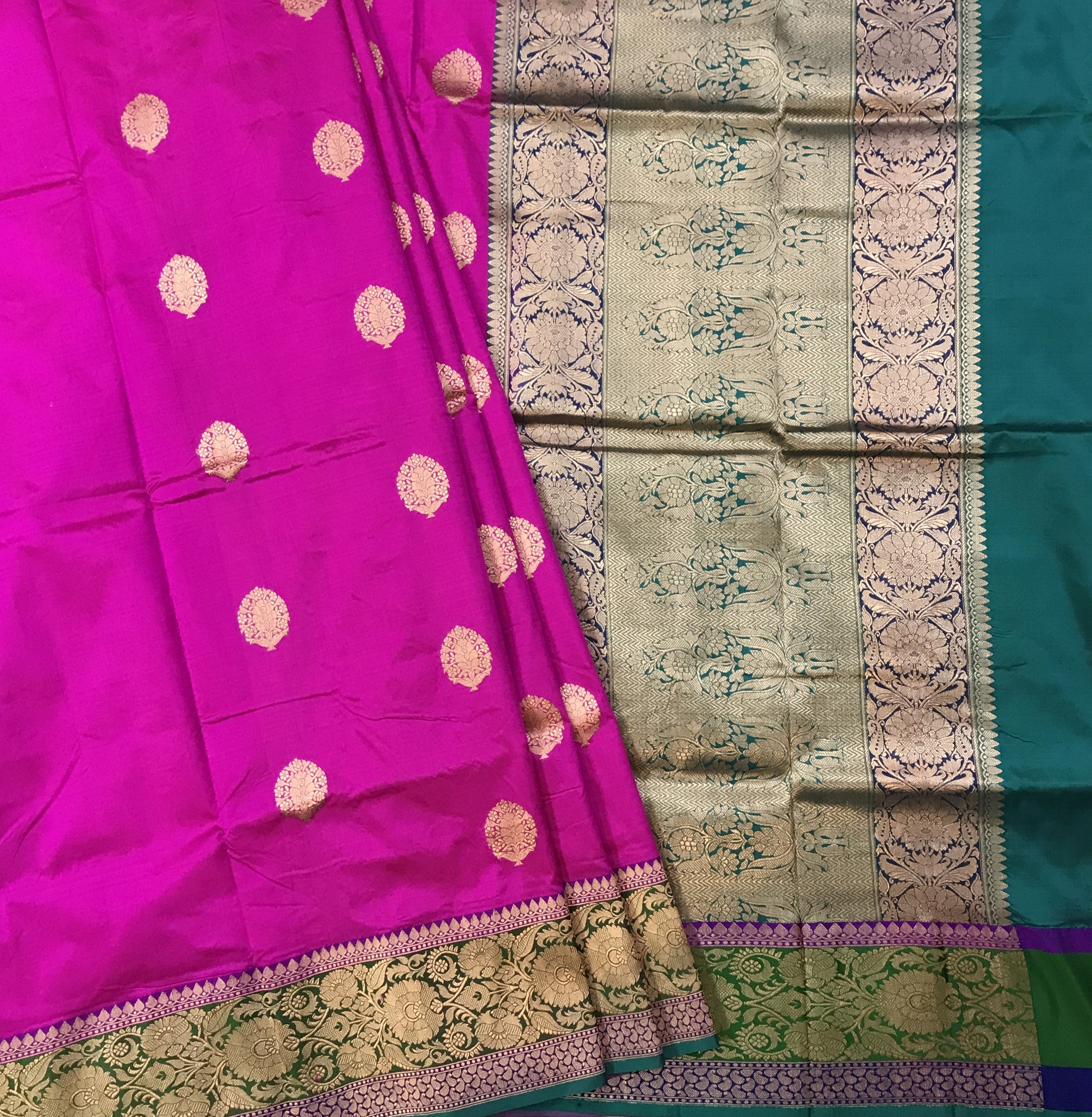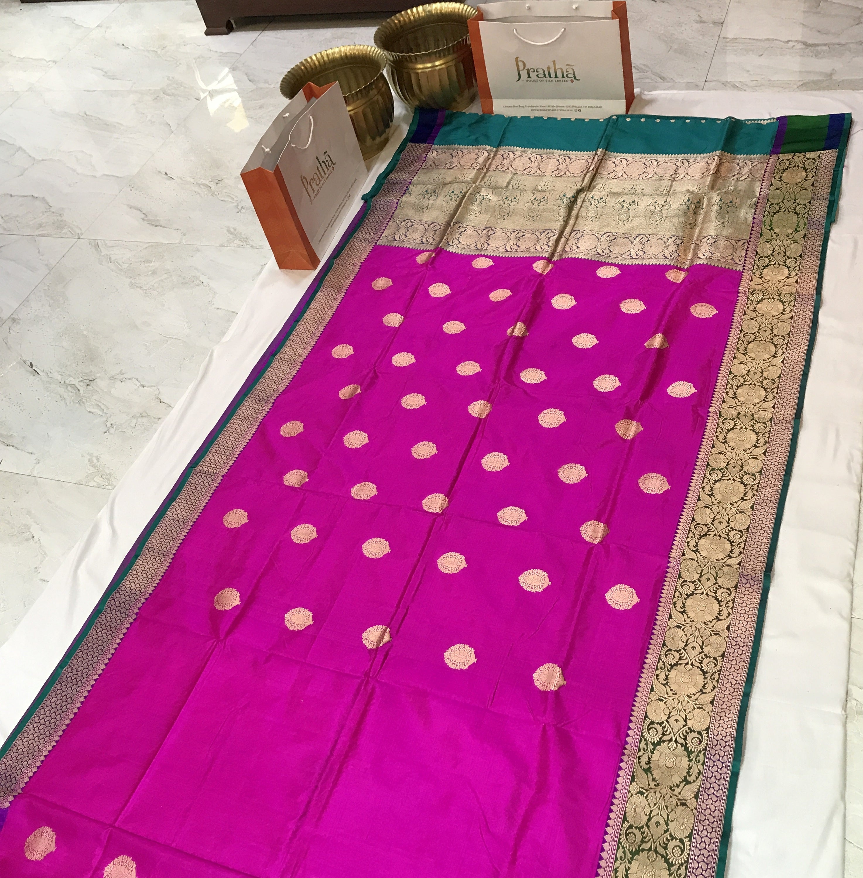 A very gorgeous shade of Pink Banarasi with nice green traditional border looks great! For the love of unusual colours, this Banarasi saree is definitely going to win your heart. This saree will look soothing and beautiful when draped! The golden zari border and pallu stands true to the Banarasi culture of saree weaving.