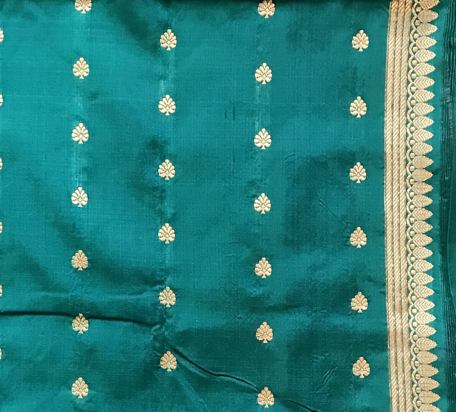 Blouse Colour: Contrast ( Teal green with butti design and intricate design zari border )